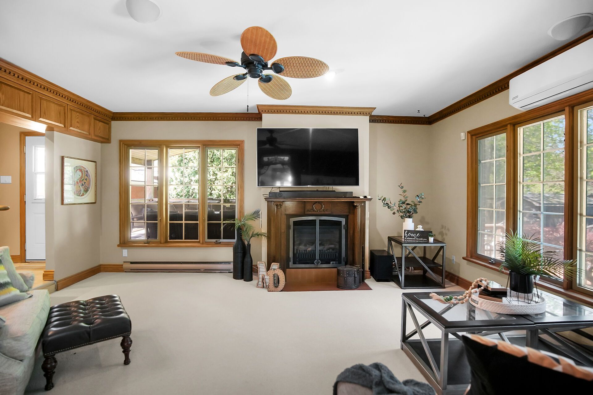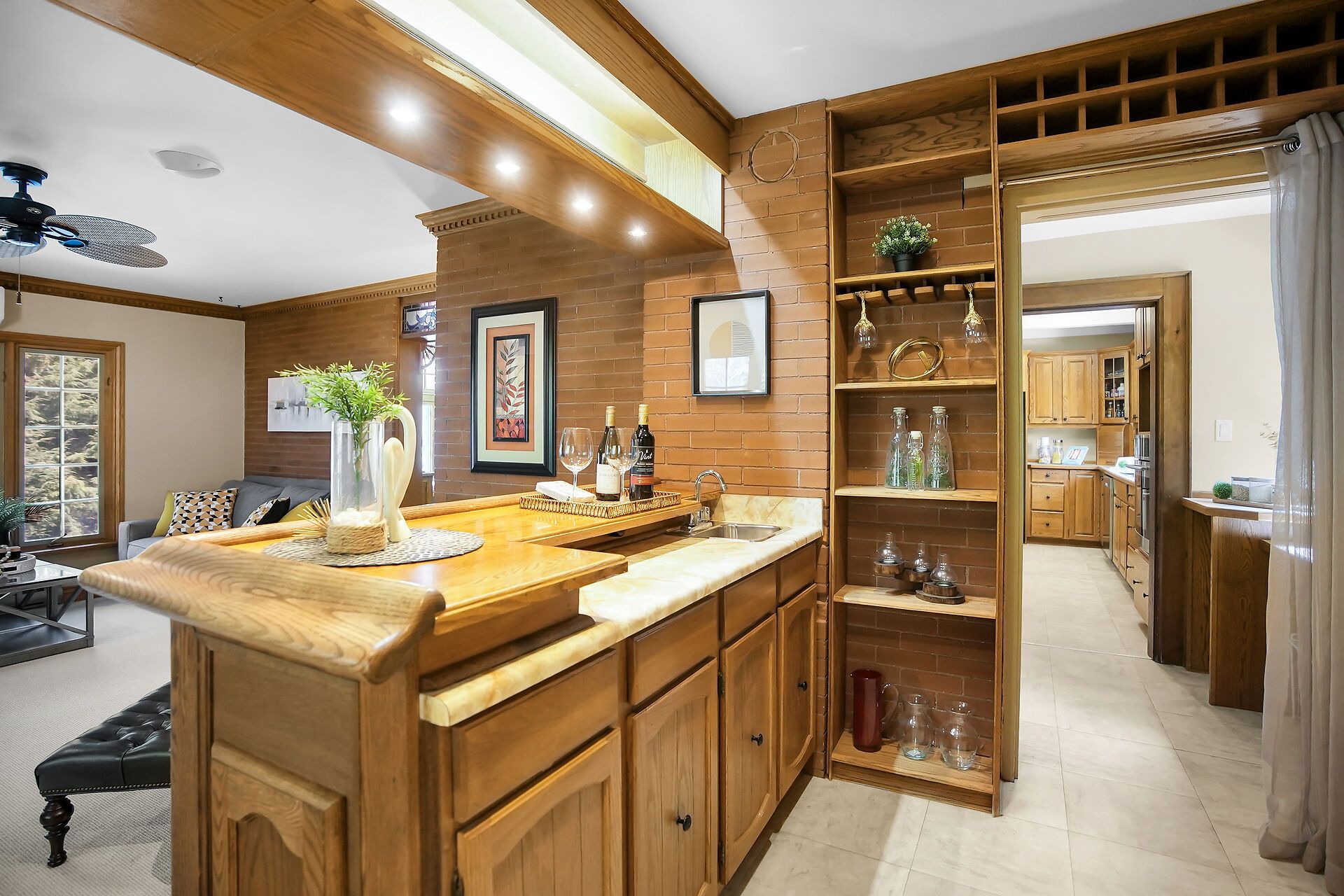 • Cozy family room with gas fireplace and custom Oak wet bar.