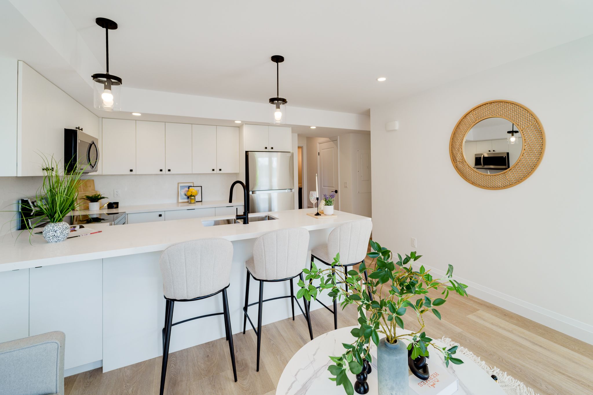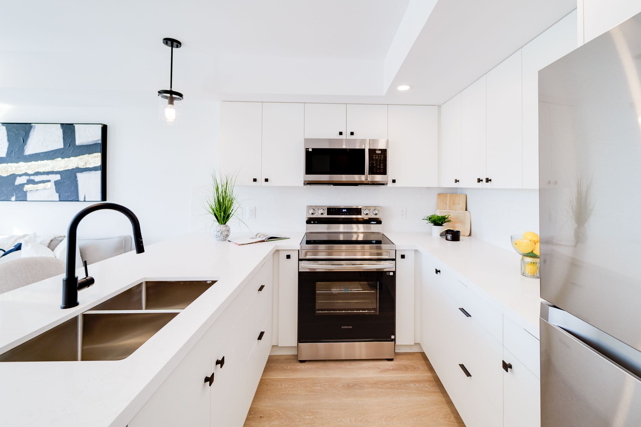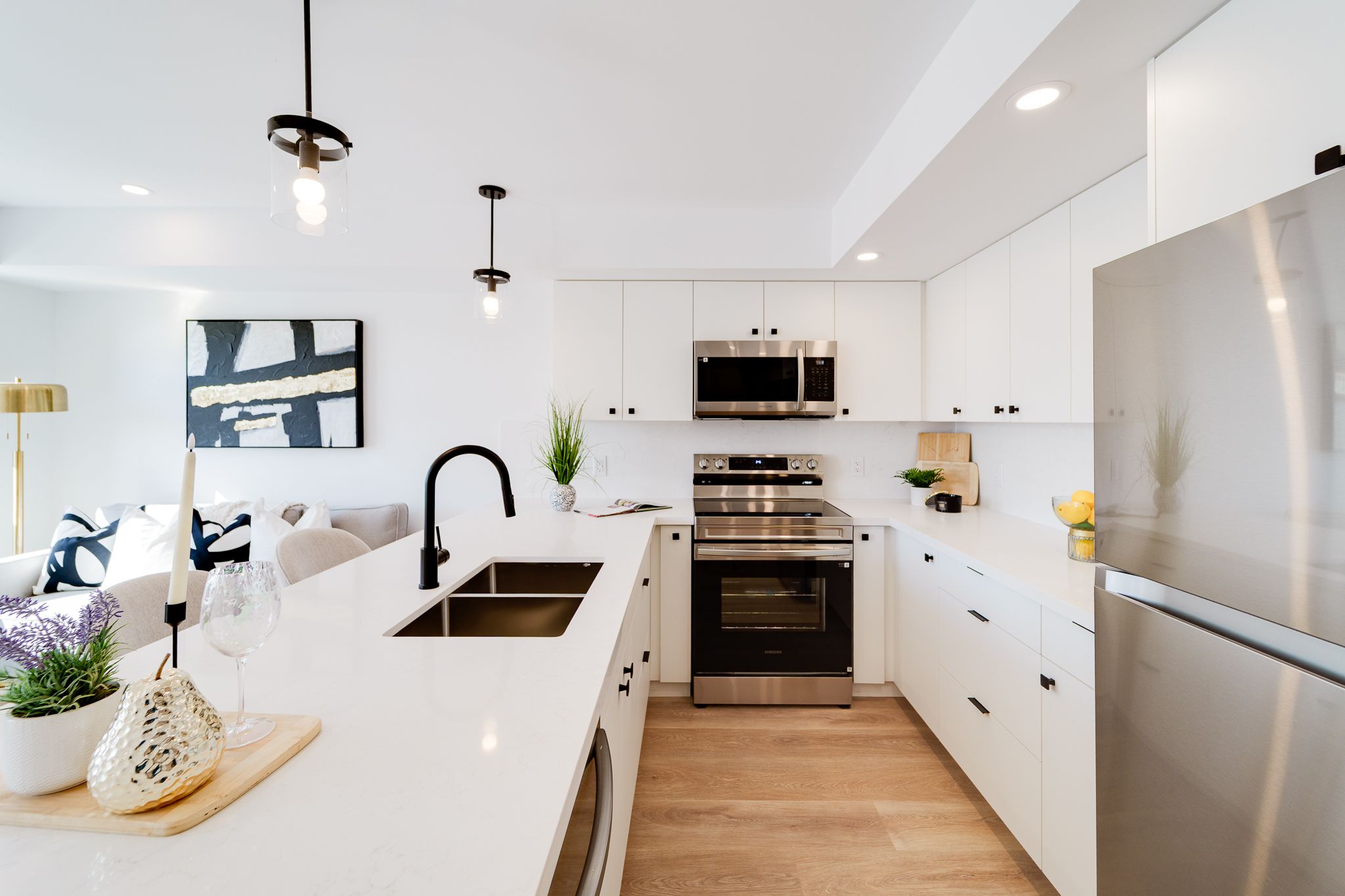 • Stylish kitchen with quartz countertops and stainless steel appliances.
