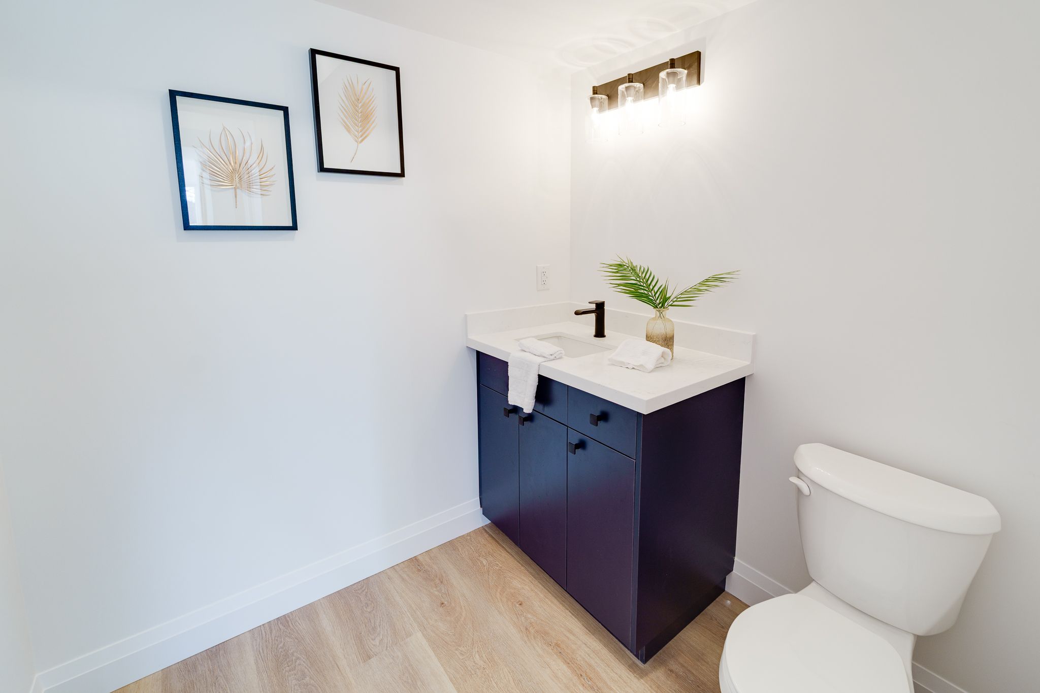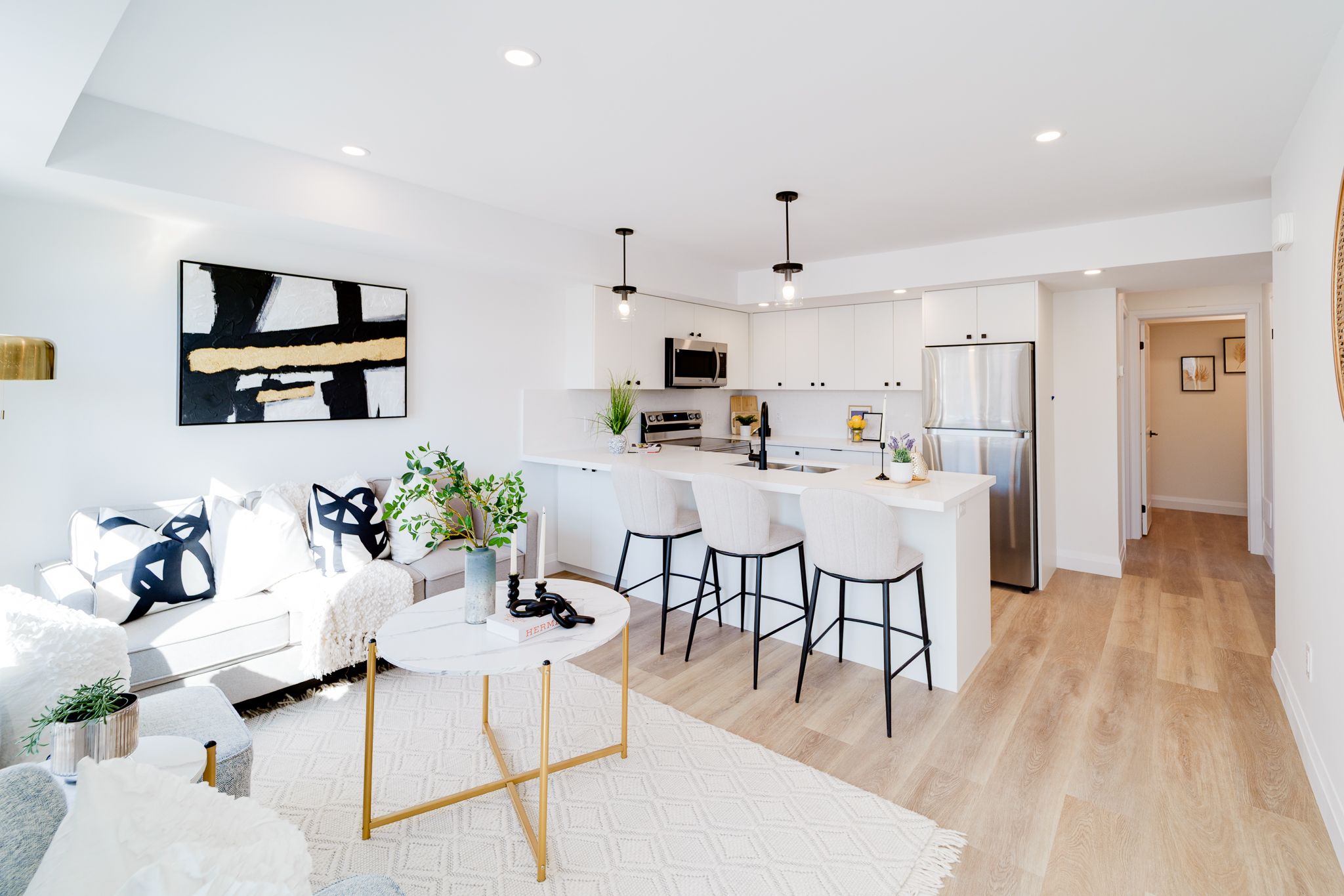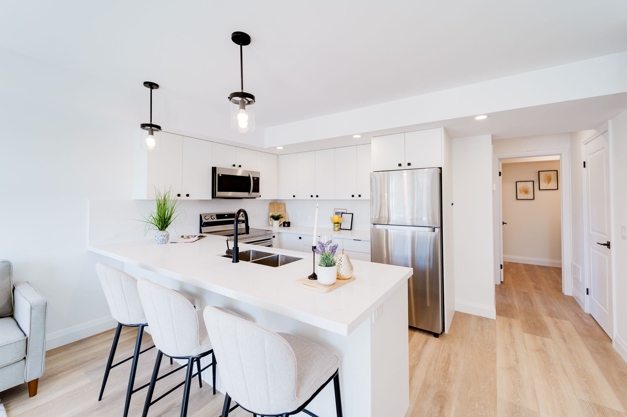 • Stylish kitchen with quartz countertops and stainless steel appliances.