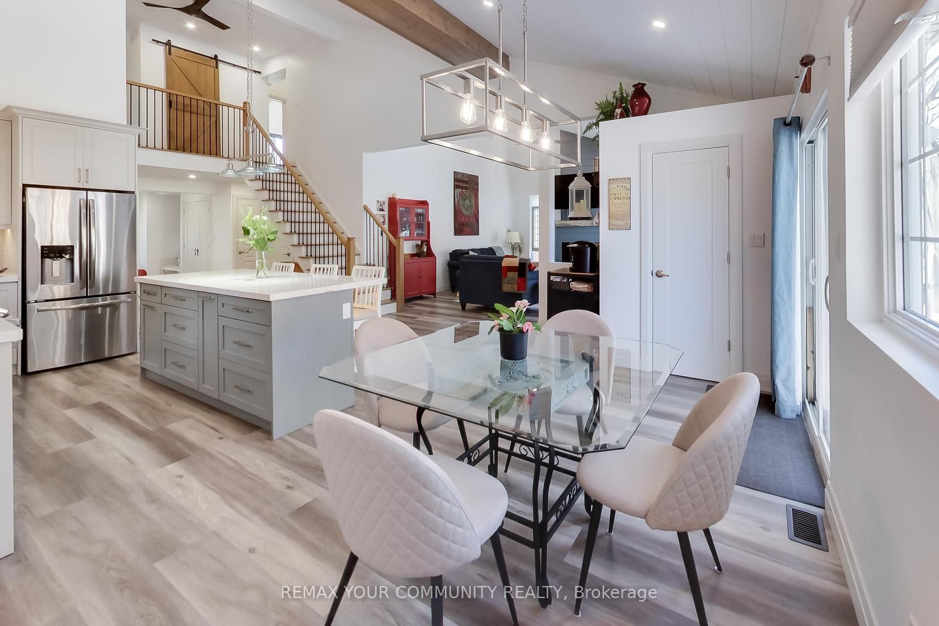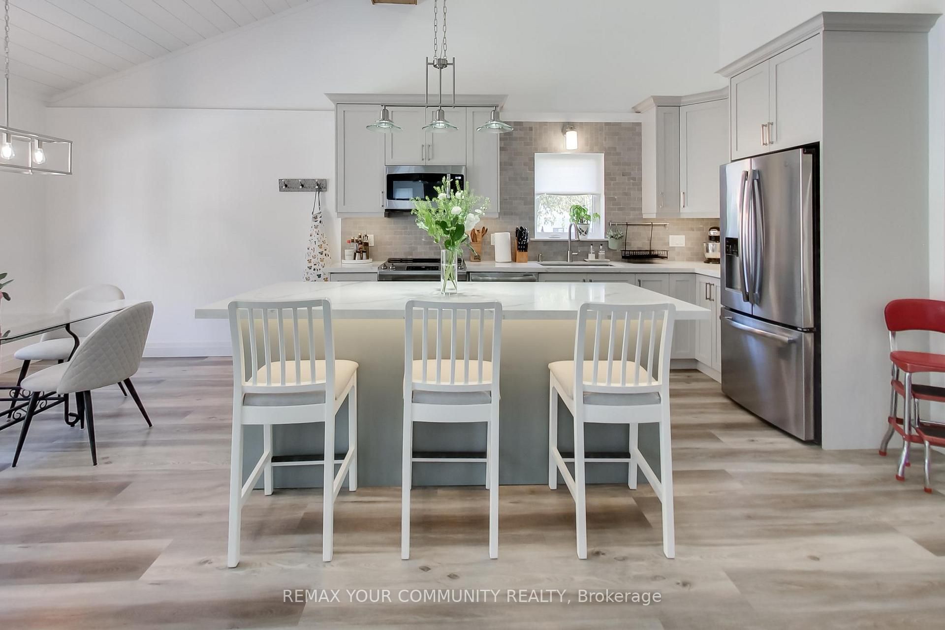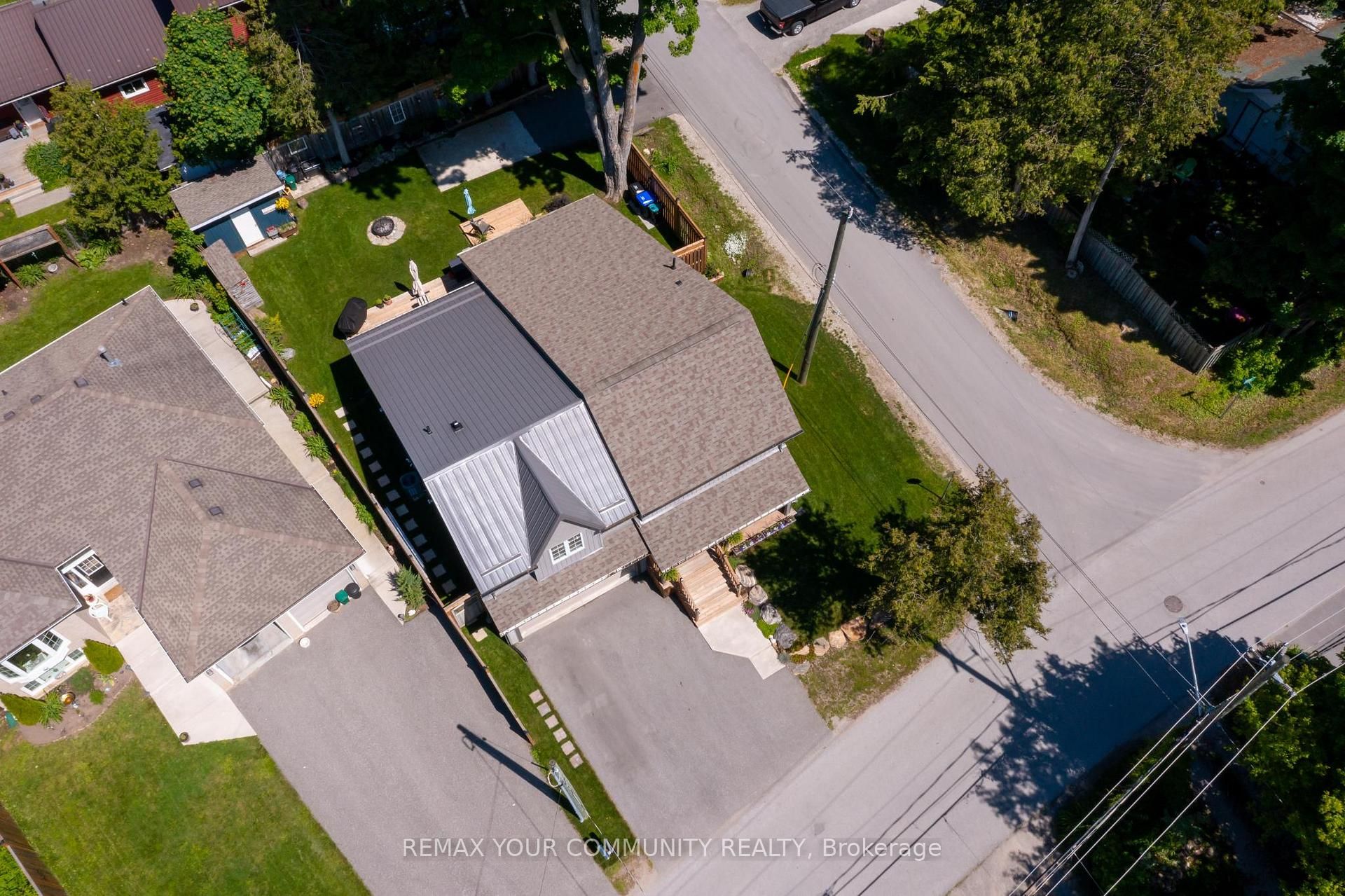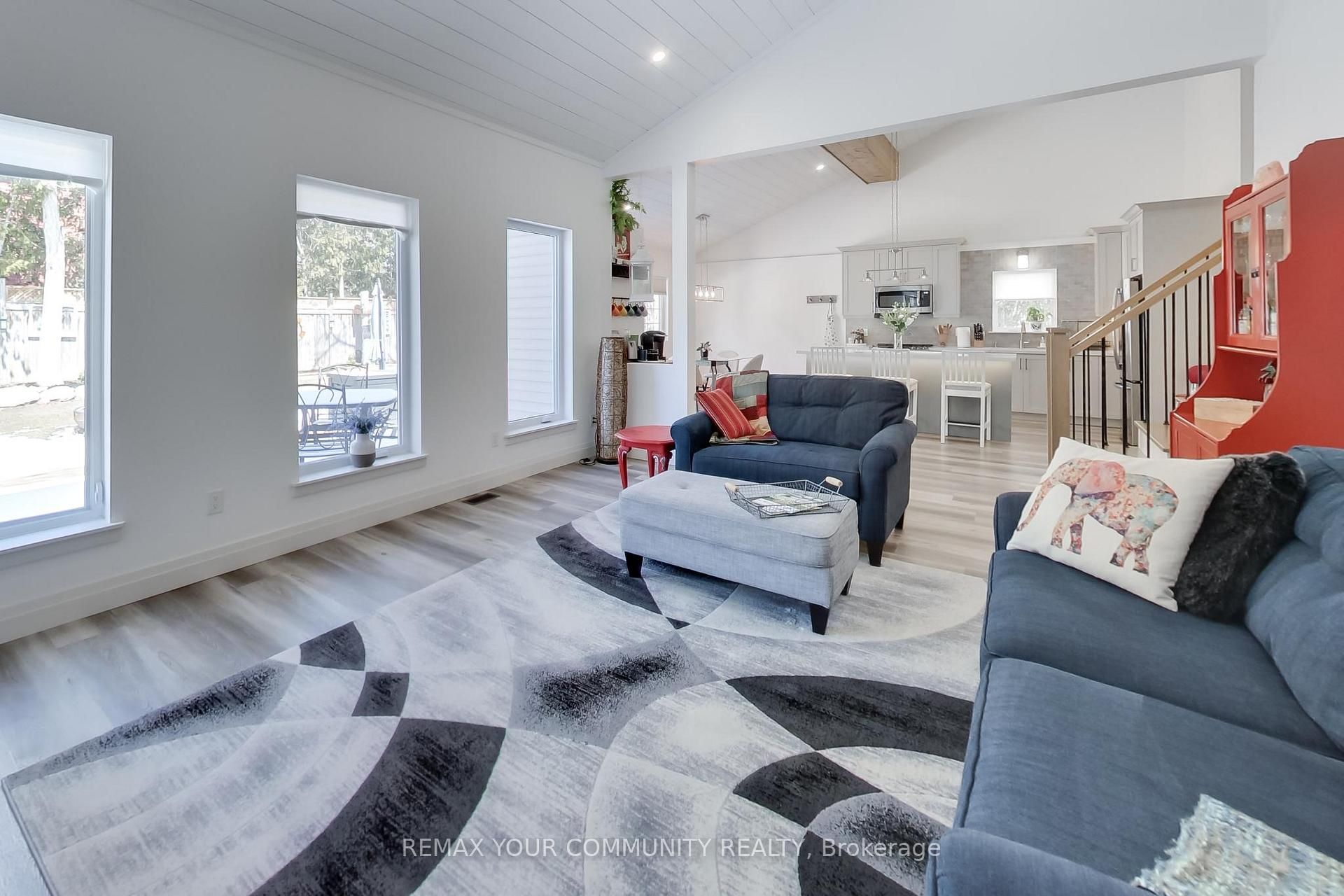 This "lakeside staycation" is more than just a home-it's a year-round retreat designed for those who love to entertain and unwind. From the soaring ceilings to the private beach access, every inch of this home is "dressed up" and ready for its next chapter. Featuring a main floor office/guest room with 3 more spacious bedrooms upstairs, 2 1/2 baths, a 6' shower with seat in ensuite, 10' wall of closets in primary bdrm., cathedral ceilings in 2 guest bdrms & the main bath. Open-concept living room/dining area and kitchen share soaring cathedral ceilings and abundant natural light from numerous windows! The kitchen features a 7' island, quartz counters, and a walk-in pantry! The double-attached garage is a powerhouse of functionality, equipped with its own electrical panel, forced-air gas heater, and built-in workbench with cabinetry. Plus, the mezzanine storage ensures you'll never run out of space for seasonal gear. Relax on the 34-foot wide rear deck overlooking perennial gardens and a manicured yard, or retreat to the charming front porch to catch the cool breezes off lake simcoe. A secondary rear driveway makes hosting guests or storing a boat effortless. You are just steps away from the abc club's private adult members beach and dock. Prefer a livelier afternoon? The much larger, family-friendly members' beach is just a short 5-minute stroll away. This home and its location are truly wonderful!