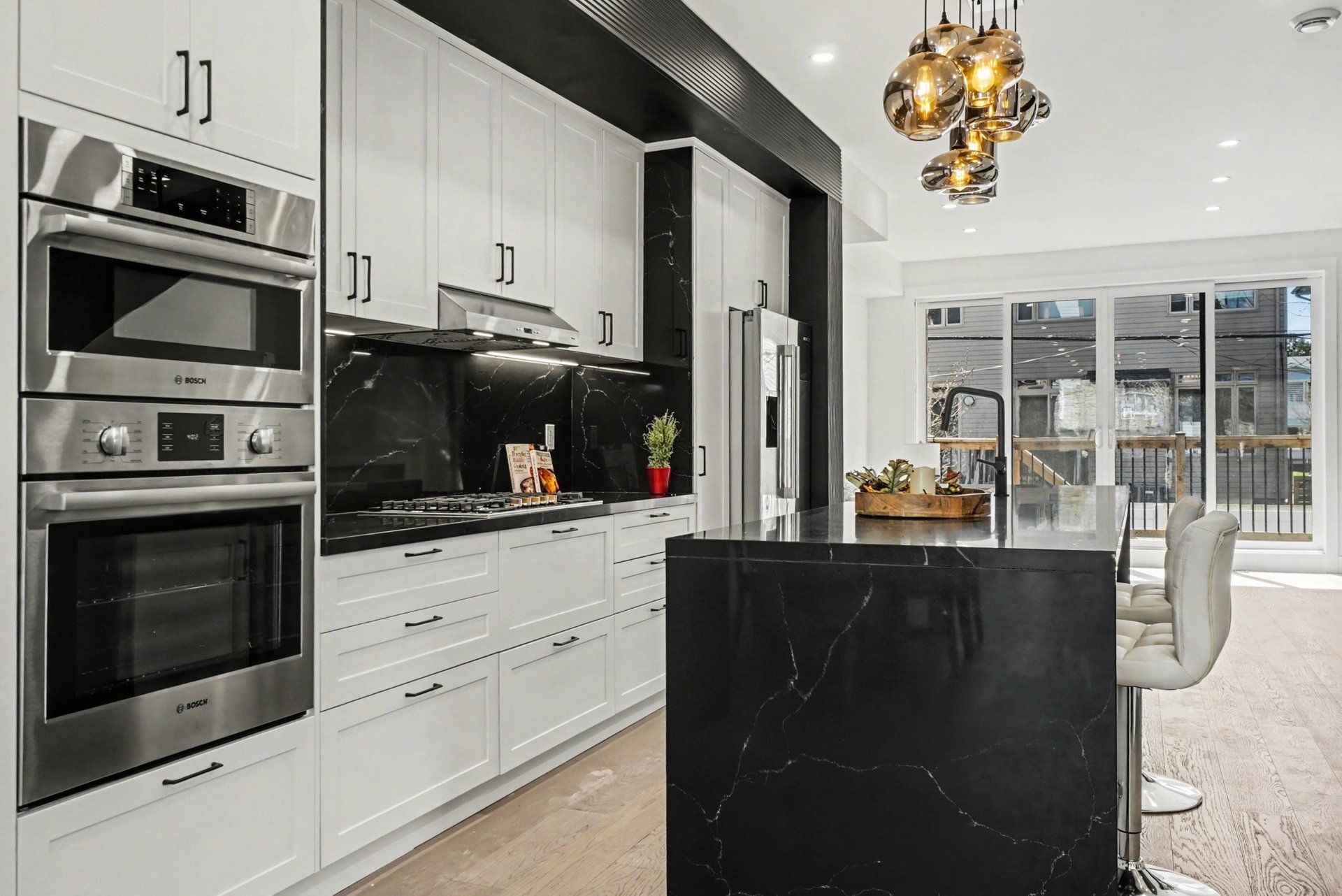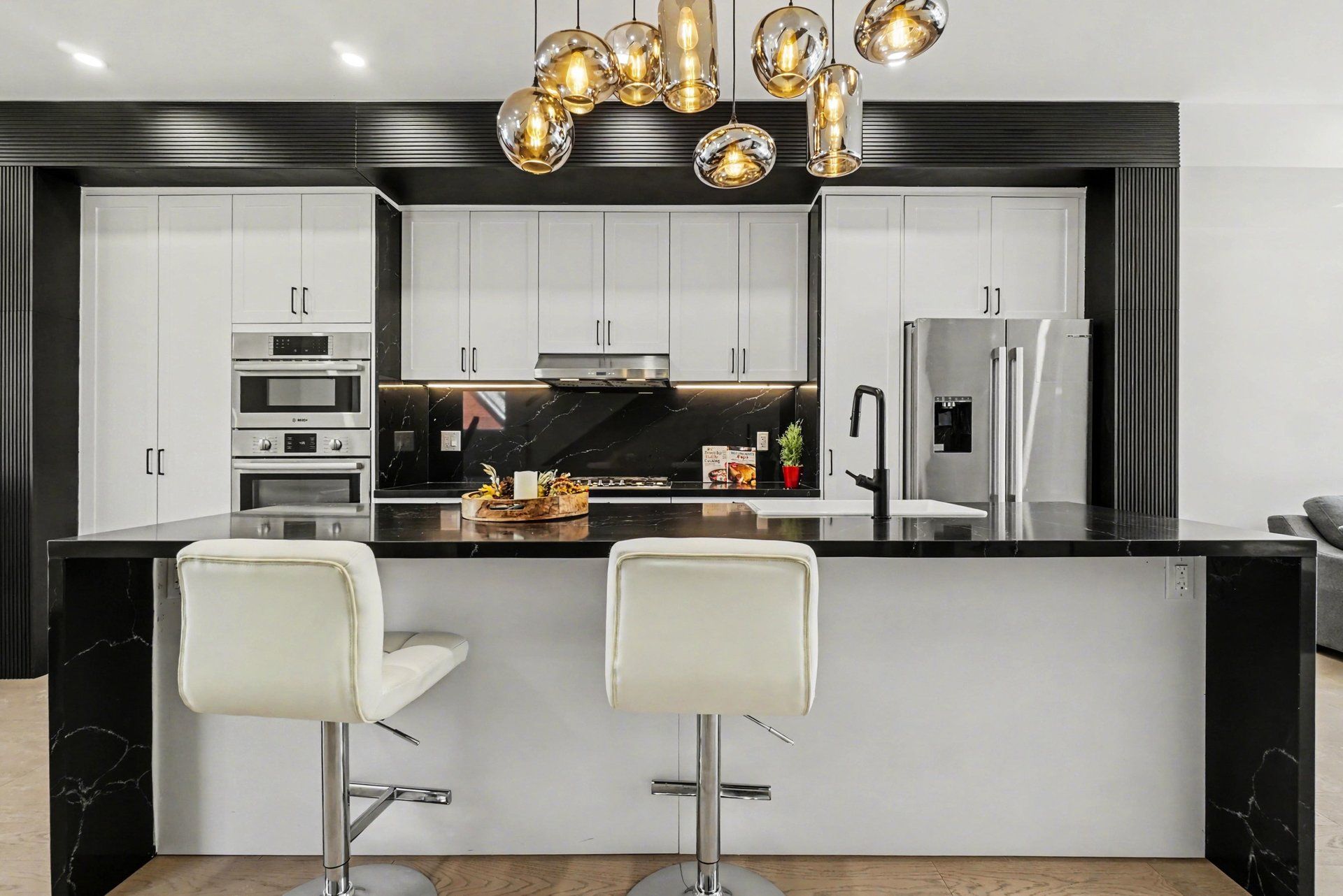 • Magnificent kitchen featuring custom cabinetry and a waterfall island.