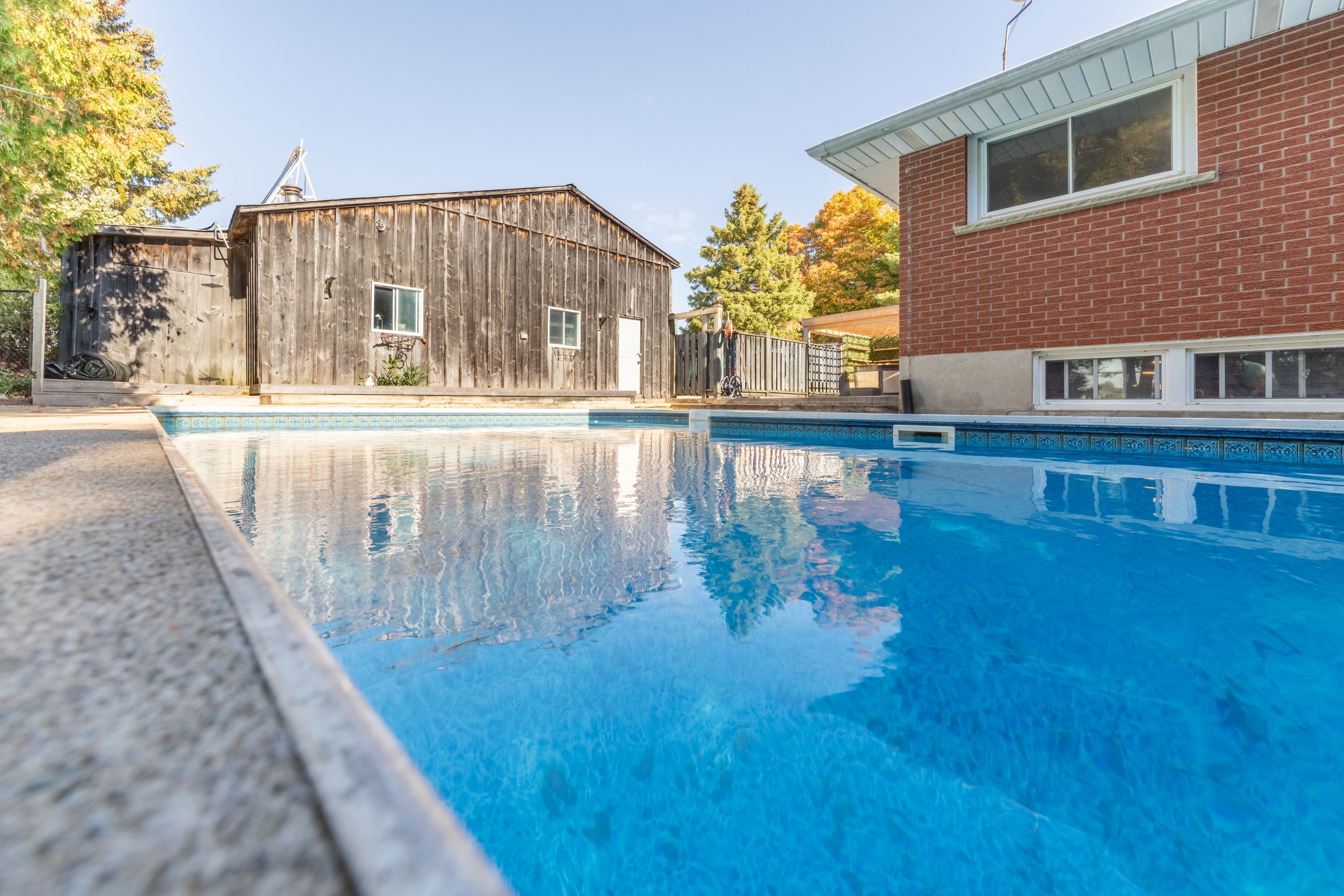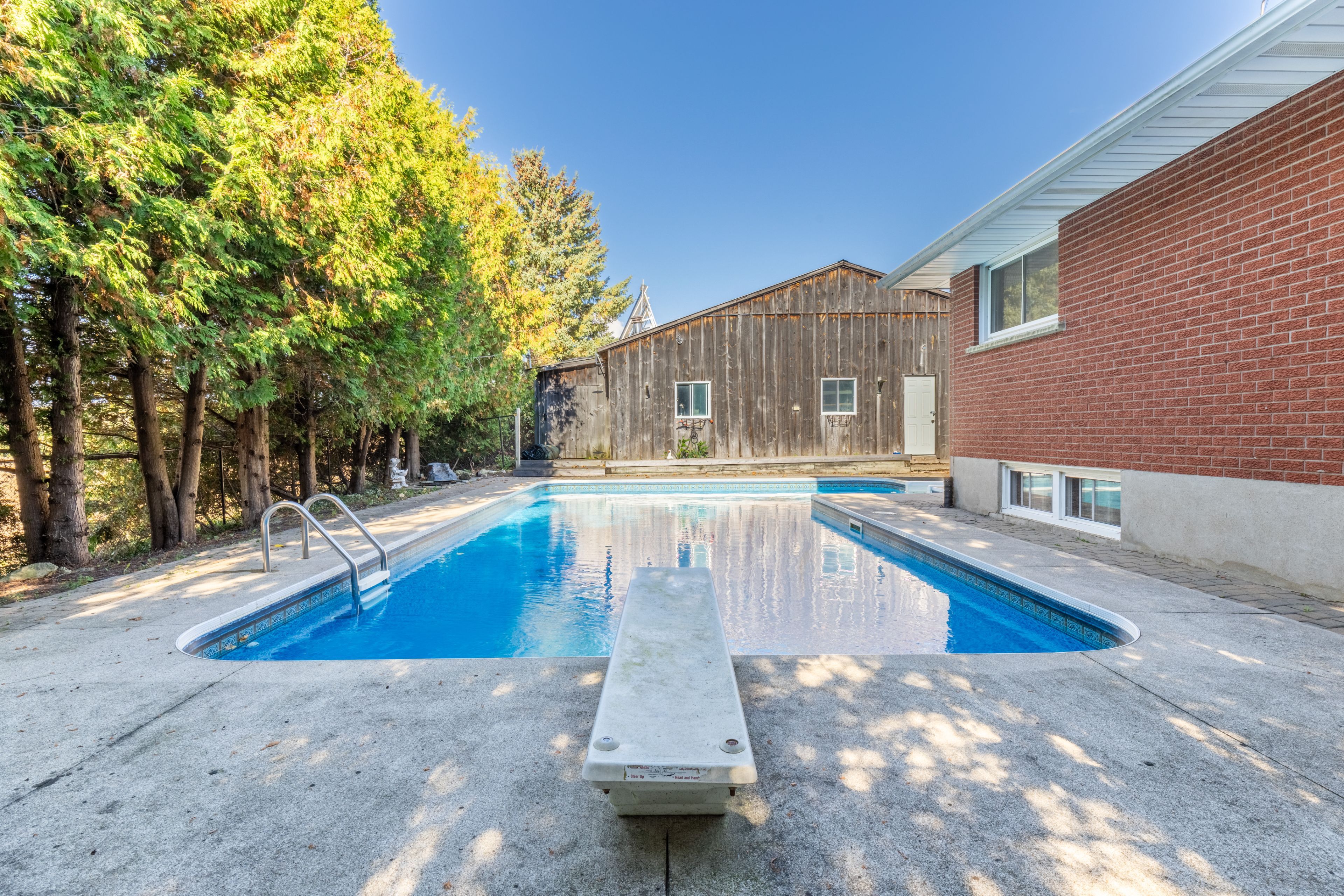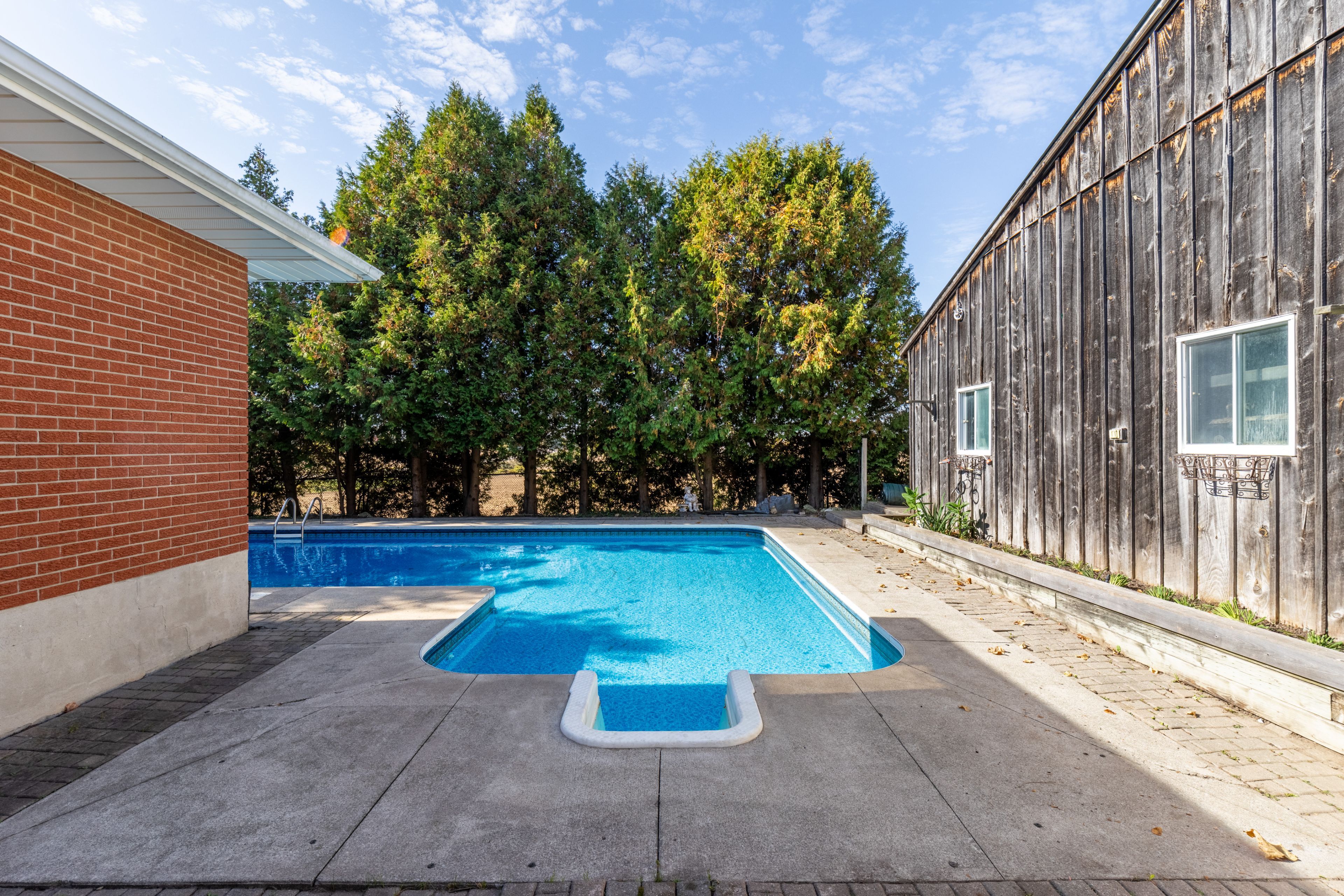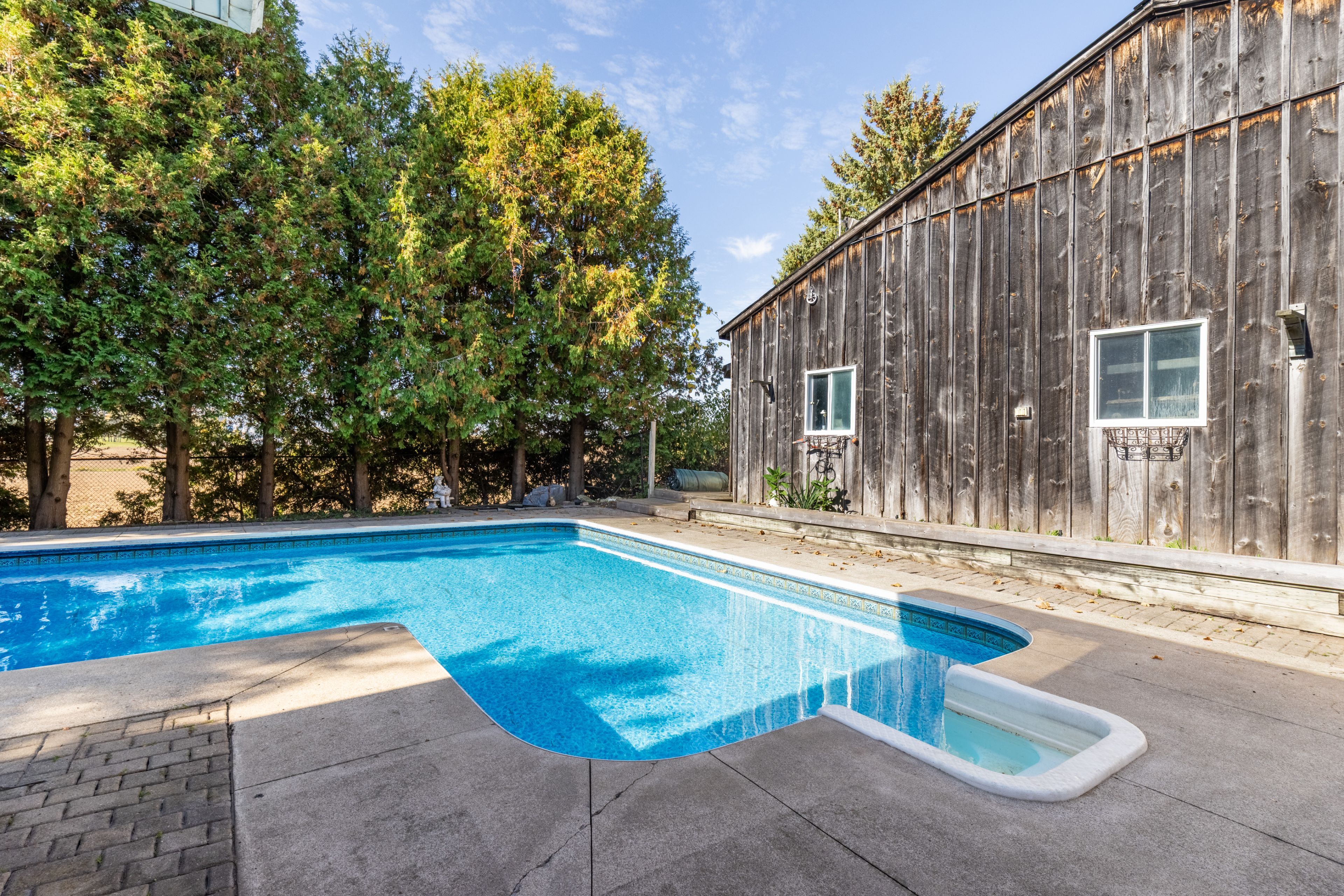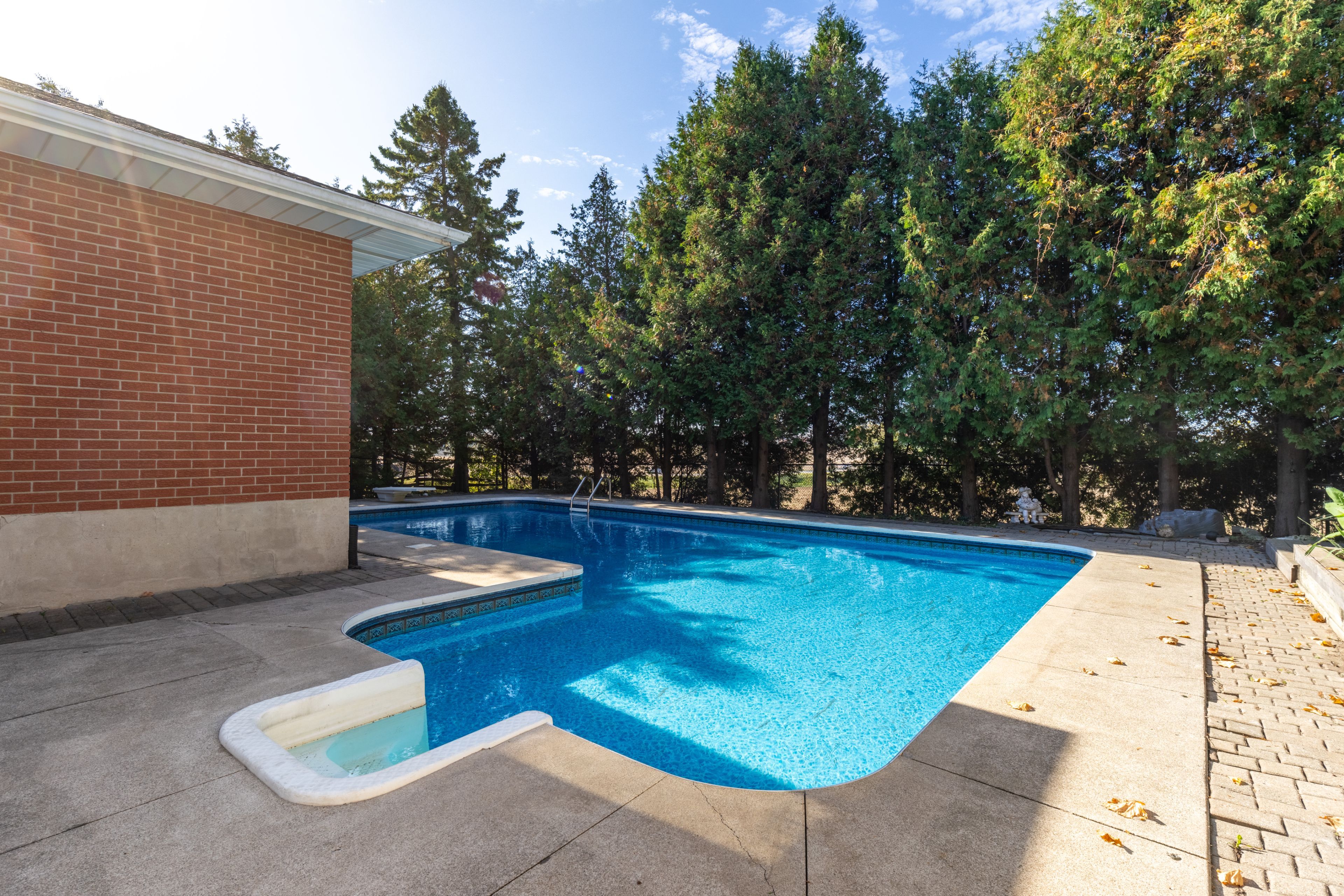 • Inviting in-ground pool with decorative concrete patio for summer fun.