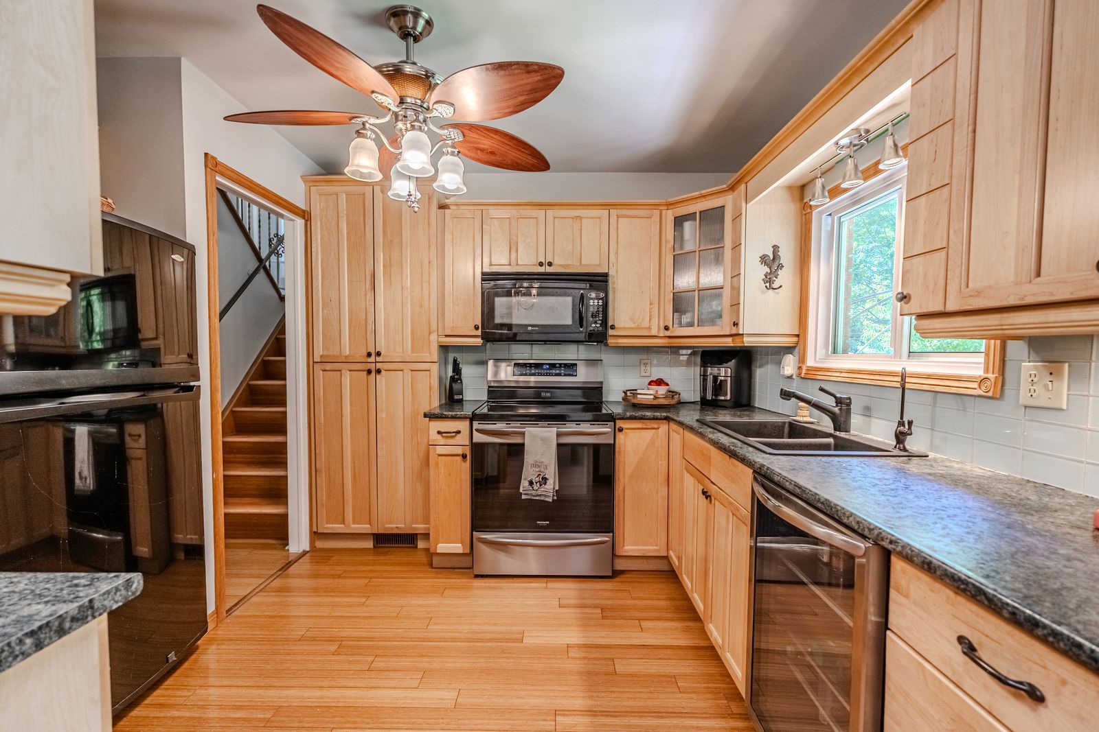 • Bright kitchen with warm cabinetry, pantry storage, and updated backsplash.