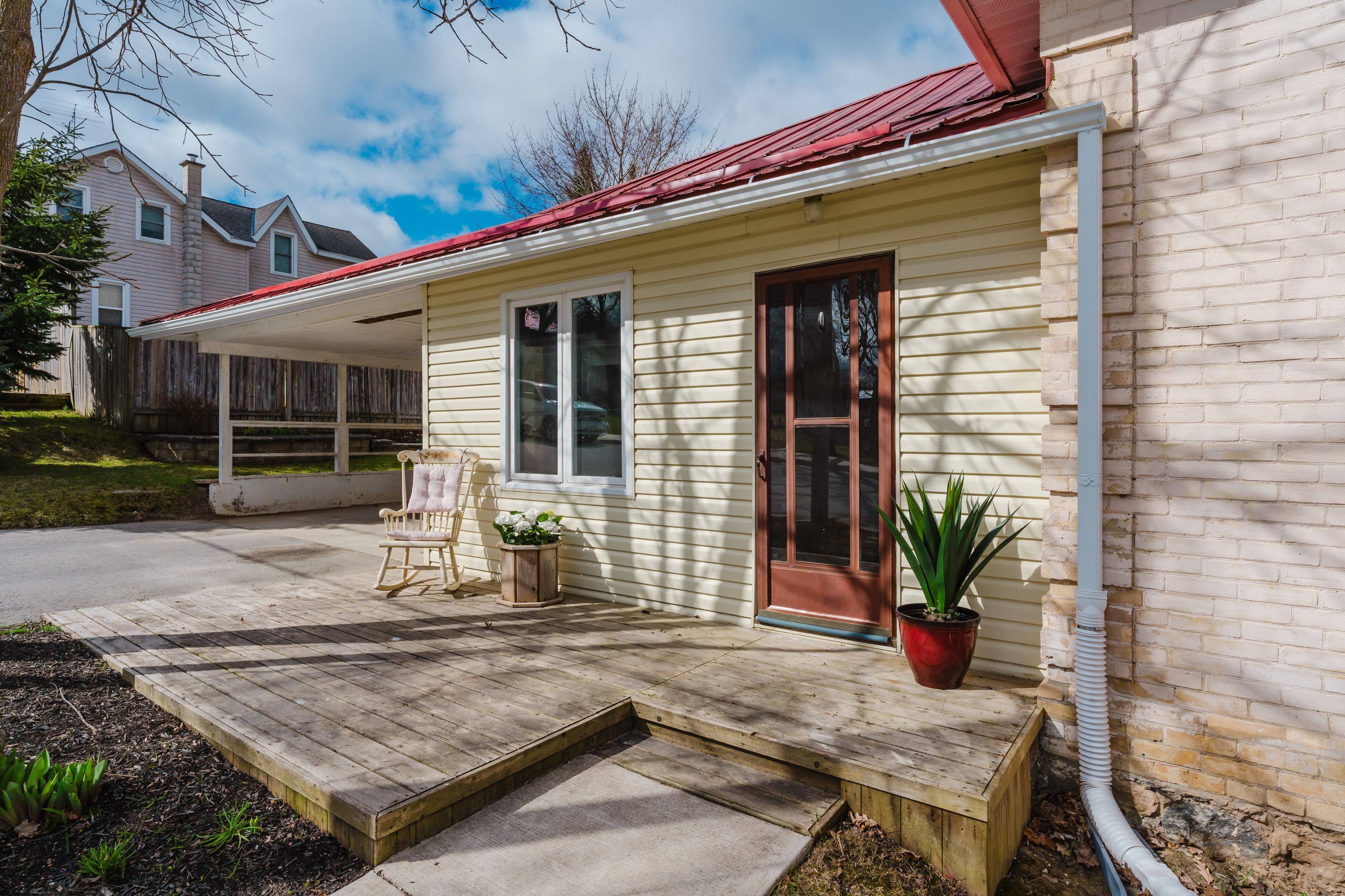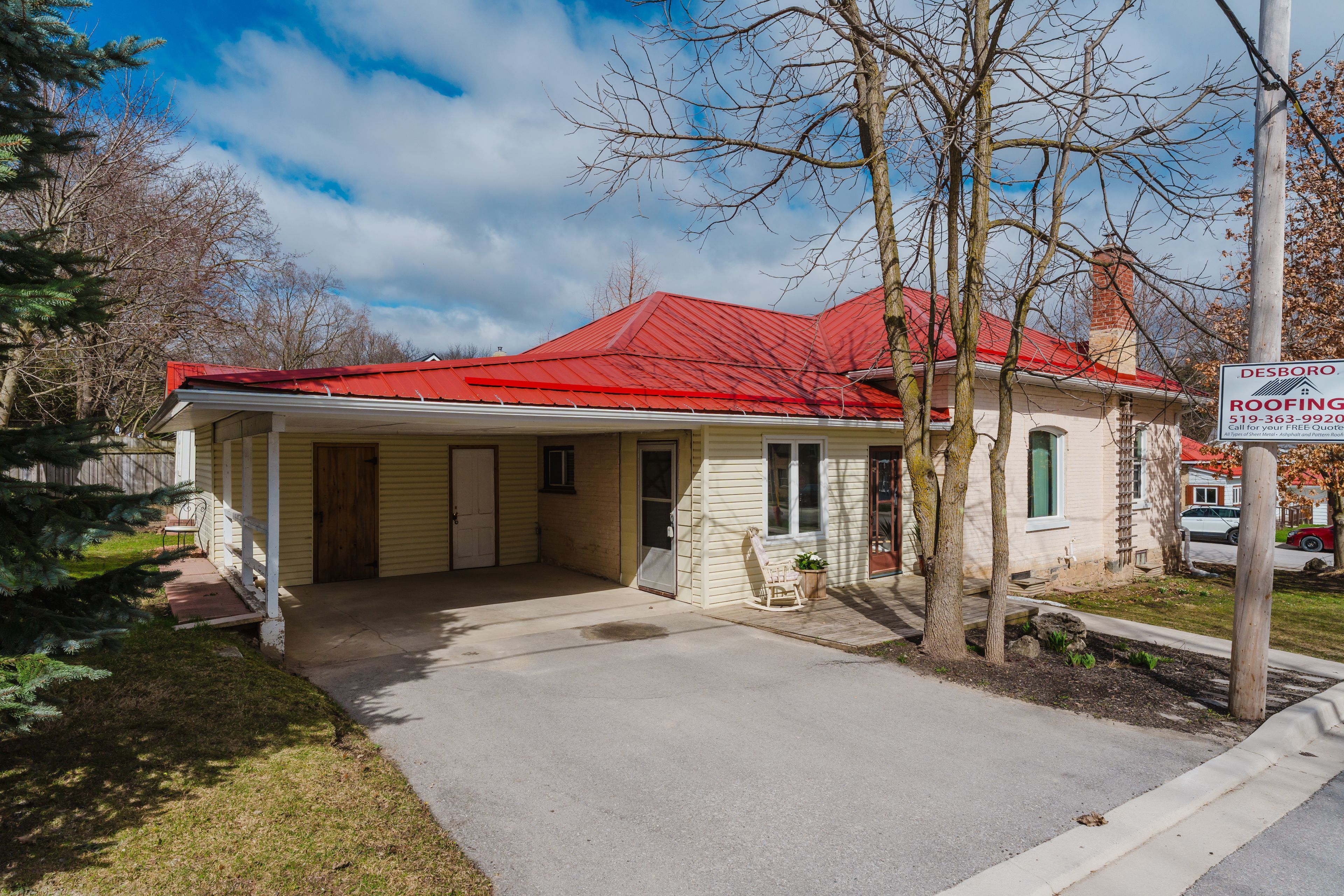 Welcome to this charming yellow brick bungalow nestled on a desirable corner lot with mature trees and perennial gardens. This 2 bedroom, 1 bathroom home offers original character with modern updates. From the moment you arrive, you'll appreciate the durability of the metal roof and the convenience of the attached carport, which includes additional tool storage space. Step inside to the spacious mudroom with the exposed brickwork. The updated kitchen is bright and functional, with the added convenience of the laundry area just off the back. The 4 piece bath has loads of storage and both bedrooms are bright and inviting with their large windows. The homes original hardwood floors and woodwork have been beautifully maintained and flow through the whole home. Outside, the backyard features a bunkie or storage shed with electricity, making it ideal for a hobby space, workshop, or extra storage. This home has seen many recent upgrades, including new sewer and water lines, weeping tile and weatherproofing around the foundation, as well as new soffit, fascia, and eavestrough - giving peace of mind for years to come. Whether you're looking for your first home or a cozy downsize, this bungalow has so much to offer. Don't miss your chance to make it yours!