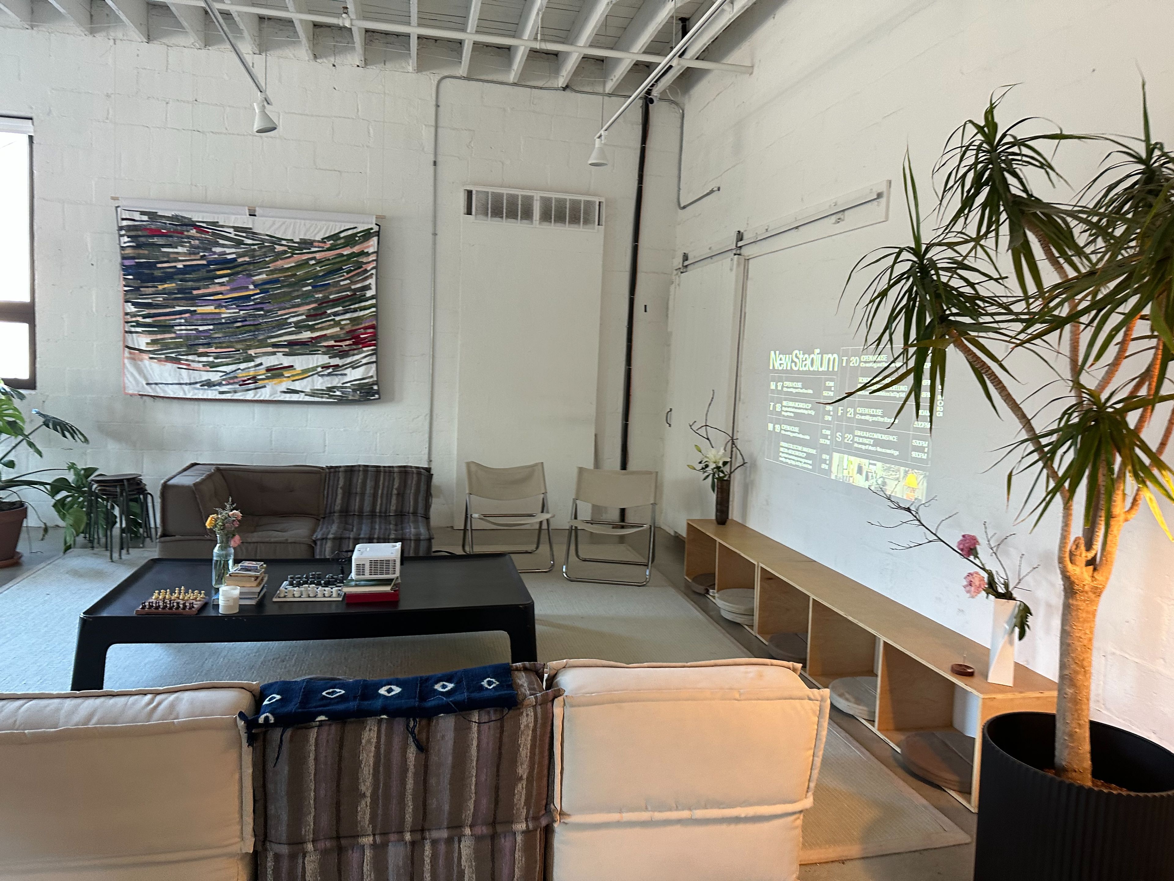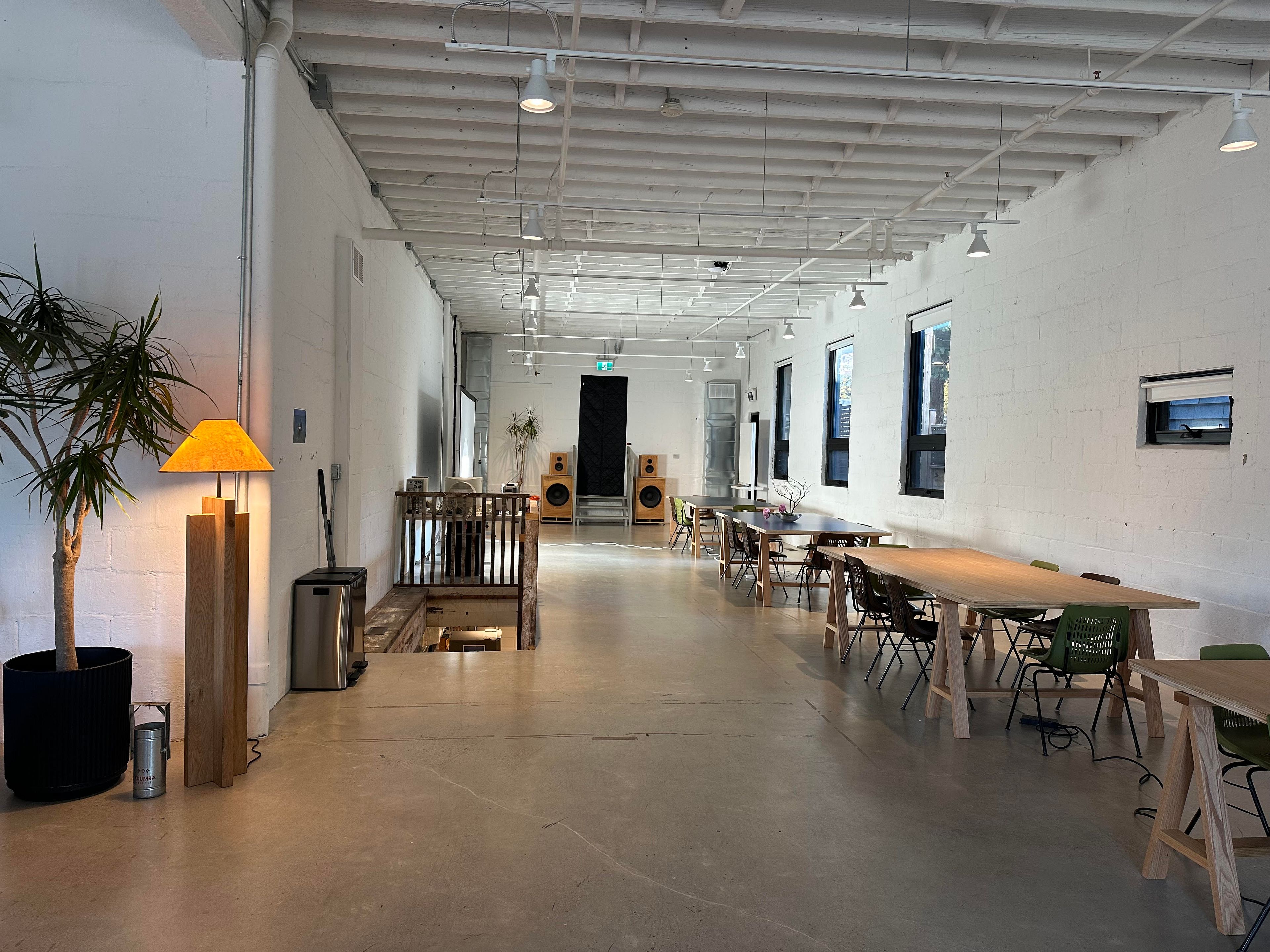• Concrete floors and high ceilings create a modern industrial feel.
