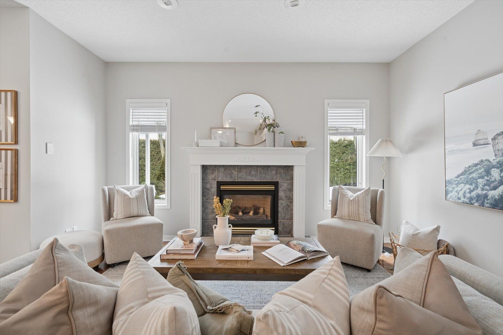 Located in a well-established courtice neighbourhood, this solid brick bungalow offers comfortable main-floor living with over 1,800 sq. Ft. Of thoughtfully designed space. Featuring 9 ft ceilings throughout, the main level includes a bright combined living and dining area with large window, a spacious kitchen with adjoining breakfast area and walk-out, and a welcoming family room with hardwood flooring and a gas fireplace. A main floor office with french doors provides an ideal work-from-home space and could easily function as a third bedroom if desired. The primary bedroom features a 4-piece ensuite and double closet, while the second bedroom offers generous space for family or guests. The unfinished basement presents excellent potential for additional living space. The private backyard is surrounded by evergreens, creating a peaceful outdoor setting. Complete with an attached double garage and ample driveway parking, this home offers space, flexibility, and comfort in a desirable community.