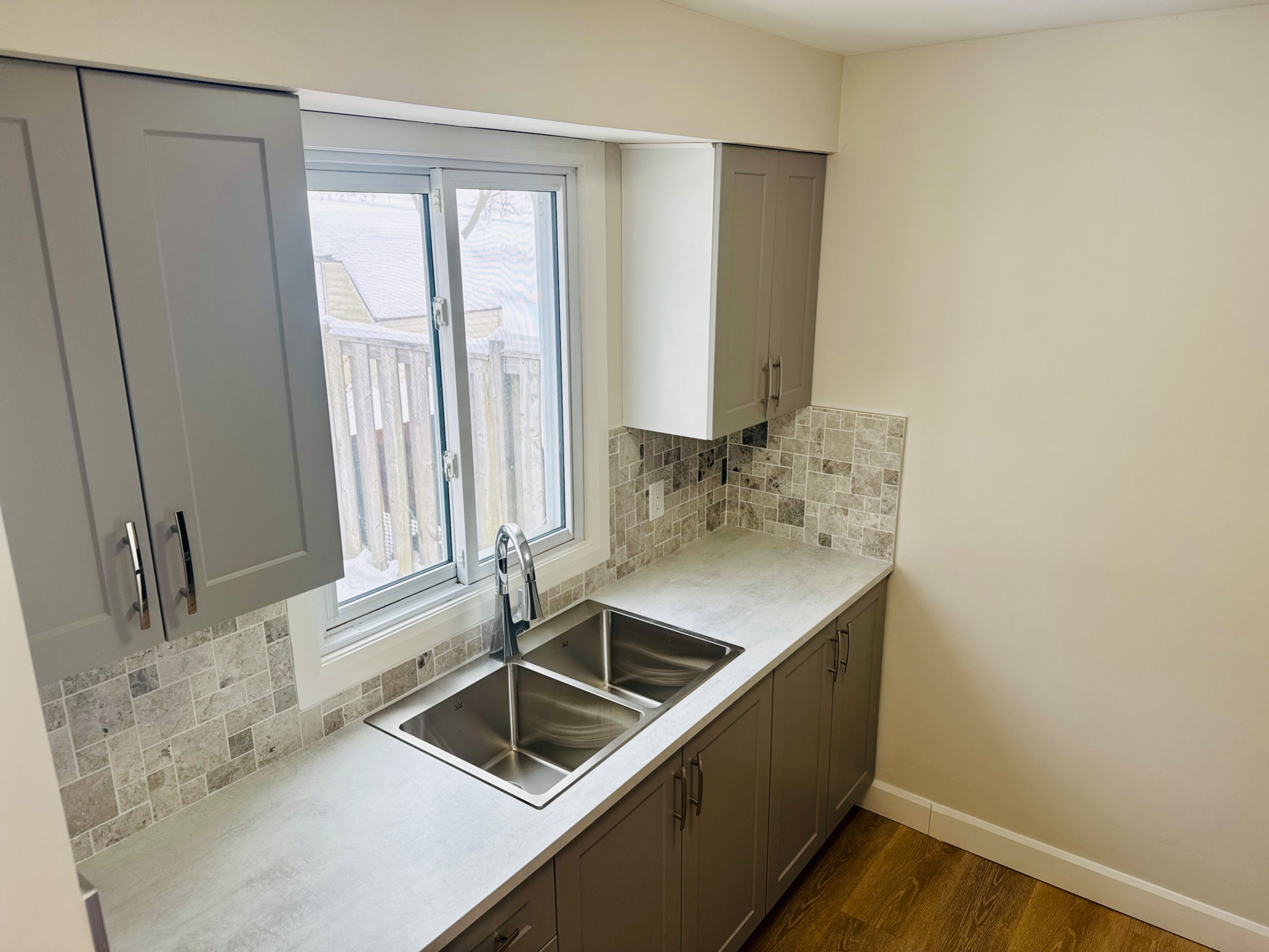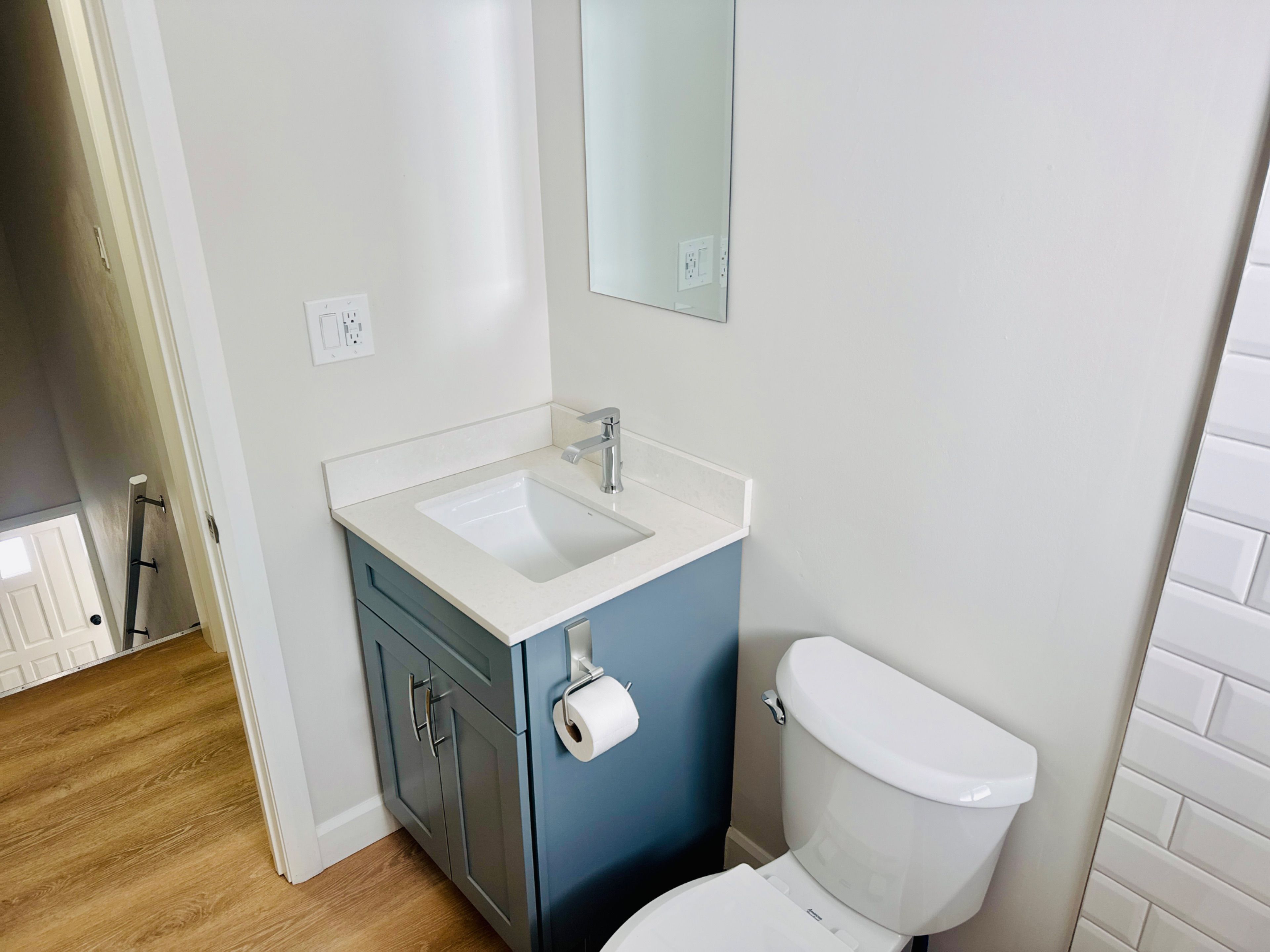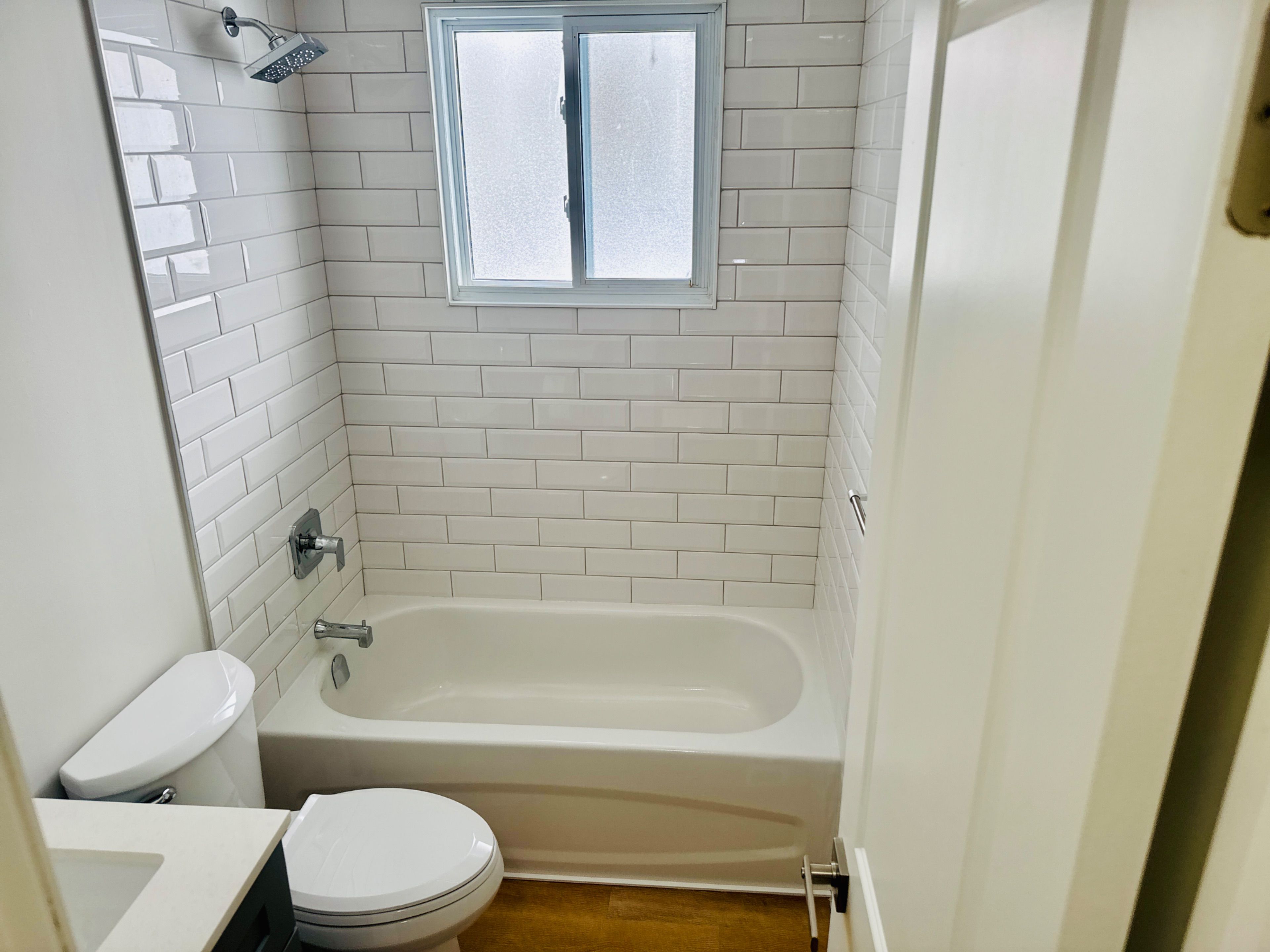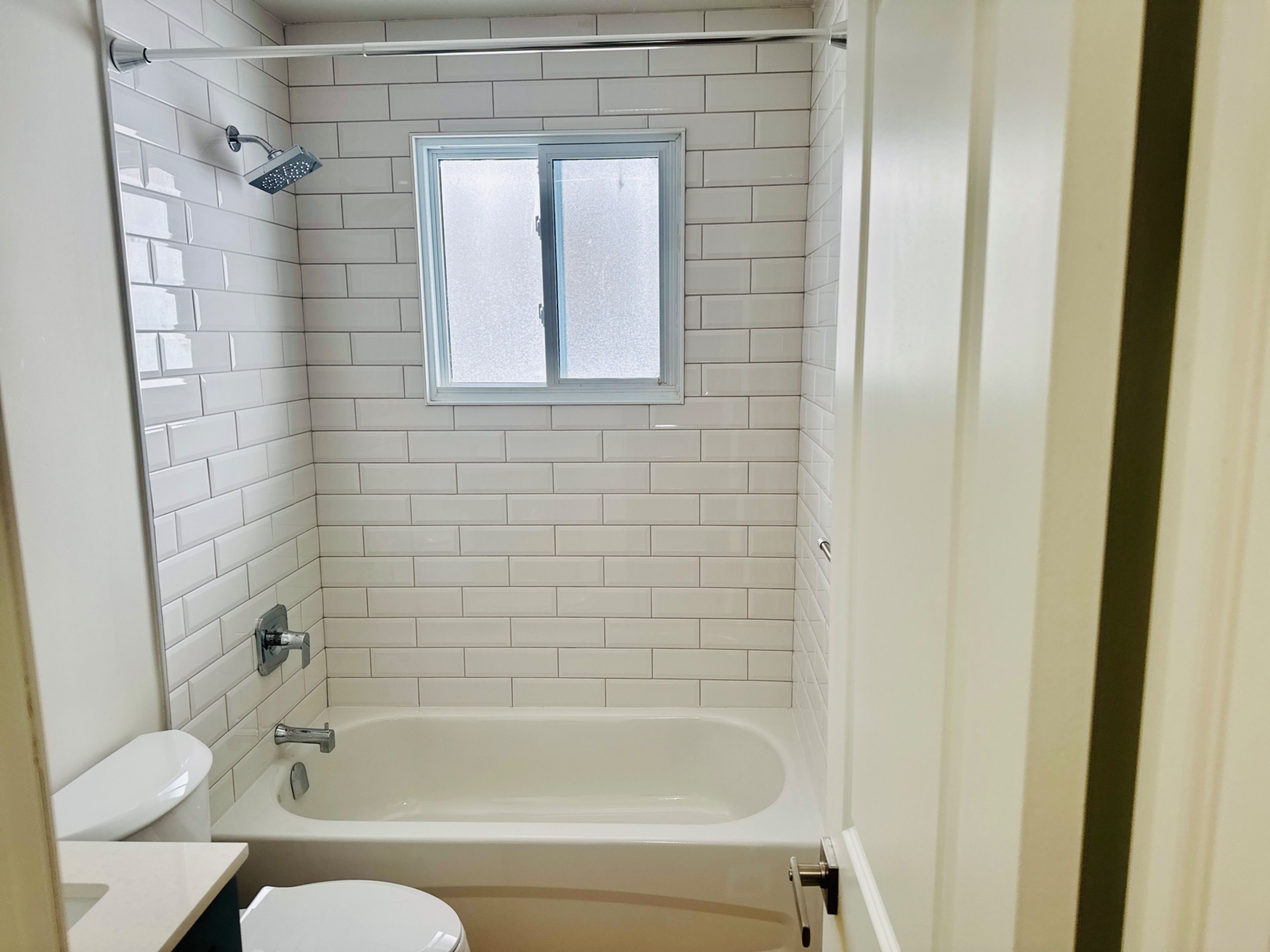 • Freshly renovated washroom featuring stylish subway tiling.