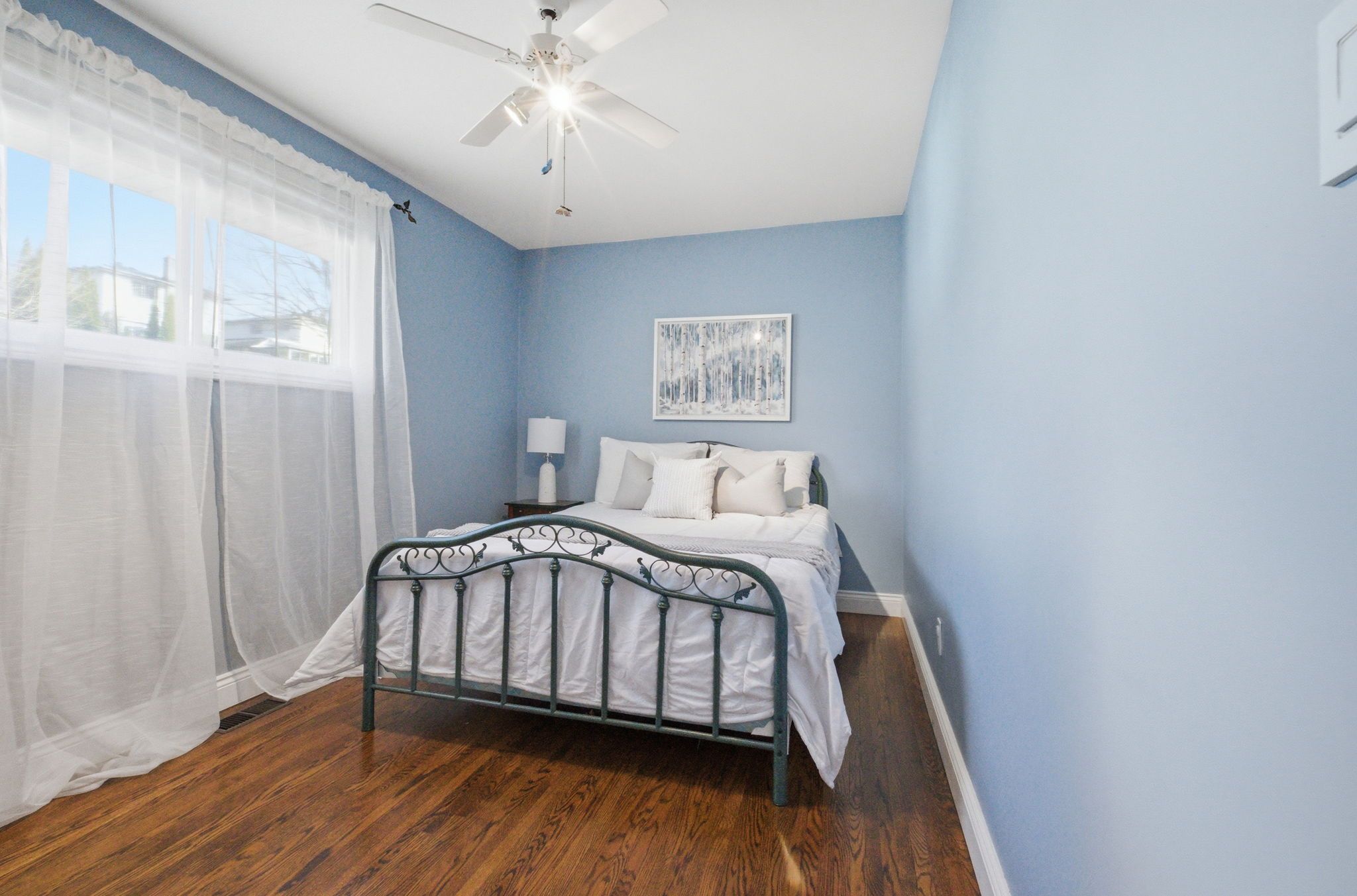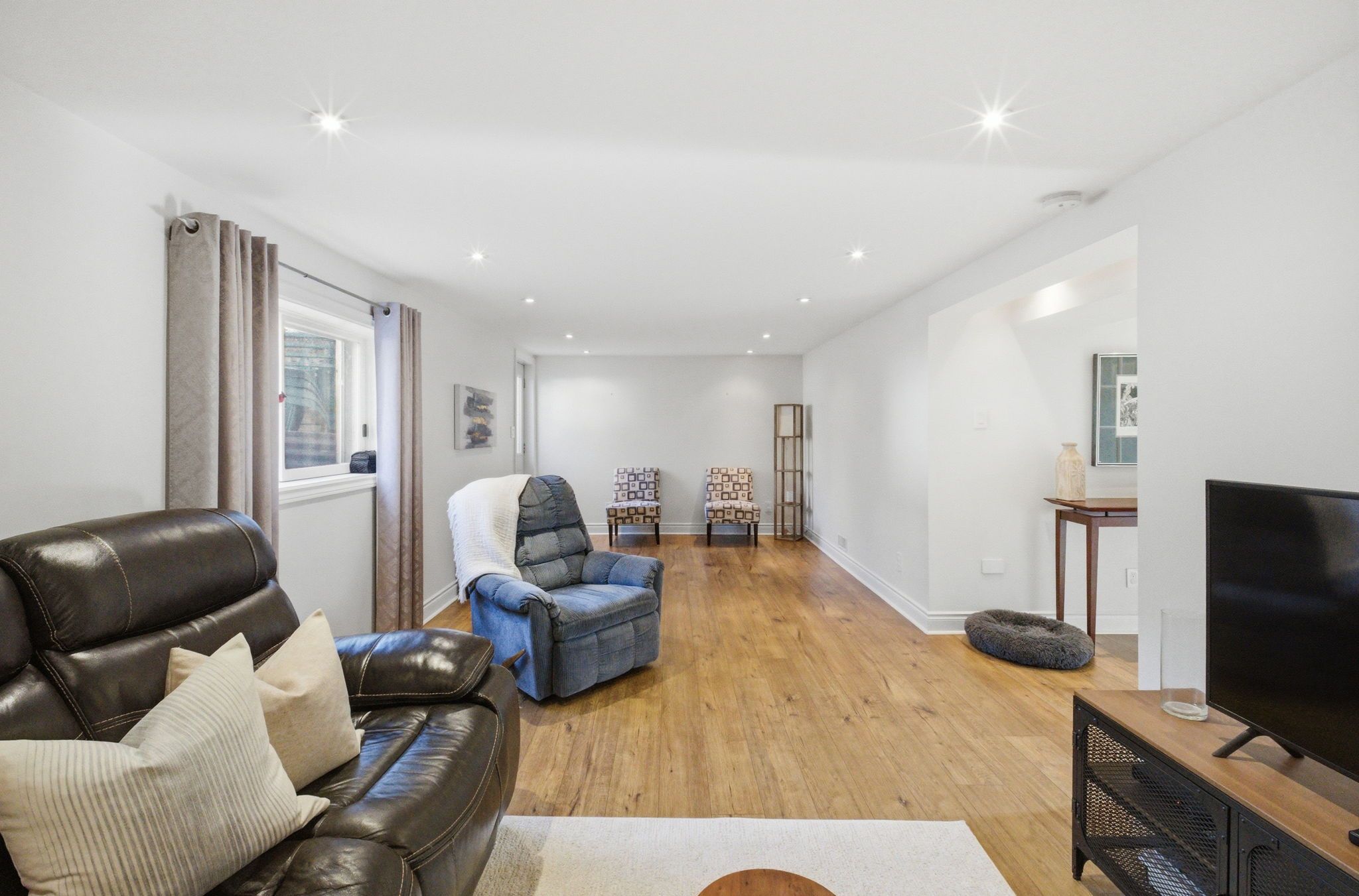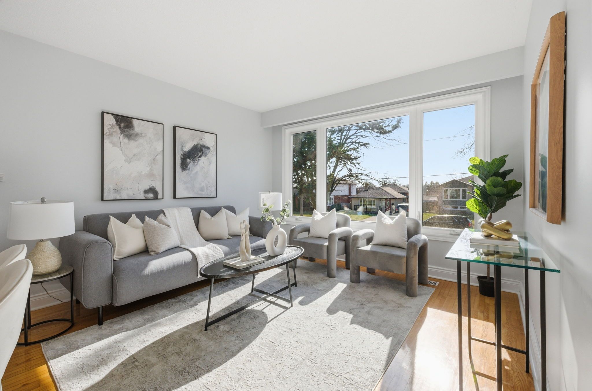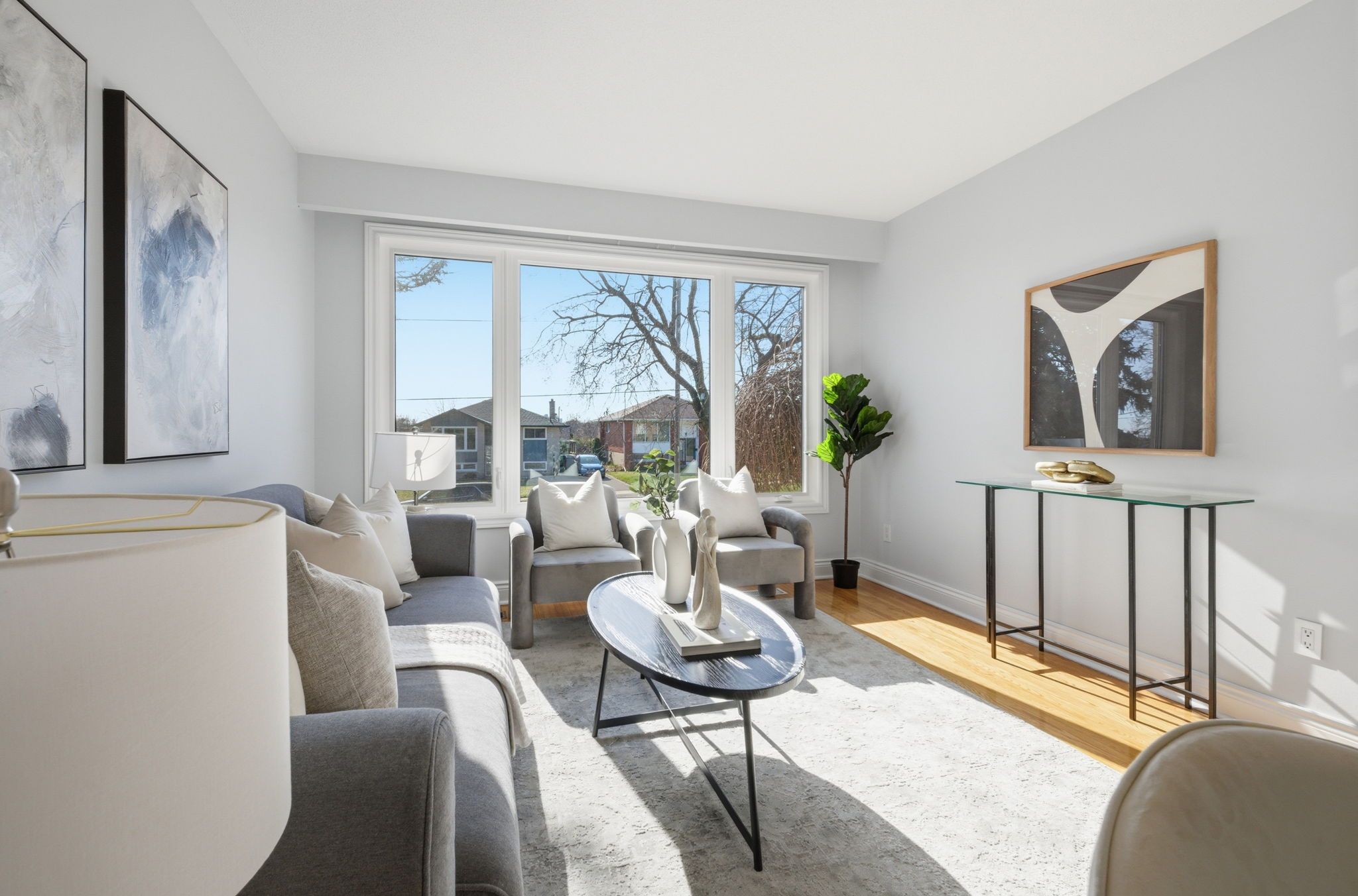 • Bright interior with large windows and hardwood flooring throughout living areas.