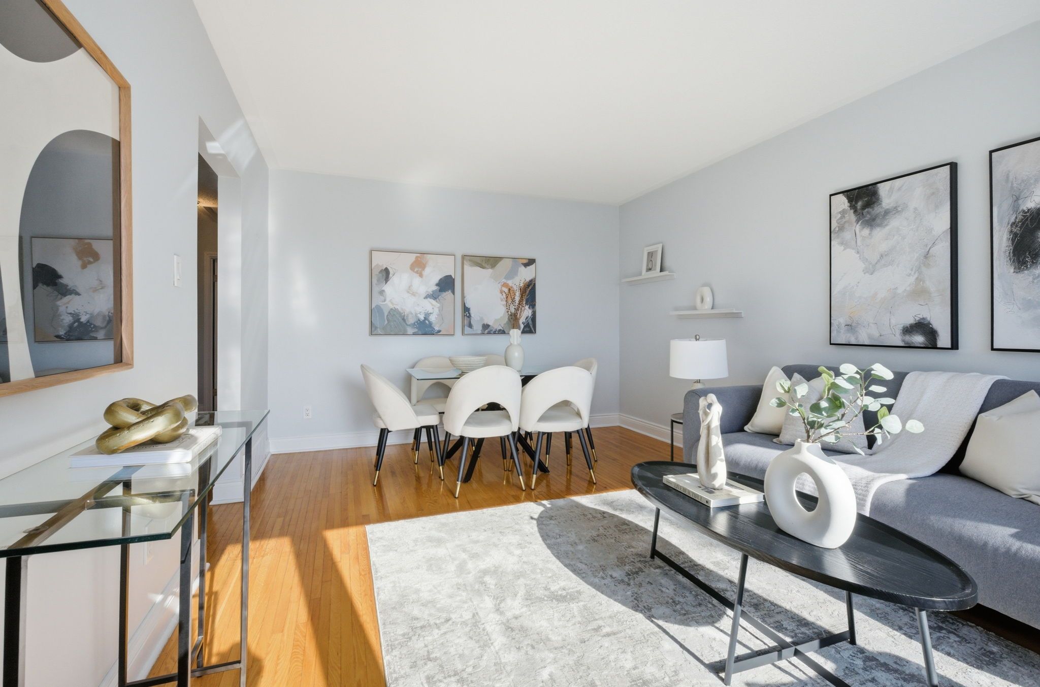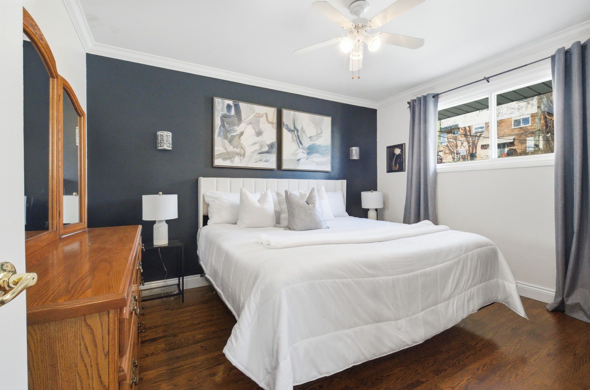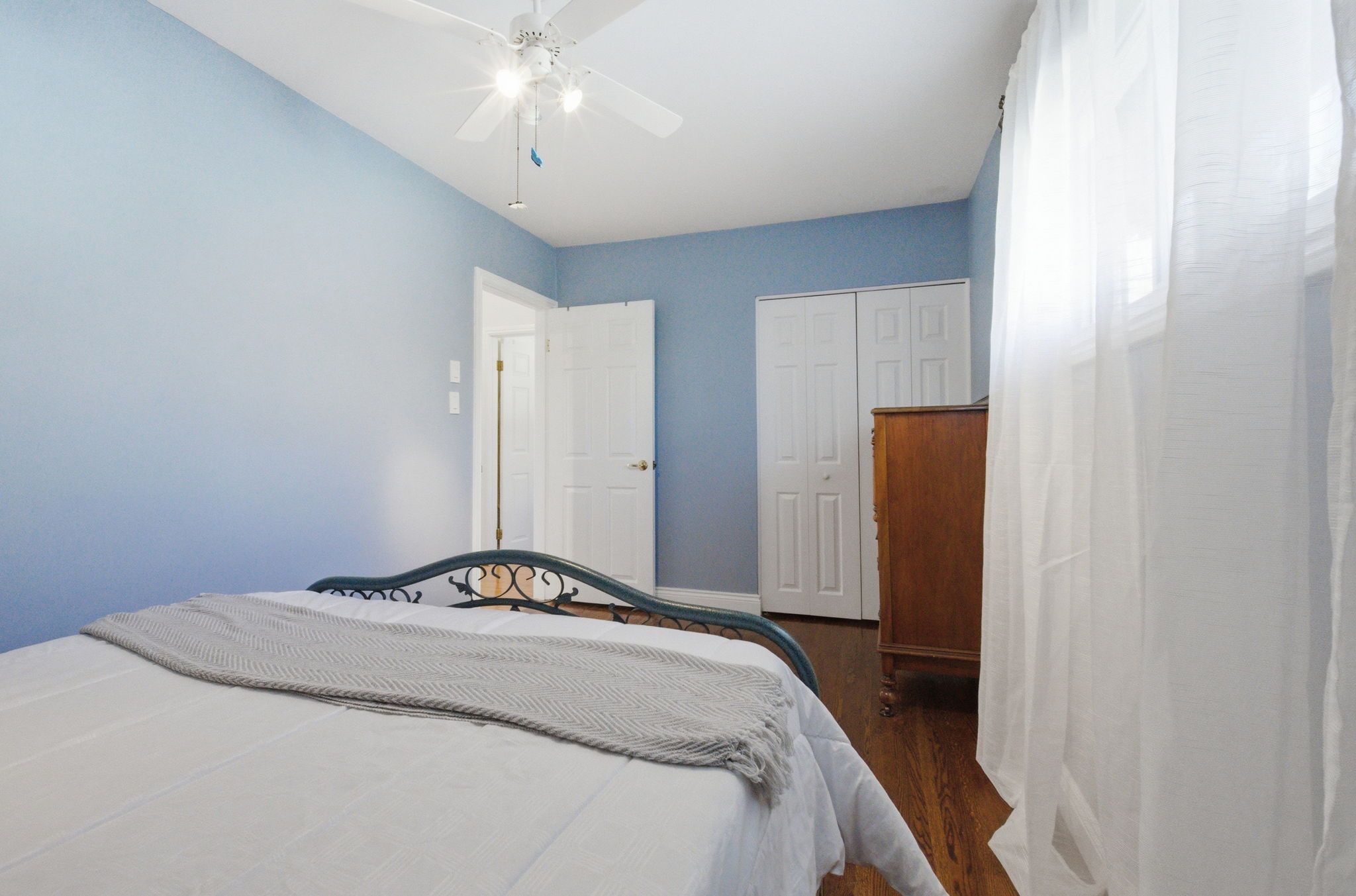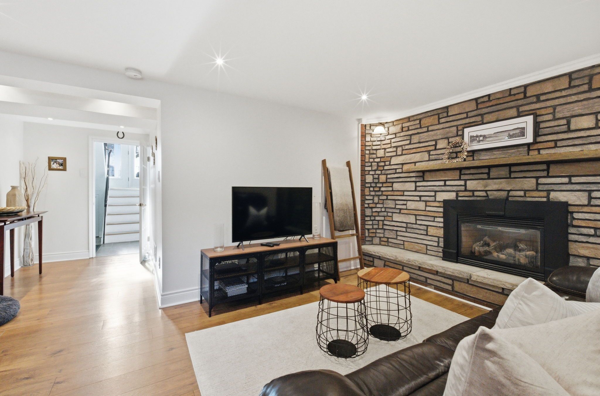 • Bright interior with large windows and hardwood flooring throughout living areas.