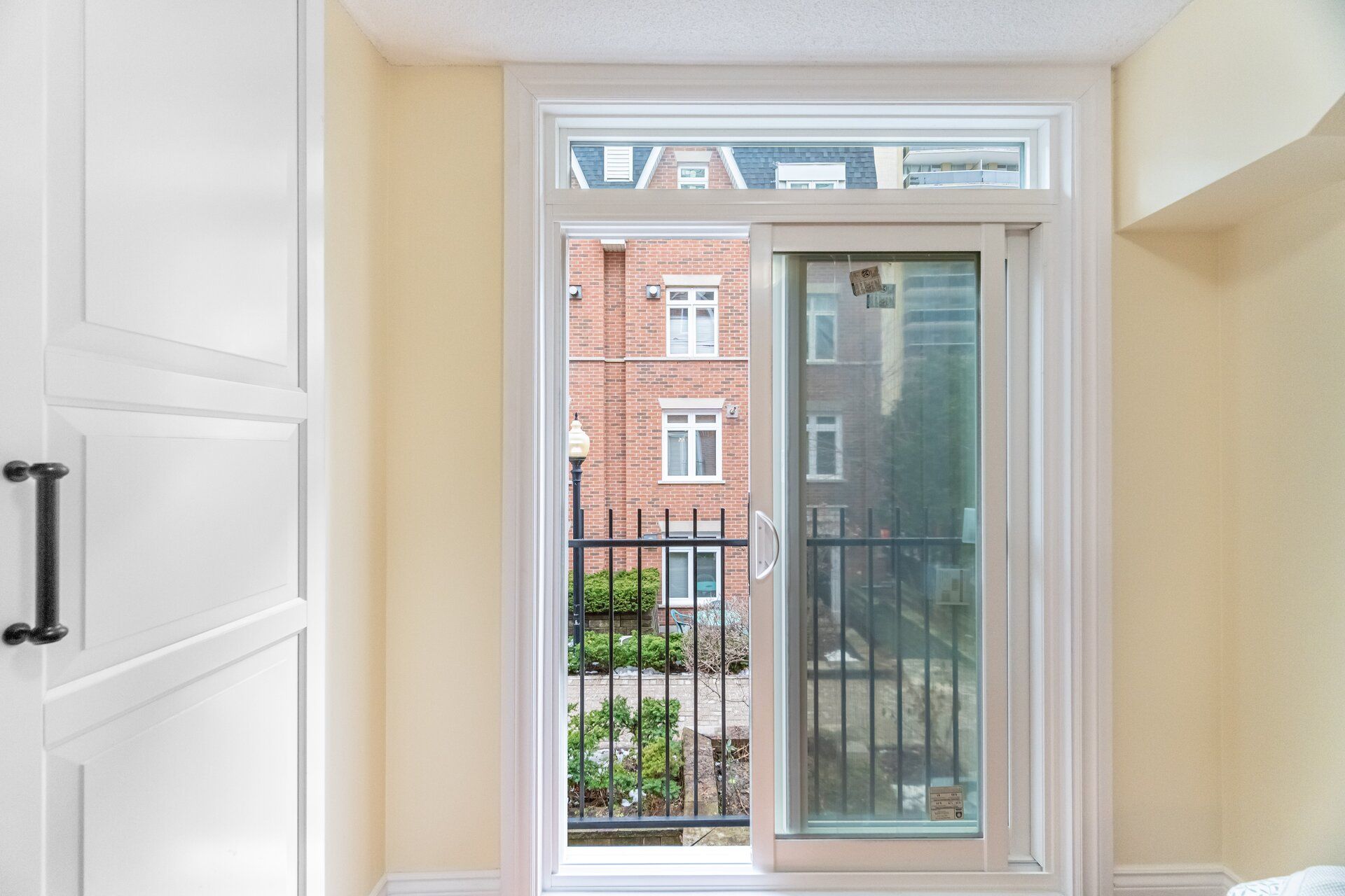 • Bright open living room with a cozy gas fireplace and balcony access.