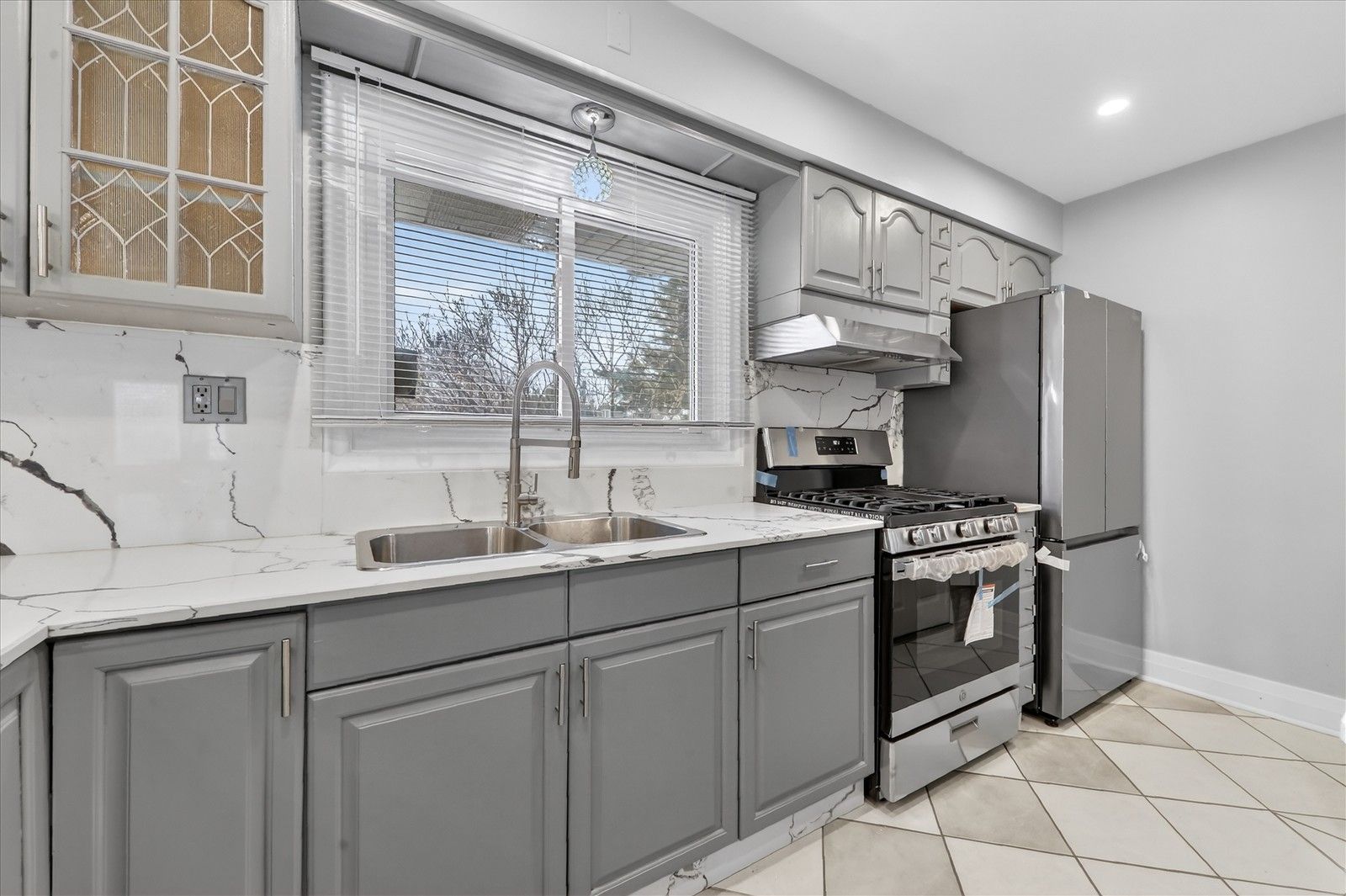 • Modern kitchen with stainless steel appliances and quartz countertops.