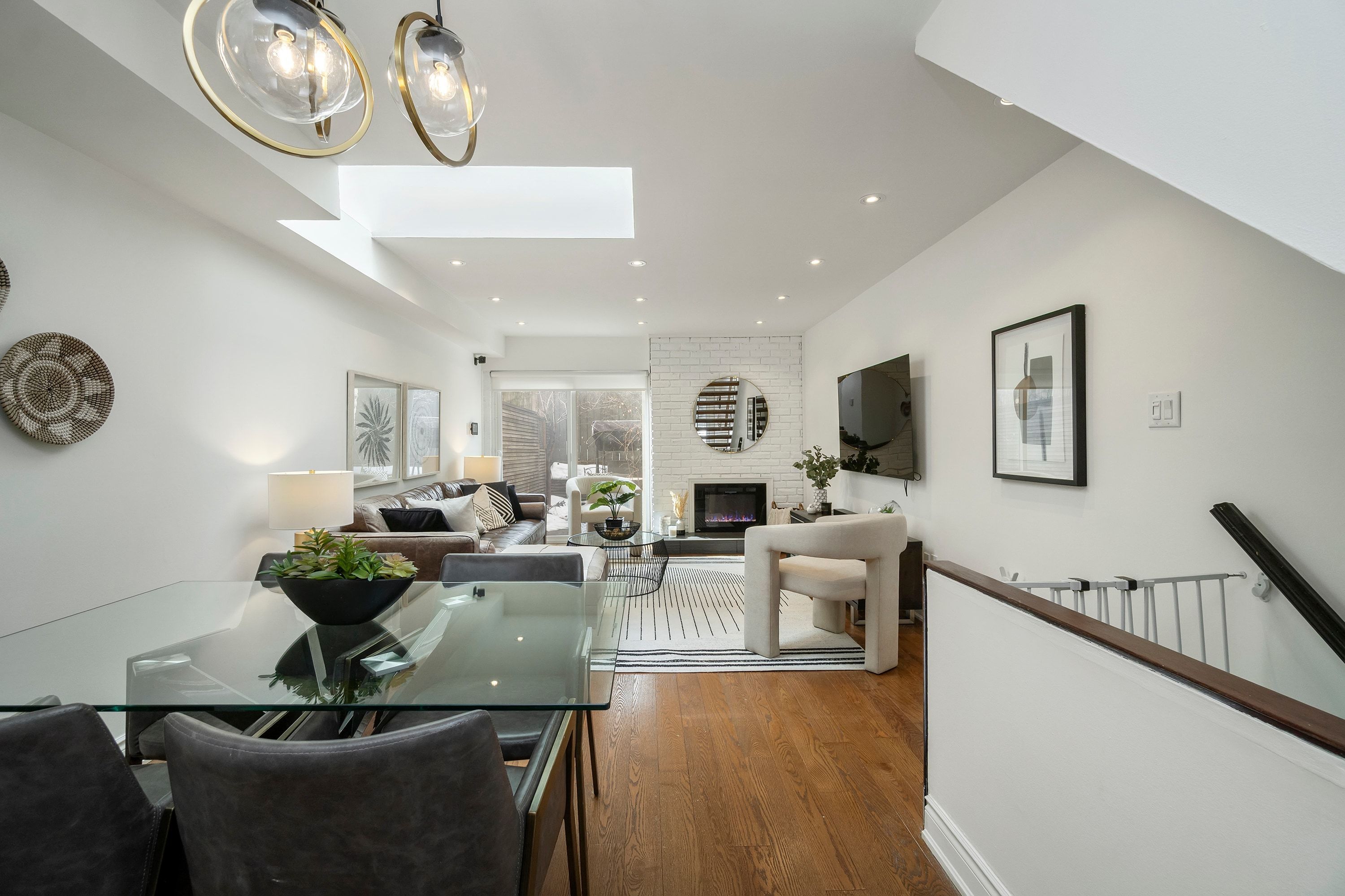 A true end-unit townhouse that actually lives like a house - a rare find in the city and standout value in the heart of leslieville! They simply don't build them like this anymore: larger than many semis in the neighbourhood with an impressive 1,360 sq ft above grade plus a basement. Step into a proper foyer before the bright, open kitchen, living and dining spaces unfold - all on one level - head upstairs to two genuinely spacious bedrooms & a renovated bath. And yes, there's a full basement too! Ready for whatever you need: rec room, gym, home office or all three, plus a powder room, laundry and serious storage. Stylish kitchen features butcher block counters, loads of cabinetry, updated appl incl induction stove w air fryer, & plenty of room to cook and entertain, while the oversized living/dining area offers hardwood floors, a cozy electric fireplace and a walk-out to your own private backyard oasis - perfect for summer dinners, drinks with friends and late nights under twinkling patio lights. Upstairs, the primary bedroom easily fits a king-size suite and boasts wall-to-wall built-ins plus a second closet, hardwood floors and updated lighting, while the second bedroom comfortably fits a queen bed with a full closet. The renovated main bath features a walk-in multi-head shower, and a skylight floods both levels with natural light for a bright, airy feel throughout. A friendly complex tucked away from it all. Unbeatable queen & pape location puts you steps from leslieville and riverdale's best cafes, restaurants, nightlife, boutique shopping, parks and the lake, with transit at your door, quick dvp access and the future ontario line nearby. 1 parking included. Big space, real outdoor living and low maintenance fees - in a secluded complex seconds from everything you could ever want - this is city homeownership without compromise! Maintenance fees include: rogers ignite cable, internet, water, building insurance, most exterior maintenance, snow removal.