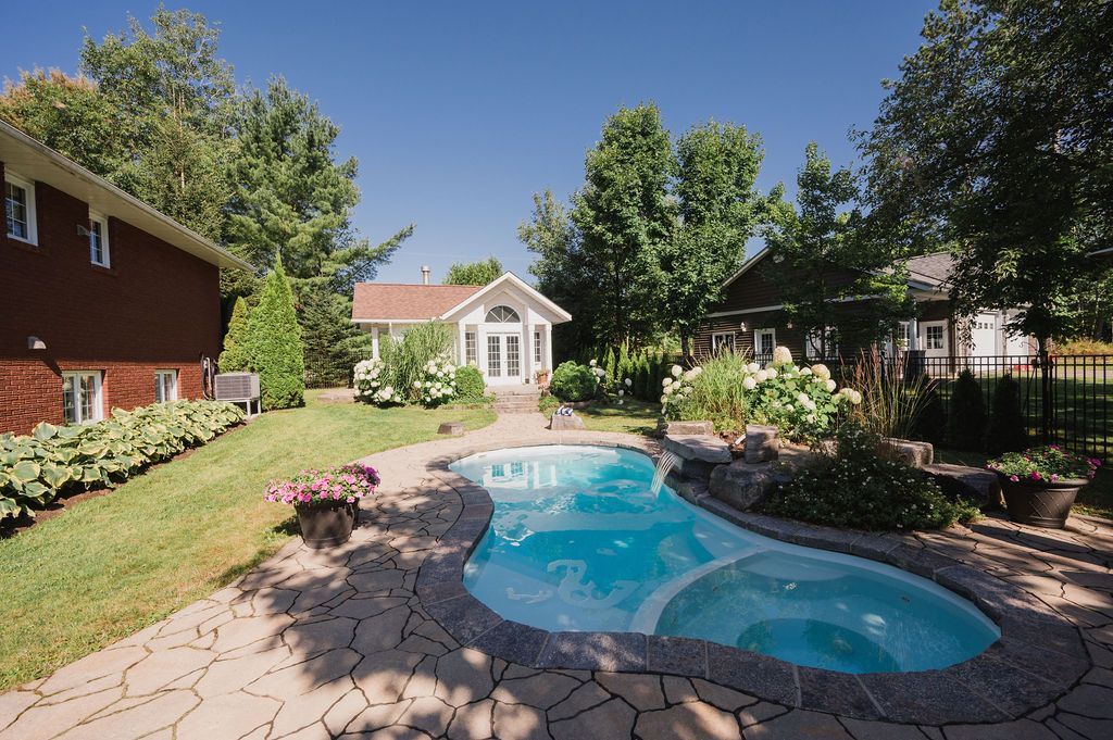 • Outdoor amenities include a pool, hot tub, and beautifully landscaped yard.
