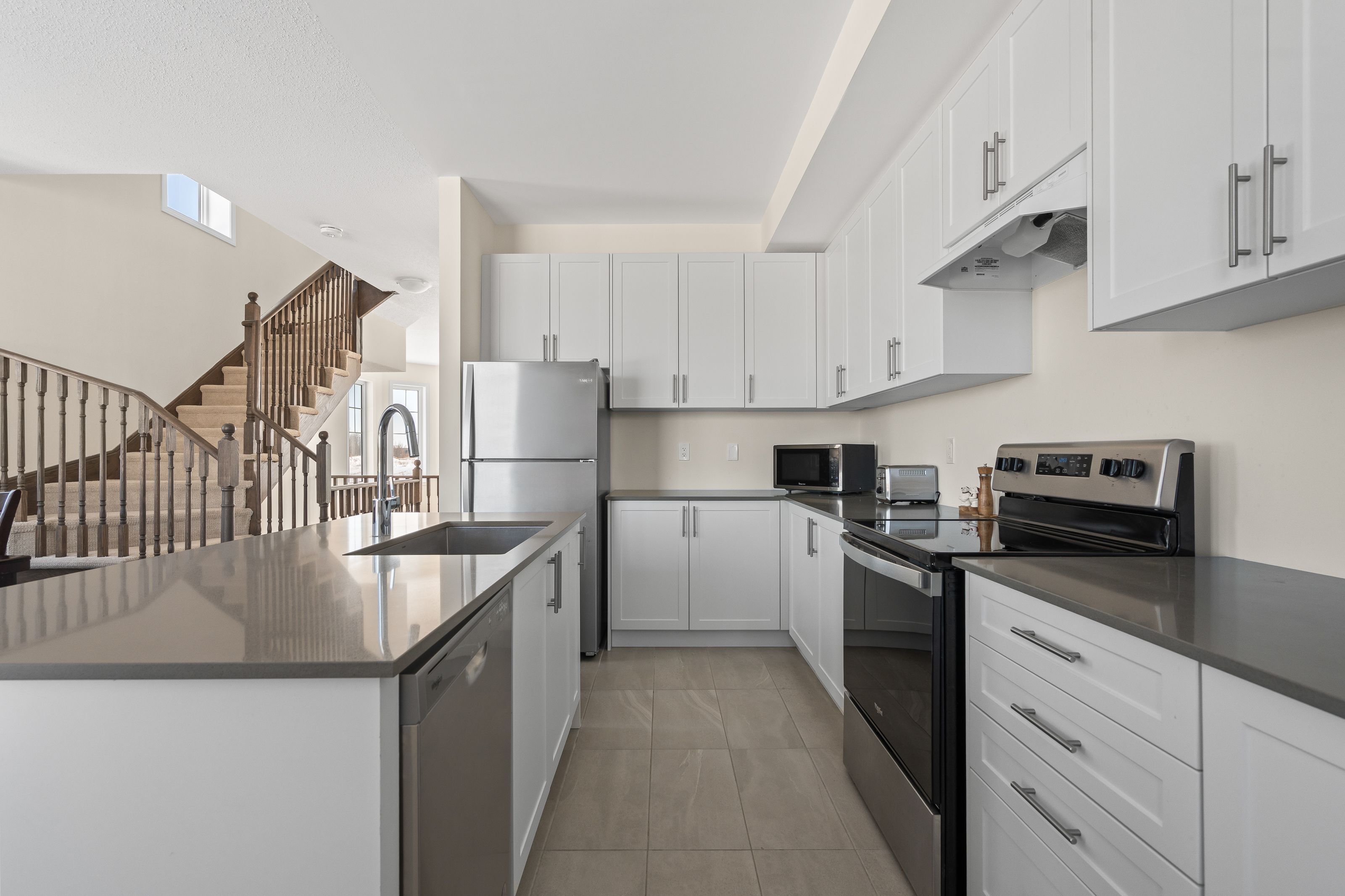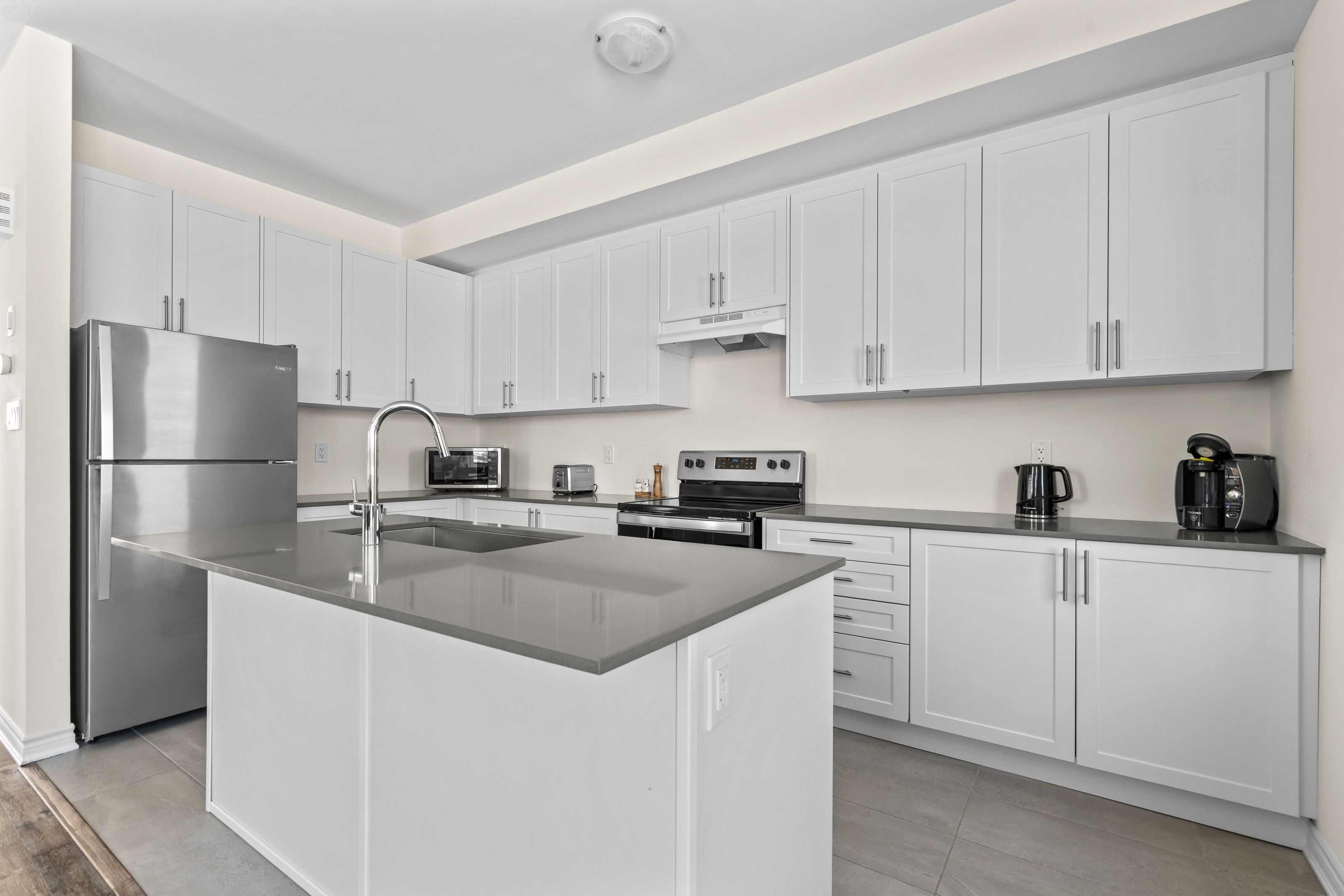 • Open-concept kitchen with upgraded cabinetry and quartz countertops.
