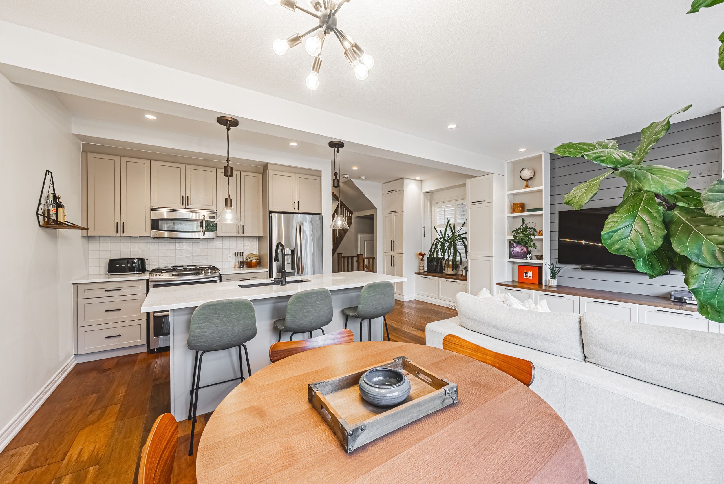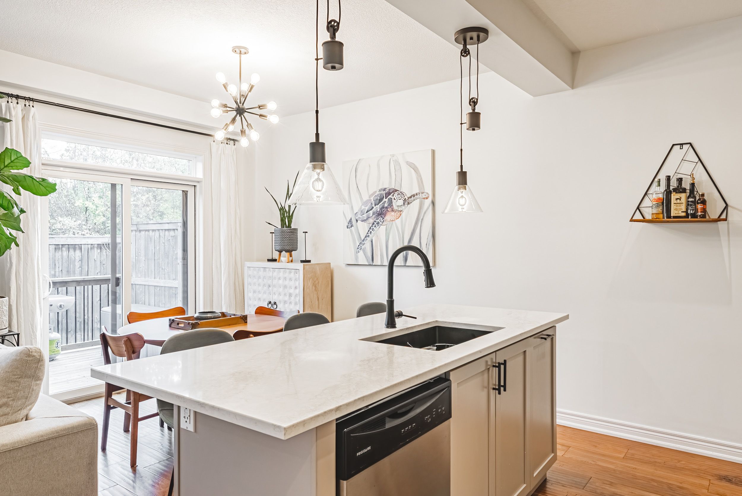 Introducing 83 southshore, a stunning freehold townhome located in the heart of stoney creek with lakefront access and luxurious upgrades throughout. Offering over 1500 sq ft of above-grade living space, this 3 bed, 2. 5 bath home is truly a gem. From the moment you walk in, pride of ownership is evident. The living room boasts custom built-ins, including a hidden appliance caddy, while the kitchen has been tastefully upgraded with quartz countertops, a designer backsplash (2025), stainless steel appliances, and a gas stove. Engineered hardwood flooring and pot lights run throughout the home - no carpet anywhere! Key upgrades include owned furnace, ac, and hot water heater. Laundry is conveniently located on the 2nd floor, complete with a built-in floor drain. The primary suite is a retreat, featuring his & her closets and a 4-piece ensuite. The backyard is perfect for entertaining, with a new deck (2025) and just steps from lake ontario. The basement includes a 3-piece rough-in and sump pump, ready for your personal touch. With an unbeatable location, 83 southshore is close to major highways, the confederation go station (operational in 2025), and offers quick connections to downtown toronto and niagara wine country. Enjoy serene lakefront living at ellie's beach (200m away) or explore the multi-million dollar revitalization of waterfront trails and recreational amenities at confederation beach park (under 1. 5km away). This freehold townhome includes a $120/month association fee covering snow removal and landscaping, ensuring peace of mind year-round. Don't miss this rare opportunity to own a luxurious home in such a coveted location. Book your viewing today and let's get moving!