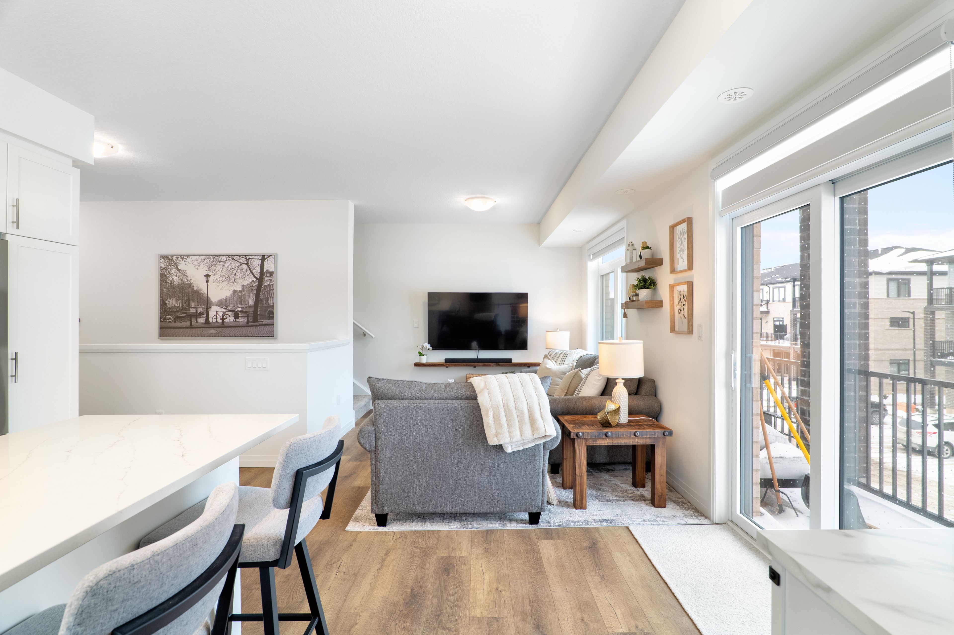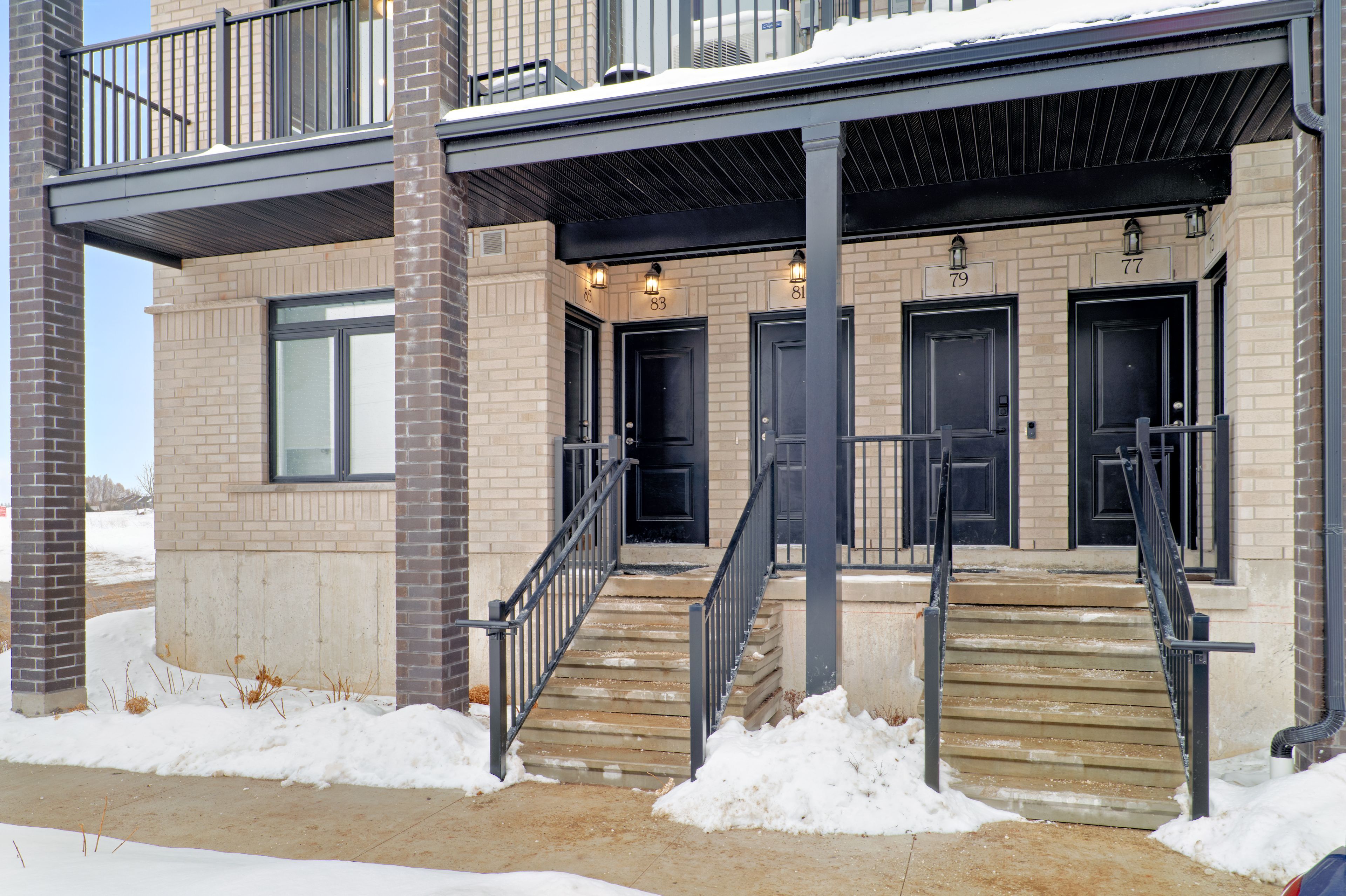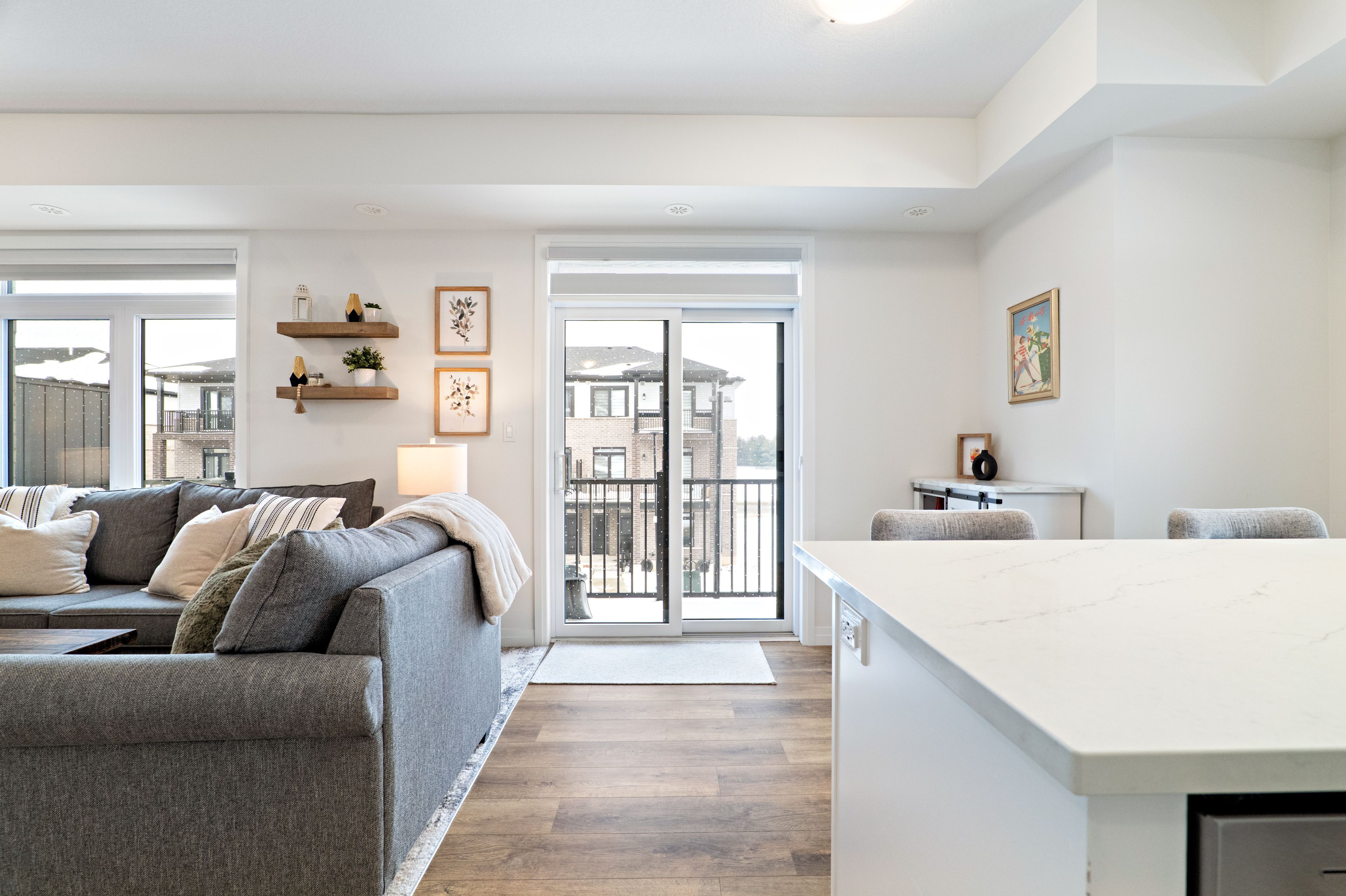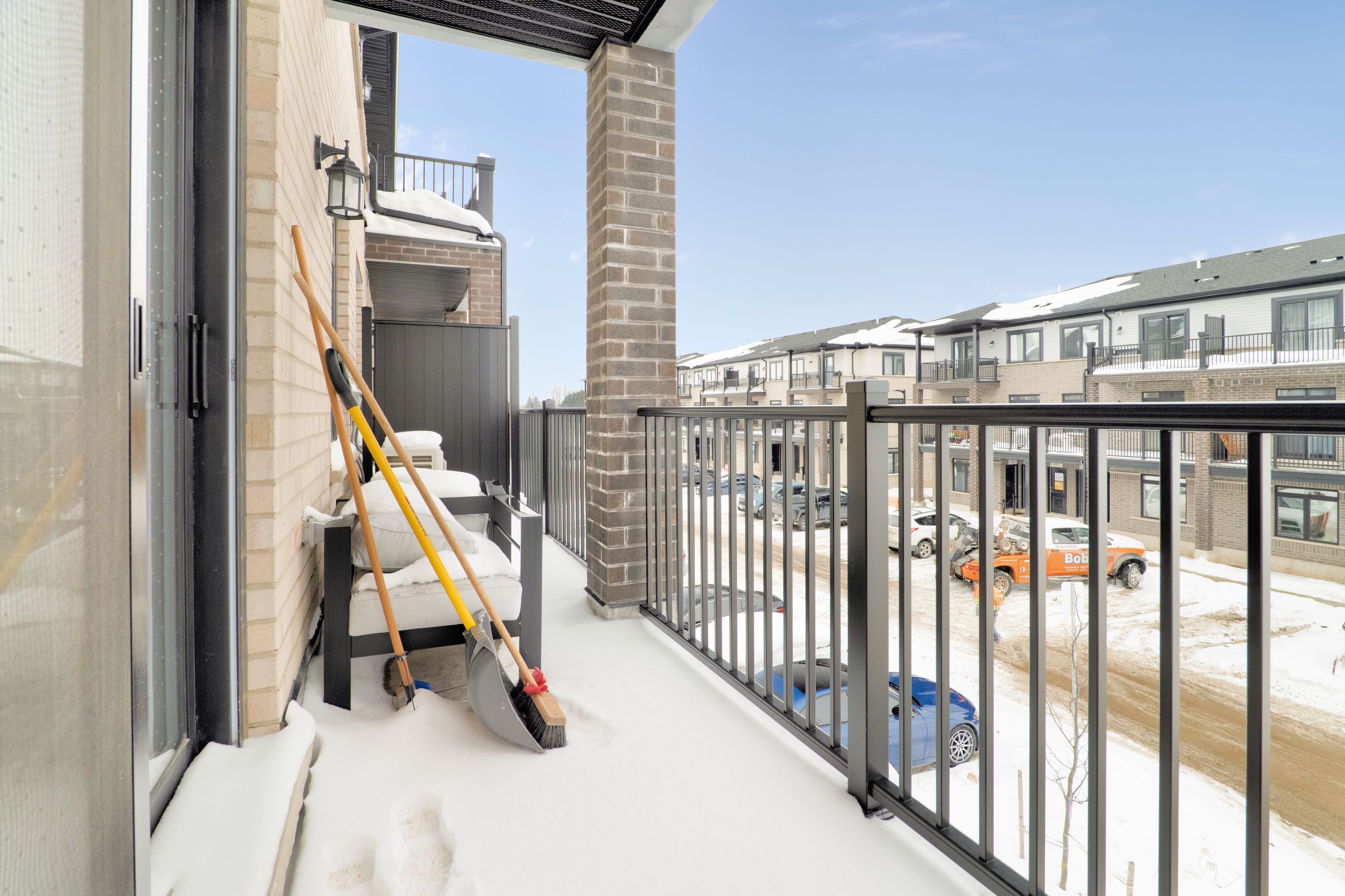 83 thatcher is a stunning end-unit townhome in fusion home's highly sought-after alister development. This prime location places you just minutes from the university of guelph, highway 401, and an abundance of shopping, dining, and everyday amenities. Upon entering, you are immediately welcomed by an abundance of natural light that fills the main floor, a defining feature of this end unit. Expansive windows and glass sliding doors leading to the private balcony create a bright, airy atmosphere throughout the main living space. The kitchen is thoughtfully designed, featuring a four-seat island, stainless steel appliances, sleek countertops, a dual sink, and ample cabinetry and prep space, perfect for both everyday living and entertaining. The living space is open concept to the kitchen, offering an ideal floor plan for entertaining or keeping an eye on young children. With main floor laundry, a convenient two-piece powder room for guests, and a spacious storage closet, this home is both practical and intention in its design. Upstairs, you will find a well-appointed four-piece bathroom and a versatile secondary bedroom, currently used as a home office. The primary bedroom serves as a bright and peaceful retreat, featuring its own private three-piece ensuite and a spacious walk-in closet. From its convenient location and the simplicity of a property with no outdoor maintenance, 83 thatcher invites you home.