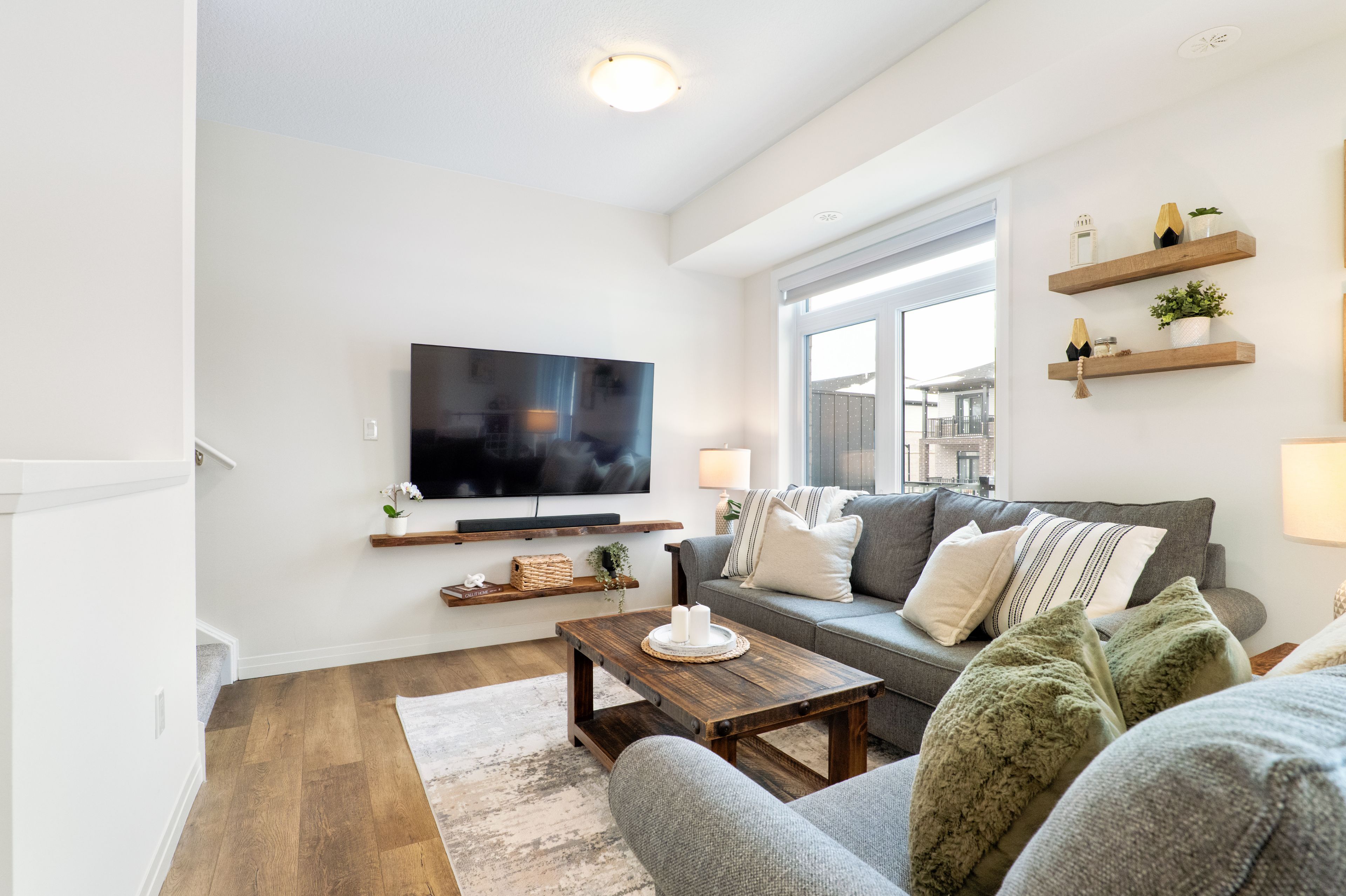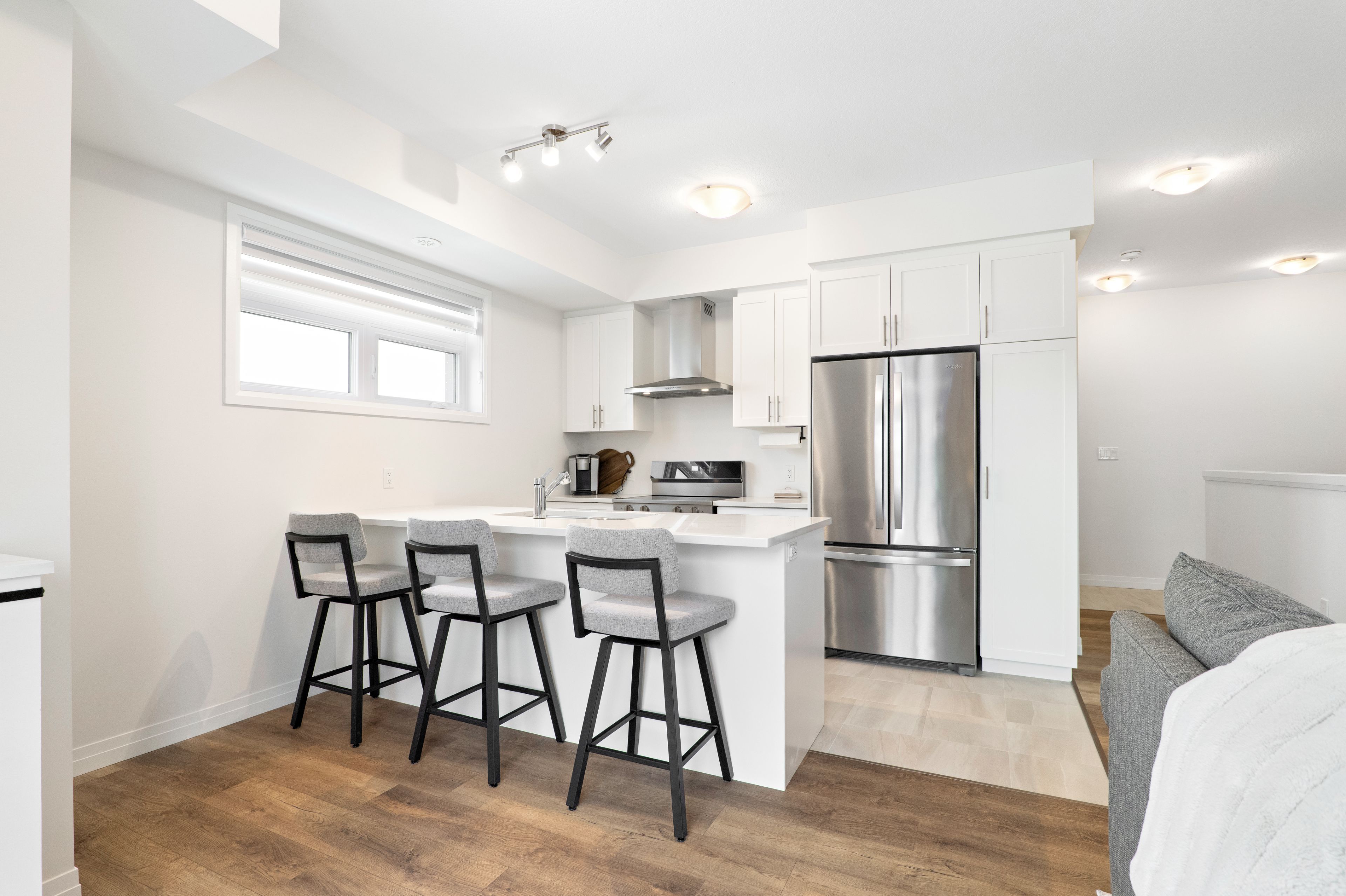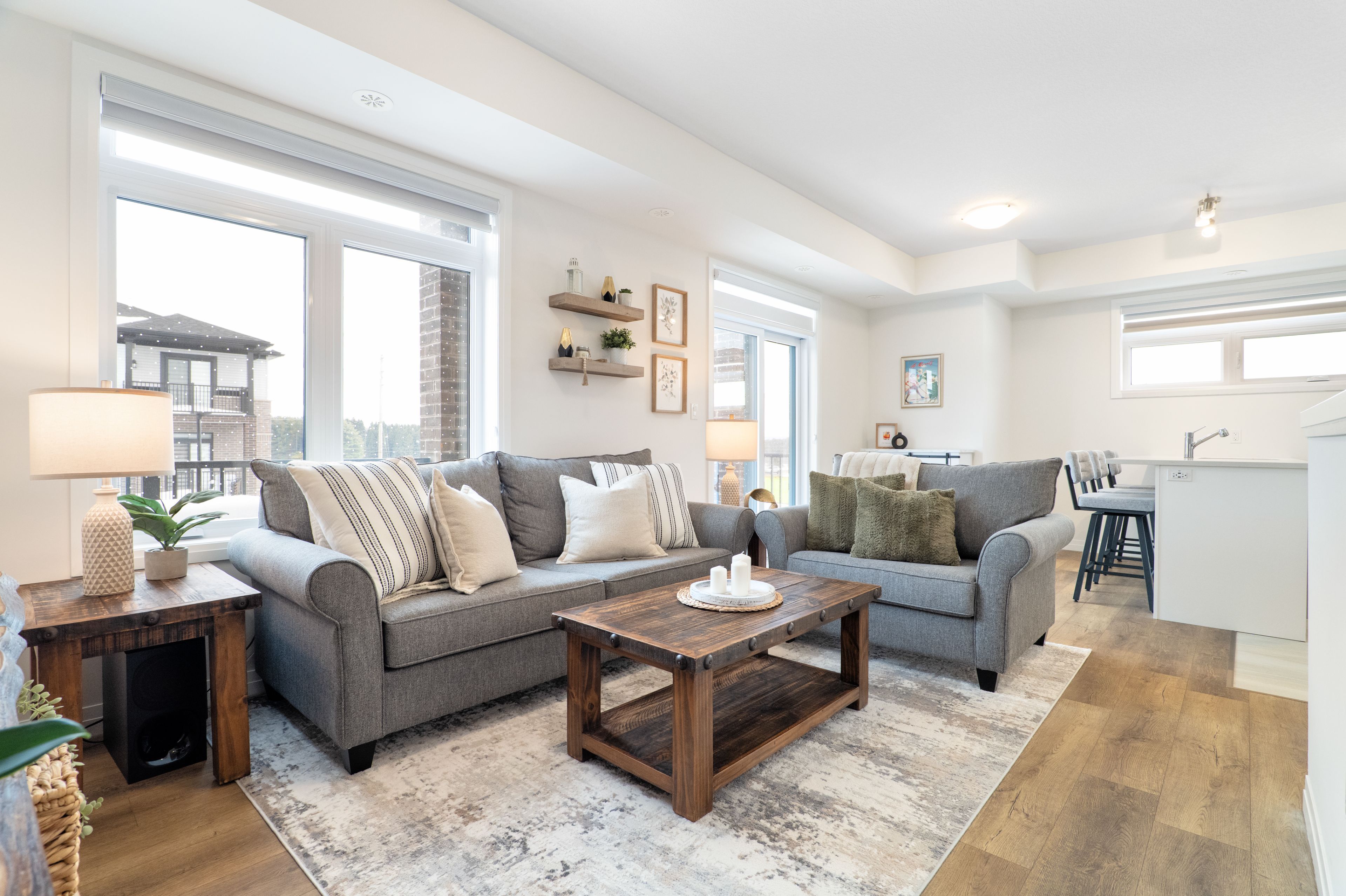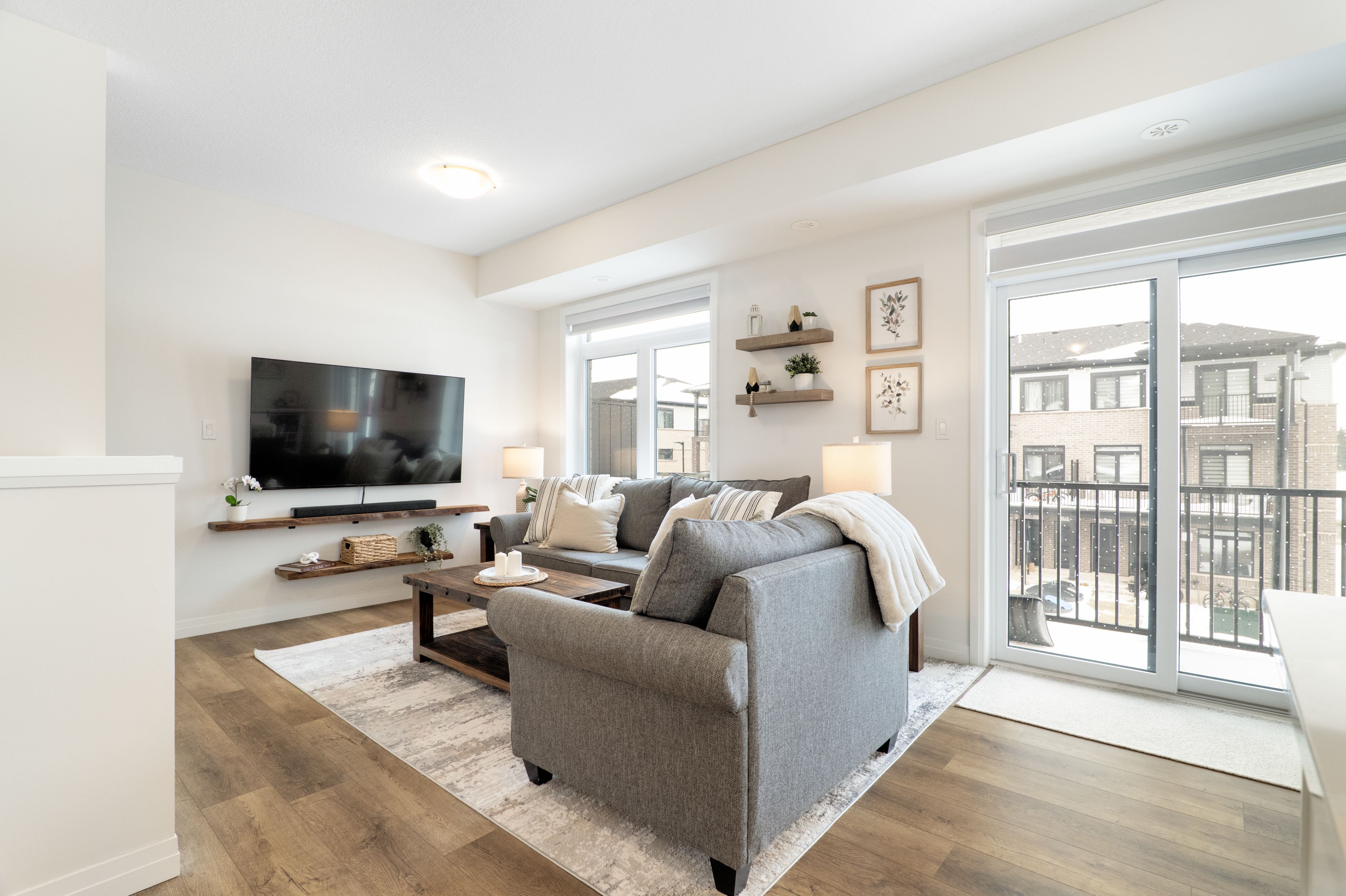 83 thatcher is a stunning end-unit townhome in fusion home's highly sought-after alister development. This prime location places you just minutes from the university of guelph, highway 401, and an abundance of shopping, dining, and everyday amenities. Upon entering, you are immediately welcomed by an abundance of natural light that fills the main floor, a defining feature of this end unit. Expansive windows and glass sliding doors leading to the private balcony create a bright, airy atmosphere throughout the main living space. The kitchen is thoughtfully designed, featuring a four-seat island, stainless steel appliances, sleek countertops, a dual sink, and ample cabinetry and prep space, perfect for both everyday living and entertaining. The living space is open concept to the kitchen, offering an ideal floor plan for entertaining or keeping an eye on young children. With main floor laundry, a convenient two-piece powder room for guests, and a spacious storage closet, this home is both practical and intention in its design. Upstairs, you will find a well-appointed four-piece bathroom and a versatile secondary bedroom, currently used as a home office. The primary bedroom serves as a bright and peaceful retreat, featuring its own private three-piece ensuite and a spacious walk-in closet. From its convenient location and the simplicity of a property with no outdoor maintenance, 83 thatcher invites you home.