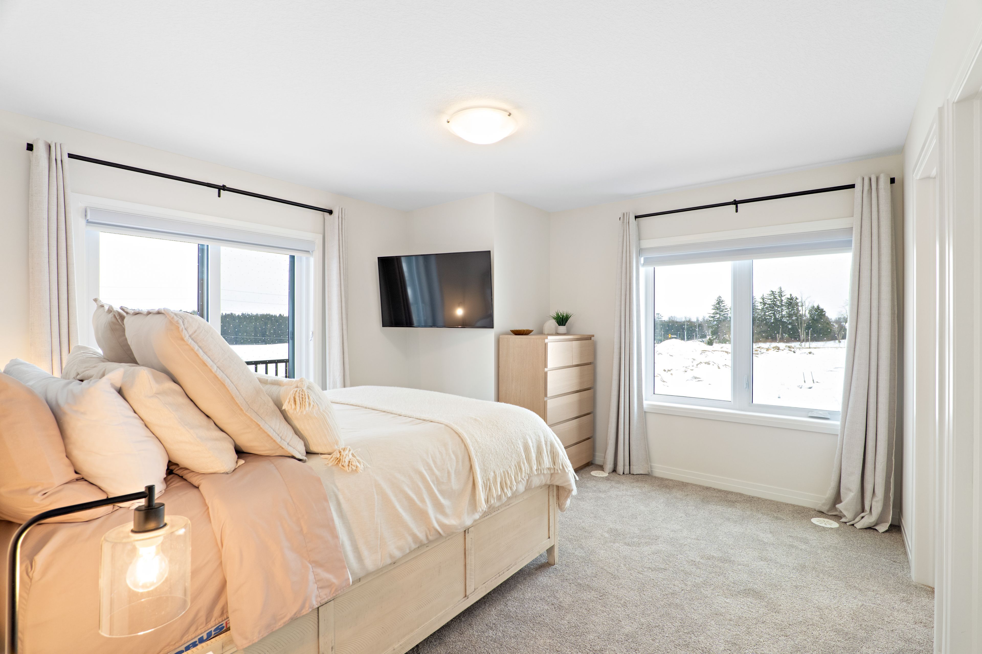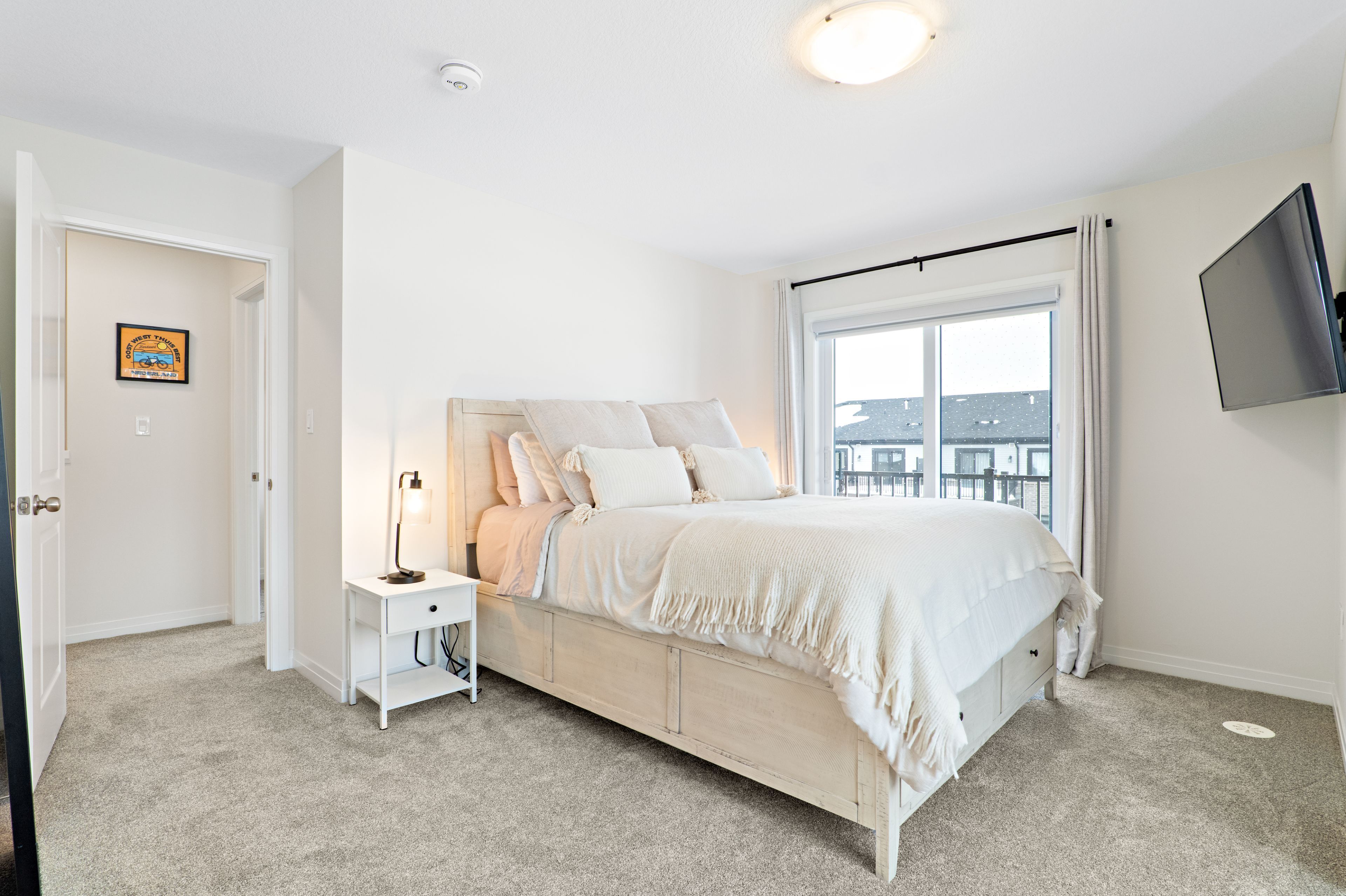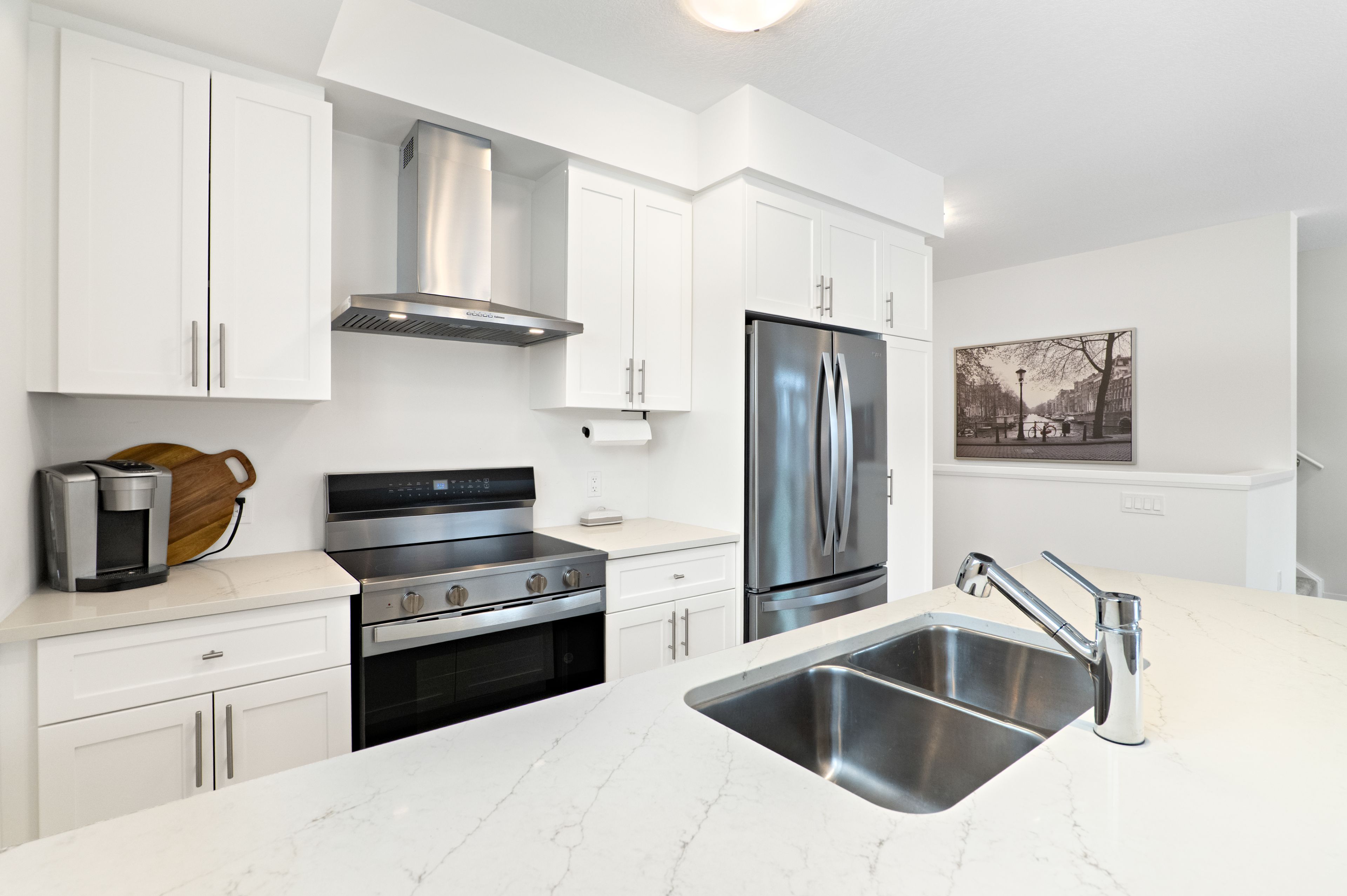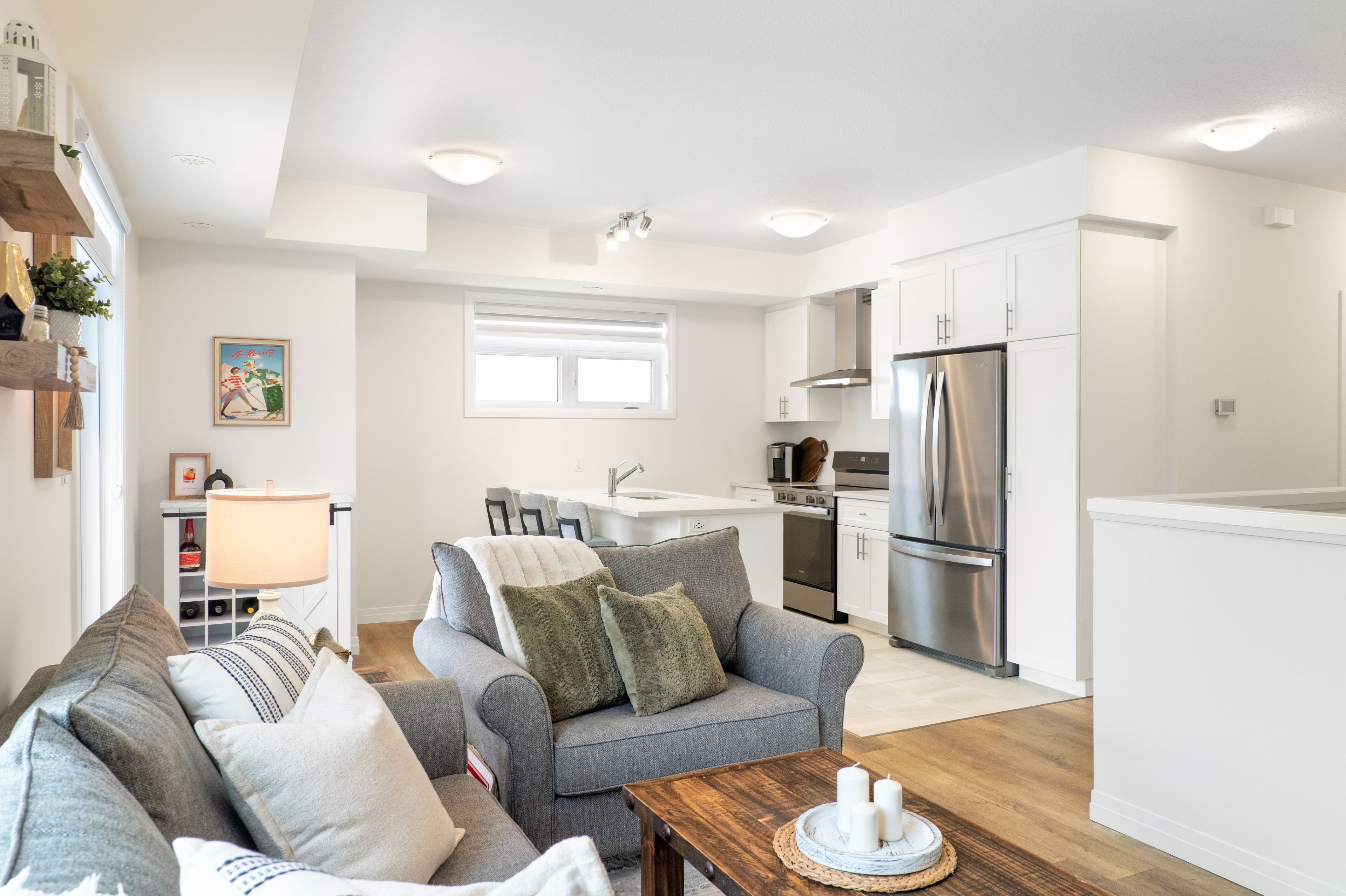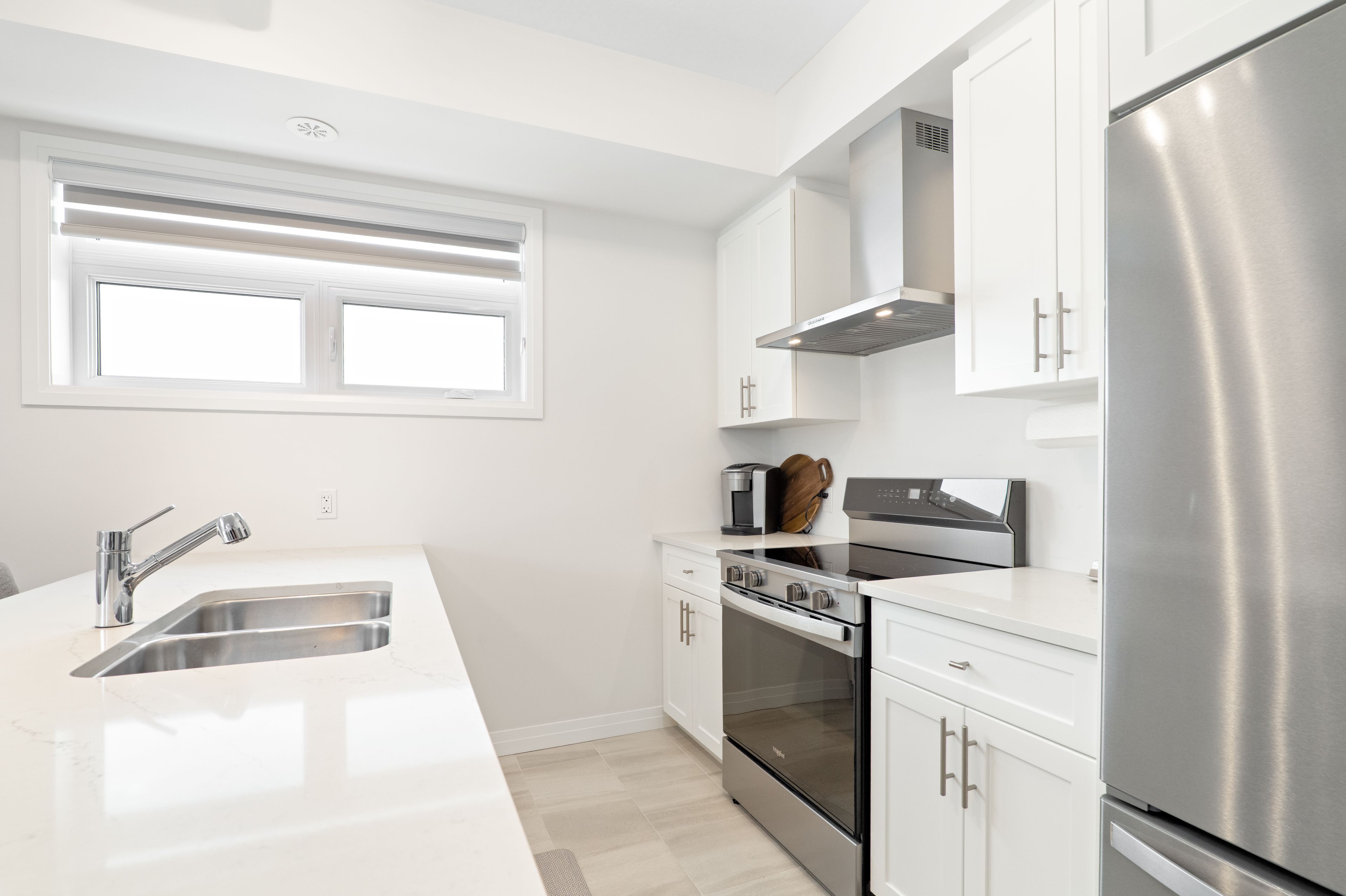 83 thatcher is a stunning end-unit townhome in fusion home's highly sought-after alister development. This prime location places you just minutes from the university of guelph, highway 401, and an abundance of shopping, dining, and everyday amenities. Upon entering, you are immediately welcomed by an abundance of natural light that fills the main floor, a defining feature of this end unit. Expansive windows and glass sliding doors leading to the private balcony create a bright, airy atmosphere throughout the main living space. The kitchen is thoughtfully designed, featuring a four-seat island, stainless steel appliances, sleek countertops, a dual sink, and ample cabinetry and prep space, perfect for both everyday living and entertaining. The living space is open concept to the kitchen, offering an ideal floor plan for entertaining or keeping an eye on young children. With main floor laundry, a convenient two-piece powder room for guests, and a spacious storage closet, this home is both practical and intention in its design. Upstairs, you will find a well-appointed four-piece bathroom and a versatile secondary bedroom, currently used as a home office. The primary bedroom serves as a bright and peaceful retreat, featuring its own private three-piece ensuite and a spacious walk-in closet. From its convenient location and the simplicity of a property with no outdoor maintenance, 83 thatcher invites you home.