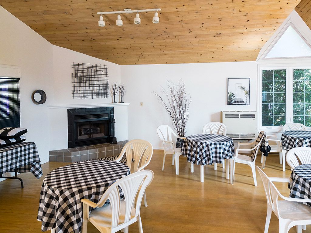 • Bright living area with gas fireplace and large sliding doors.
