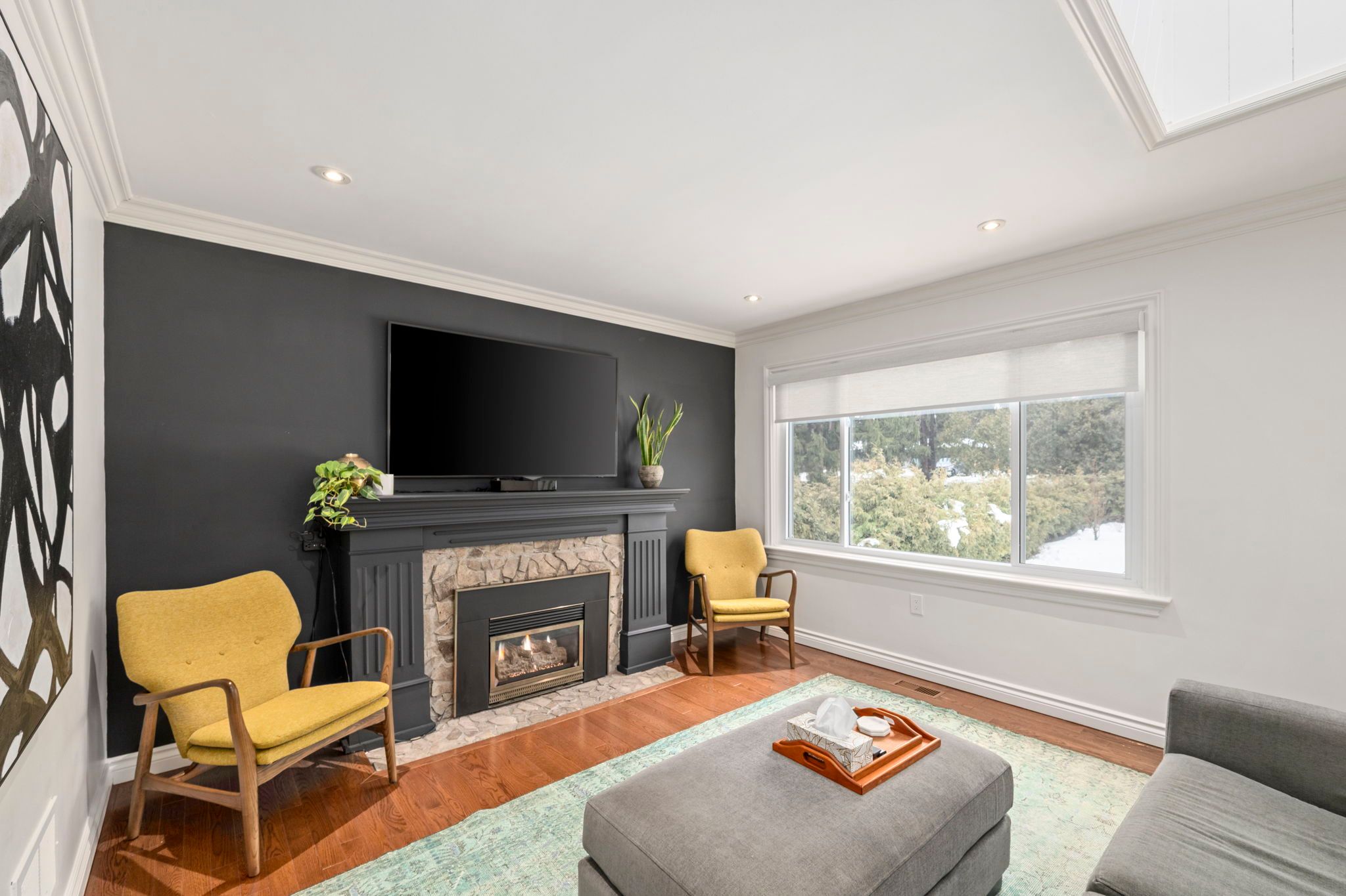 • Cozy gas fireplace and rich hardwood flooring enhance comfort.