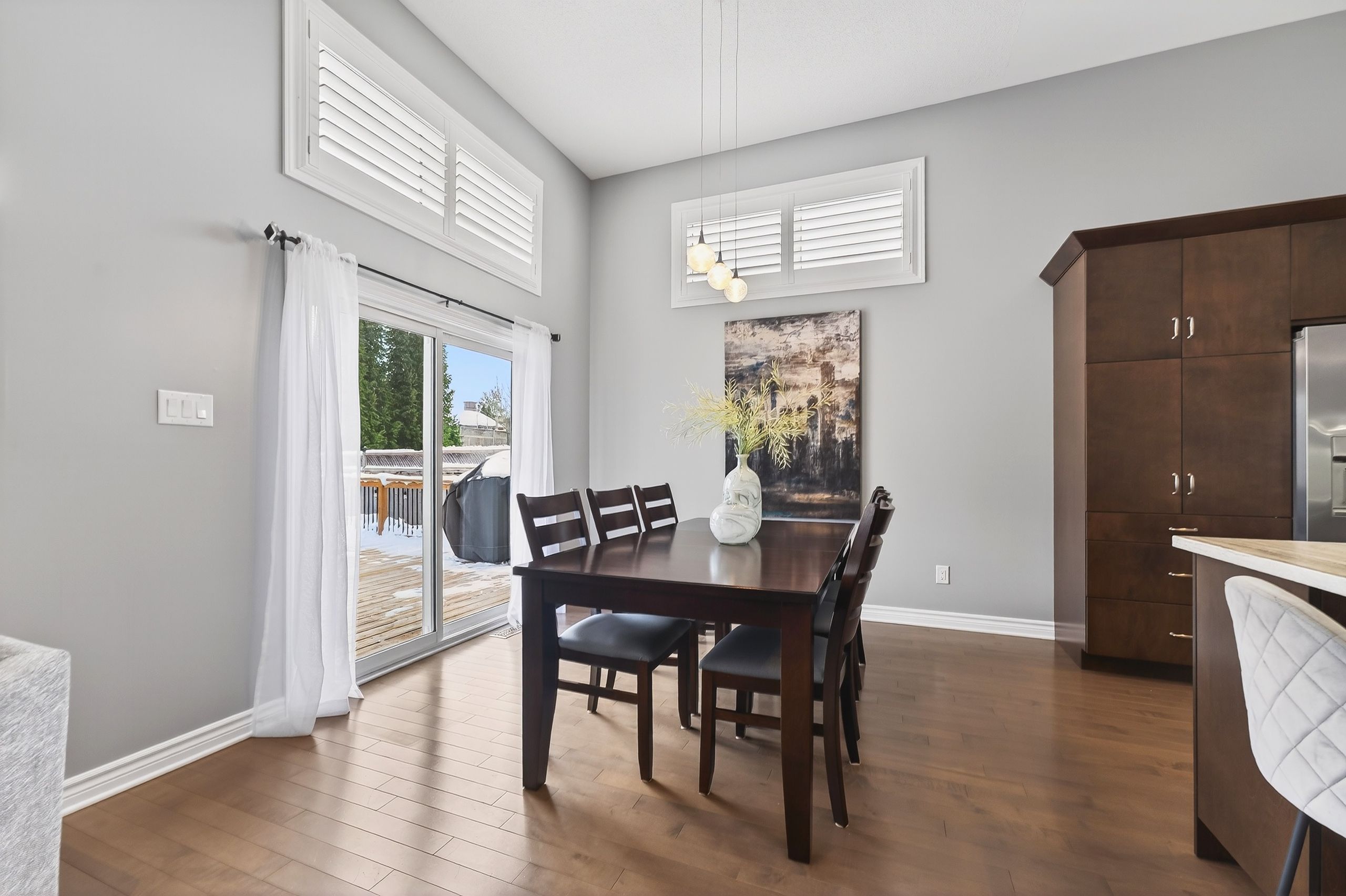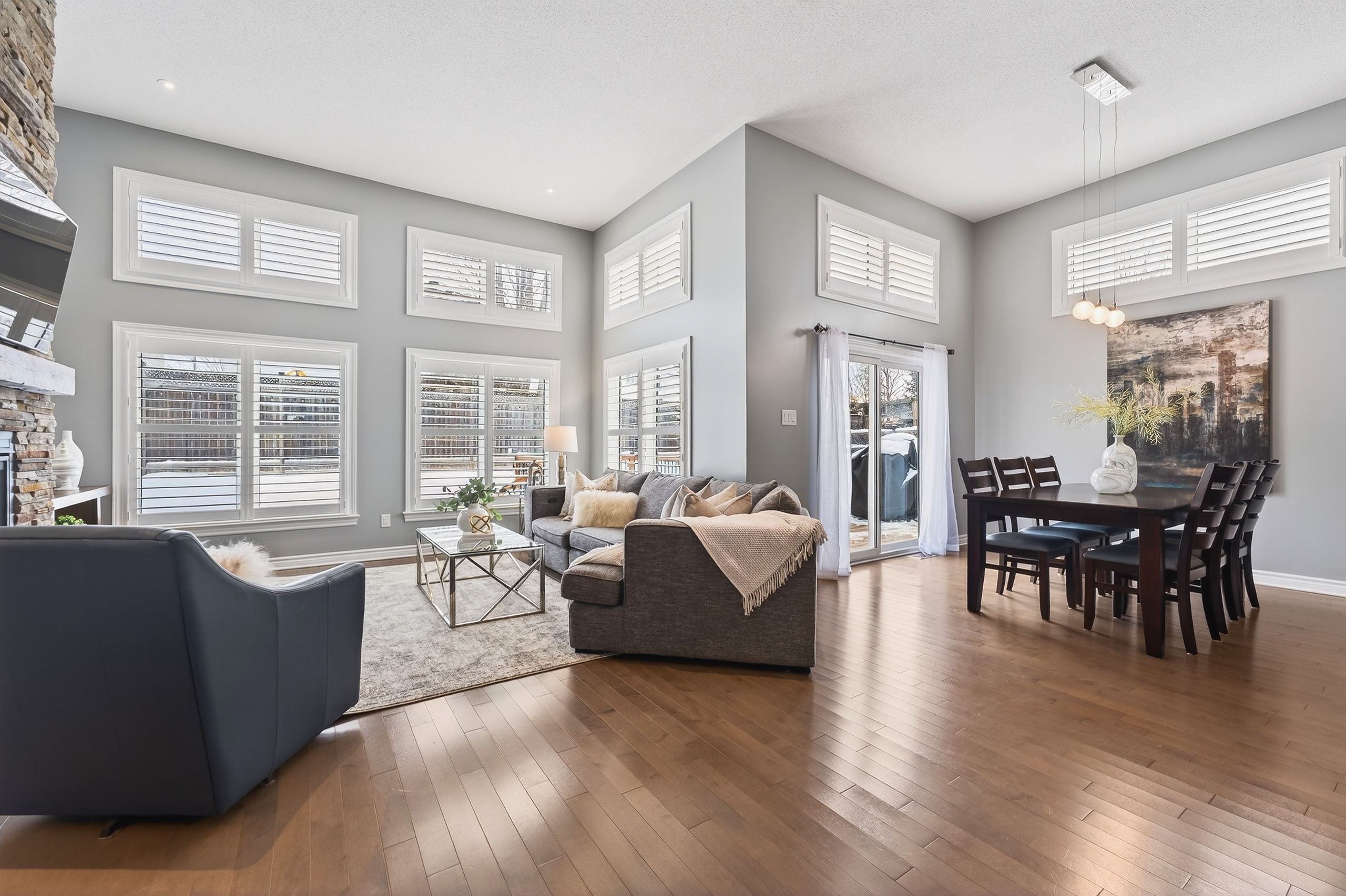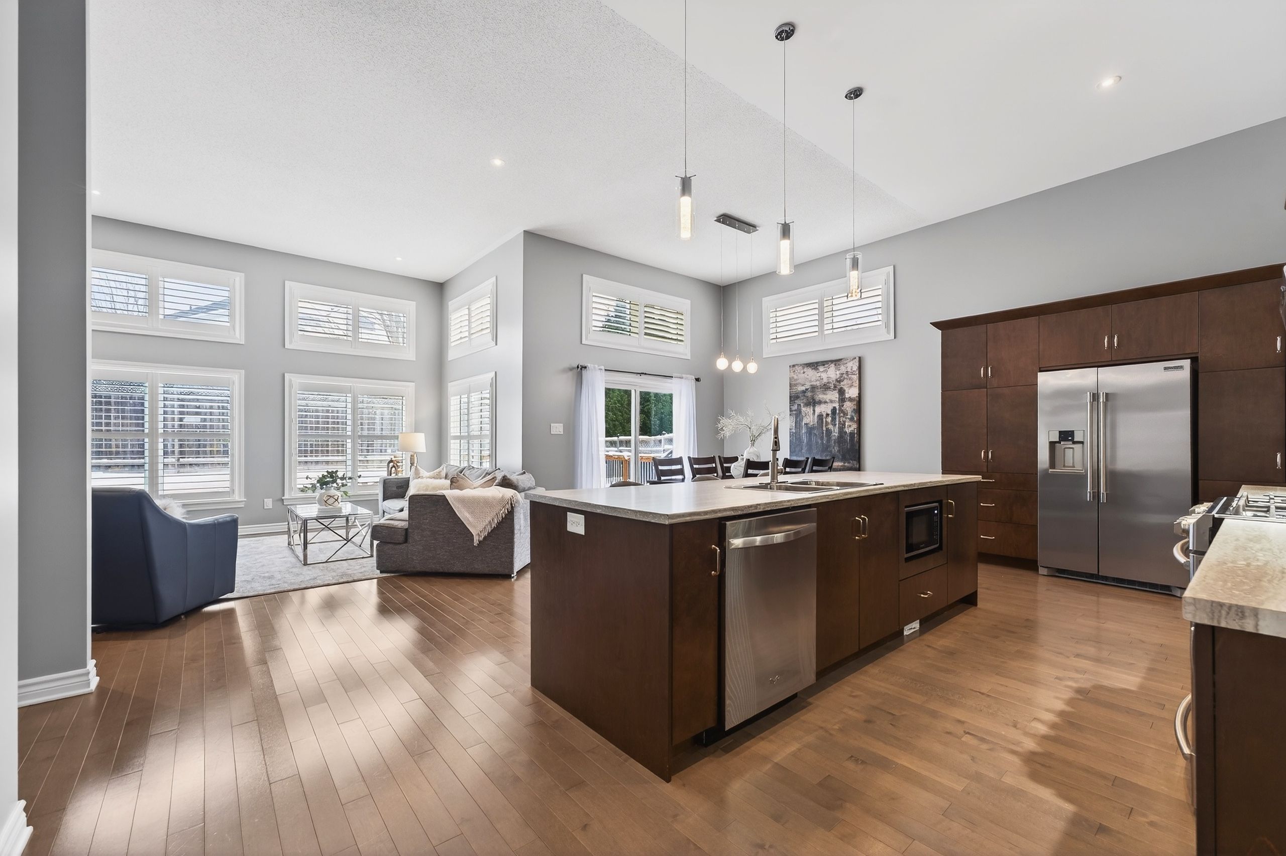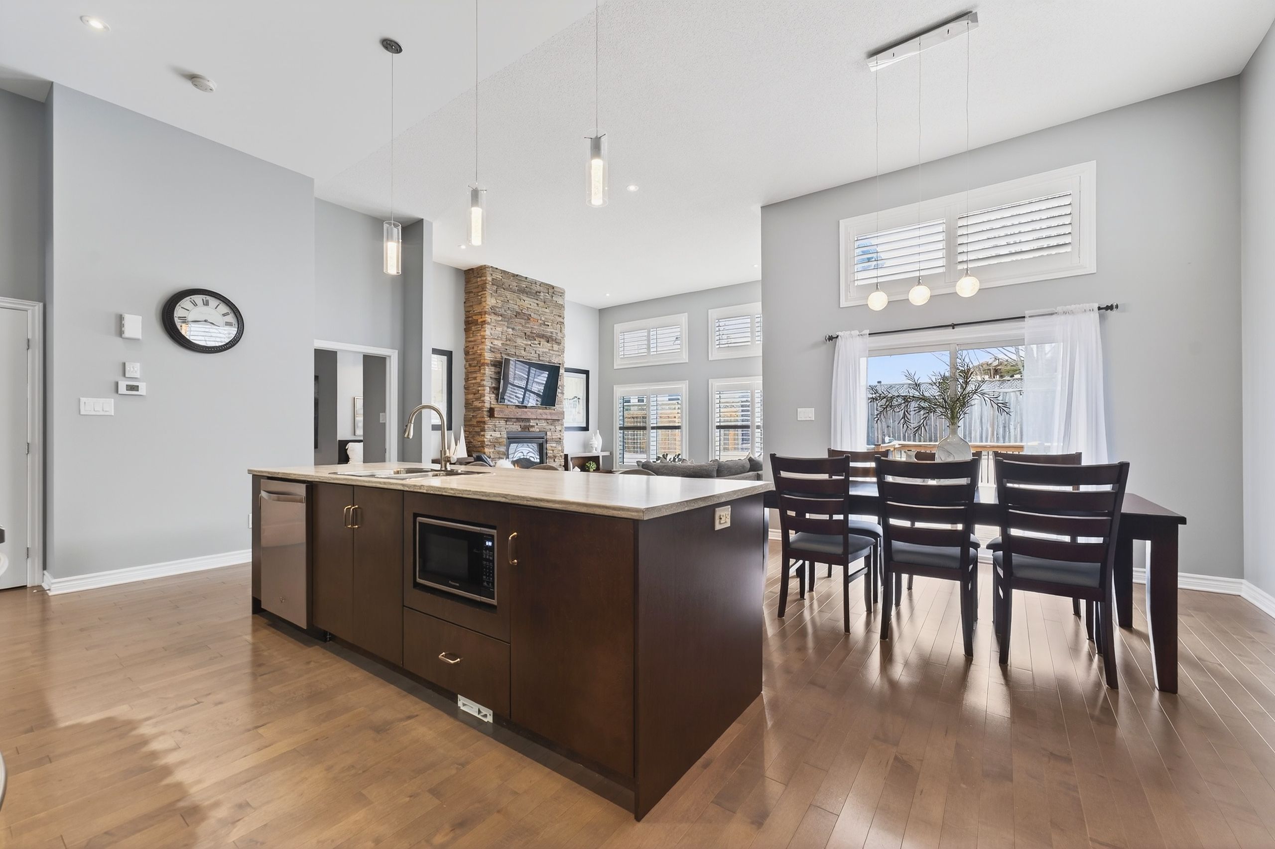 Welcome to 834 rockson crescent - a highly sought-after custom-built metric home offering 3+1 bedrooms and 3 full bathrooms, thoughtfully designed for both comfort and style. From the moment you enter, you're greeted by a bright and inviting foyer with tiled flooring that transitions seamlessly into rich hardwood throughout the main living space. Soaring 12-foot cathedral ceilings create an airy, open atmosphere that enhances the home's natural light and architectural presence. The open-concept kitchen and living area is beautifully appointed with elegant window shutters, a striking natural gas stone fireplace, and a functional island with abundant counter space. A rare oversized walk-in pantry provides exceptional storage and everyday convenience. The main level also features convenient laundry, inside access to the garage, neutral tones throughout, two linen closets, and three generously sized bedrooms. The serene primary retreat offers 9-foot ceilings, a walk-in closet, and a spa-inspired ensuite complete with double sinks, a spacious walk-in shower, and slate-colored ceramic flooring. Upgrades include 33" doors for mobility (with exception of 2 front bedrooms). Enhanced soundproof insulation in select main-floor walls and the lower level adds an extra layer of comfort and privacy. The finished lower level, complete with berber carpeting, includes a fourth bedroom with a generous closet, a full 3-piece bathroom, and a large recreation room ideal for a home gym, media space, or flexible family living. Lower level has rough-in for wet bar or kitchenette. Step outside to an expansive back deck perfect for summer entertaining, along with a functional patio area and fully fenced backyard for added privacy. This property offers a seamless blend of functionality, warmth, and timeless appeal in a desirable neighborhood of stittsville on a private crescent.