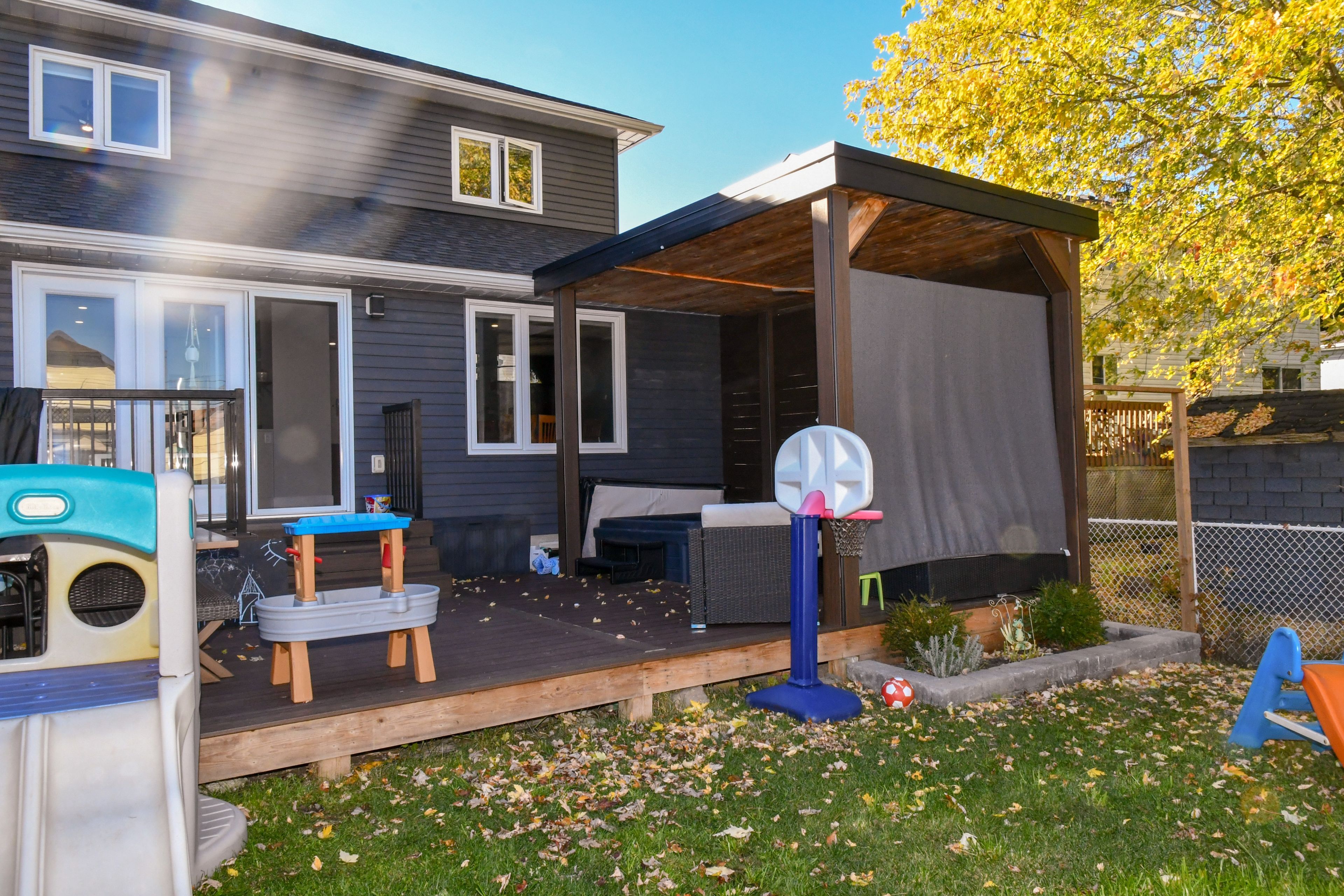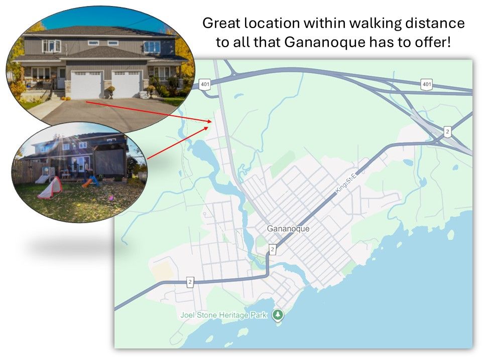 Located in a quiet area of gananoque and seconds to highway 401, this 2020-built semi-detached home combines modern luxury with small-town charm. Featuring high-end finishes throughout, and a main floor 4th bedroom perfect for use as an office/guest room is an ideal find for families, professionals, or retirees. Step inside to discover a spacious open-concept layout. The large kitchen boasts quartz countertops, high-end appliances, a breakfast bar, and flows seamlessly into the living and dining areas. Enjoy the warmth of the cozy fireplace from every angle of this central living space. Step outside onto the expansive deck, ideal for barbecues and gatherings. Relax year-round in the built-in and covered hot tub; an evening retreat like no other. The backyard offers plenty of space for play, a storage shed, and lush green lawn for games and gardening. Upstairs, you'll find three generously sized bedrooms, including a large primary suite with a walk-in closet and luxury shower. In the basement is an all black media room perfect for movie nights, a rec room and an office space. The garage has been partially converted into a gym. This home is perfectly located close to schools, two golf courses, shorelines casino, 1000 islands boat tours, and gananoque's vibrant waterfront with parks, beaches, splash pad, and outdoor entertainment. You're just minutes from the 1000 islands parkway and scenic walking trails, as well as the local rec center with indoor and outdoor hockey rinks, basketball court, tennis and pickleball courts, and soccer fields. A short 20-minute drive brings you to charleston lake provincial park and other nature trails, and you're just 20 minutes from kingston. Gananoque offers an incredible quality of life and 835 queen street delivers it all in style. Book your private showing today and see why this is the perfect property in the perfect location.