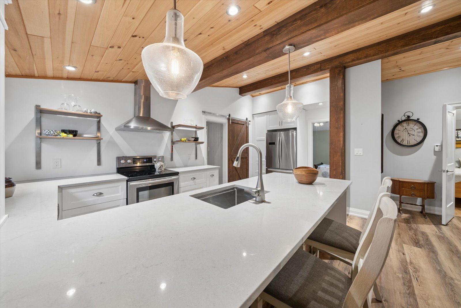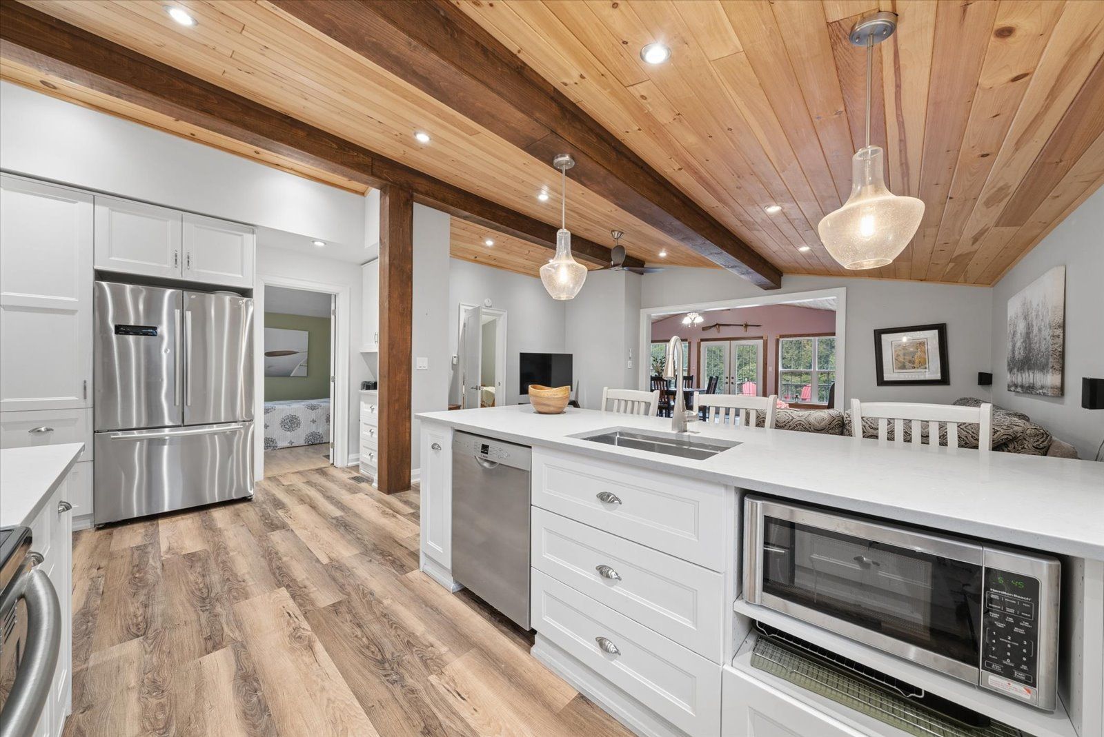 • Stylish renovated kitchen with open sightlines to the family room.