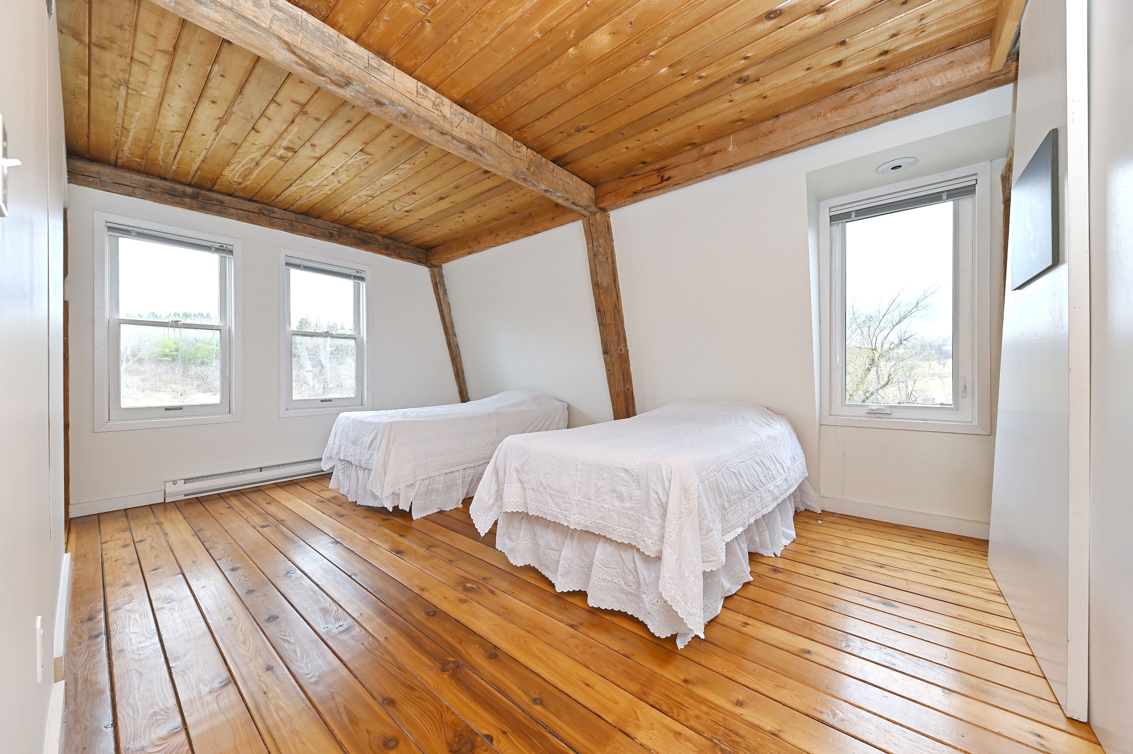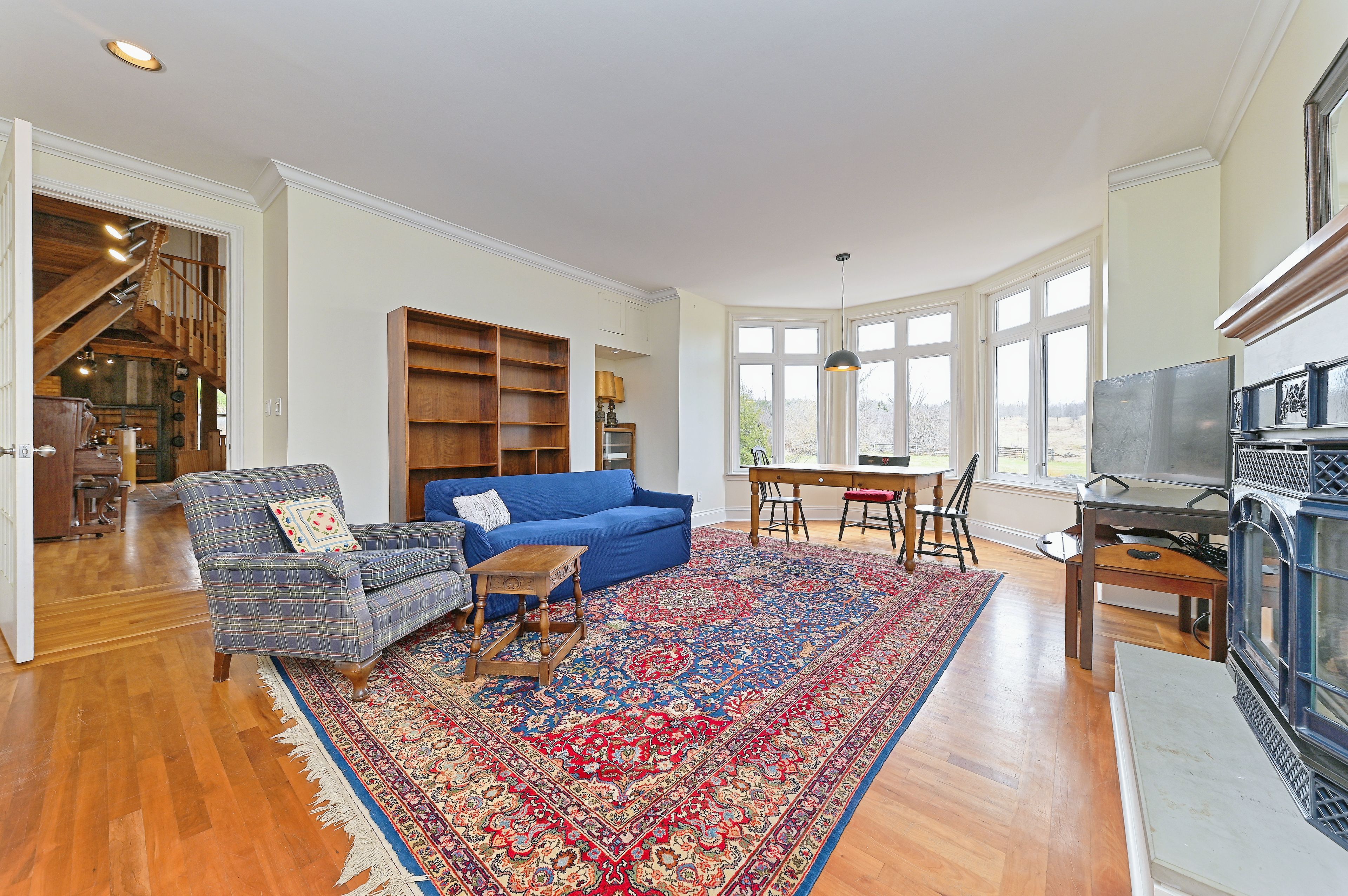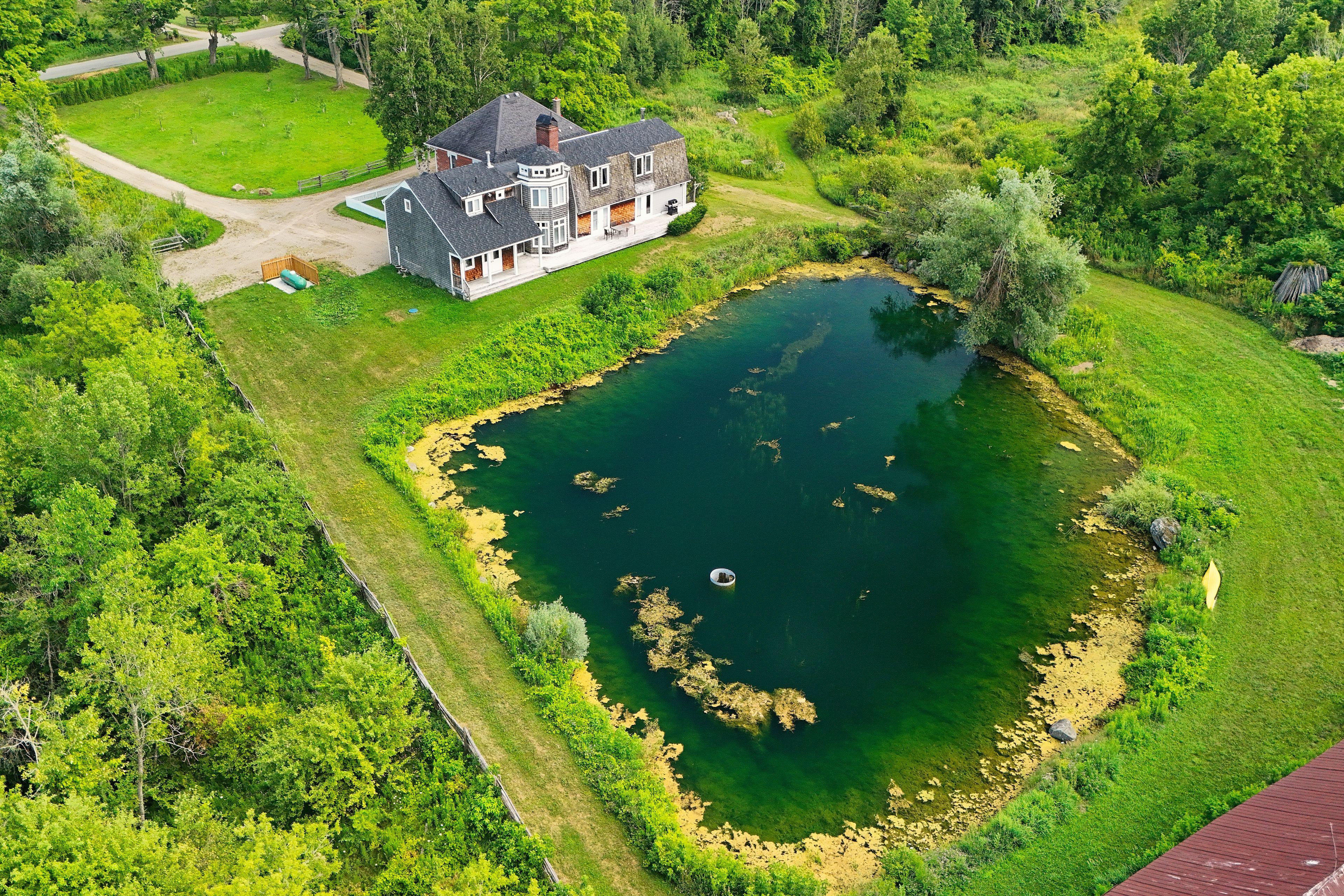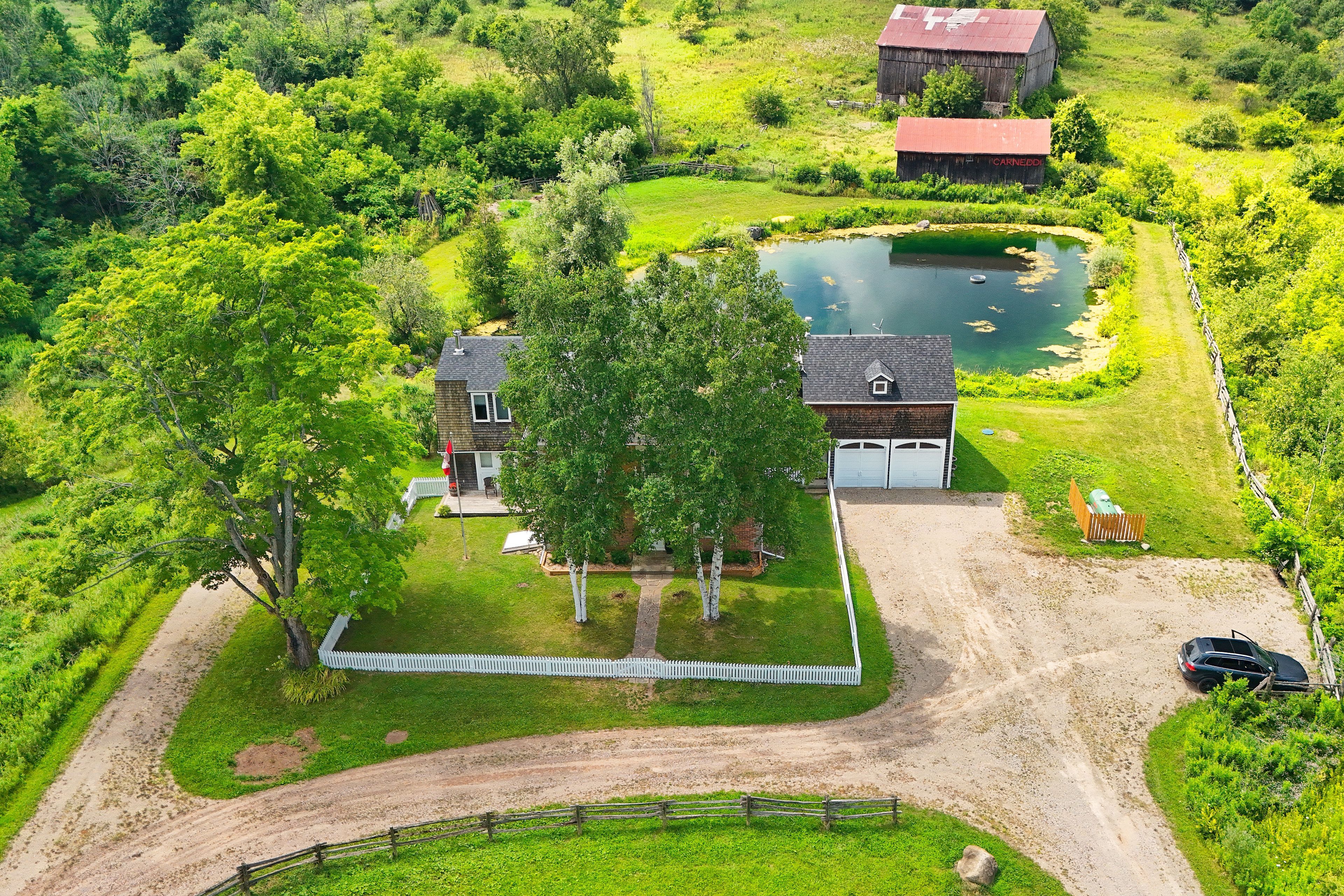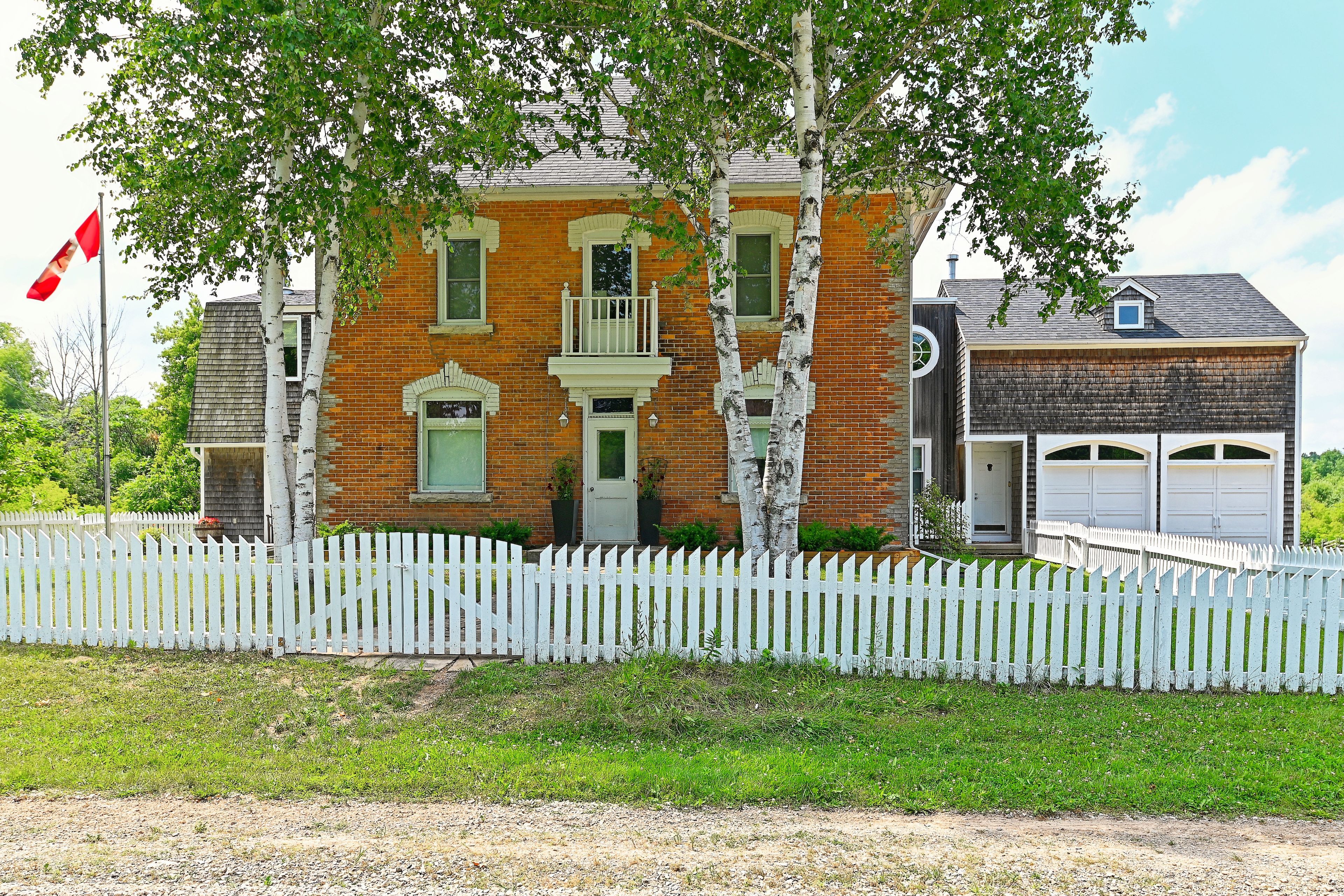 Set on 79 acres in the rolling countryside of mulmur, carneddi farm, a welsh term meaning place of stones, is one of those rare places - substantial, a family gathering place, and full of possibility. With its classic brick exterior, generous two-storey layout, and tree-lined private approach to the front white picket fence, this is a property that feels both established and deeply welcoming from the moment you arrive. A circular drive, ample parking, and an attached two-car garage make coming and going easy, whether you are hosting family for the weekend, welcoming guests for a holiday gathering, or simply returning home after a day spent outdoors. Built with a nod to traditional ontario agricultural buildings the inside features of barn beams, substantial baseboards, clear hardwood floors and original window moldings all take you back in time. But all of the conveniences, upper floor laundry, huge primary suite with dressing room, 4 piece ensuite, all overlooking the spring-fed pond make living with a sense of history easy. A large open-concept kitchen and great room with soaring ceilings and a walk-out deck and separate living room, dining room makes this a very easy place to spend time with a large group of friends and family. And don't forget to walk the trails while you are there - they are expansive and varied; rolling terrain through the apple trees takes you back to the old growth forest with stream. Inside and out, this a magical place to be.
