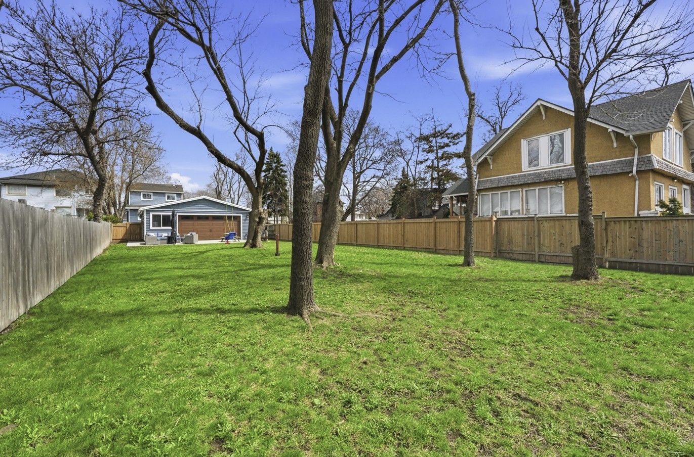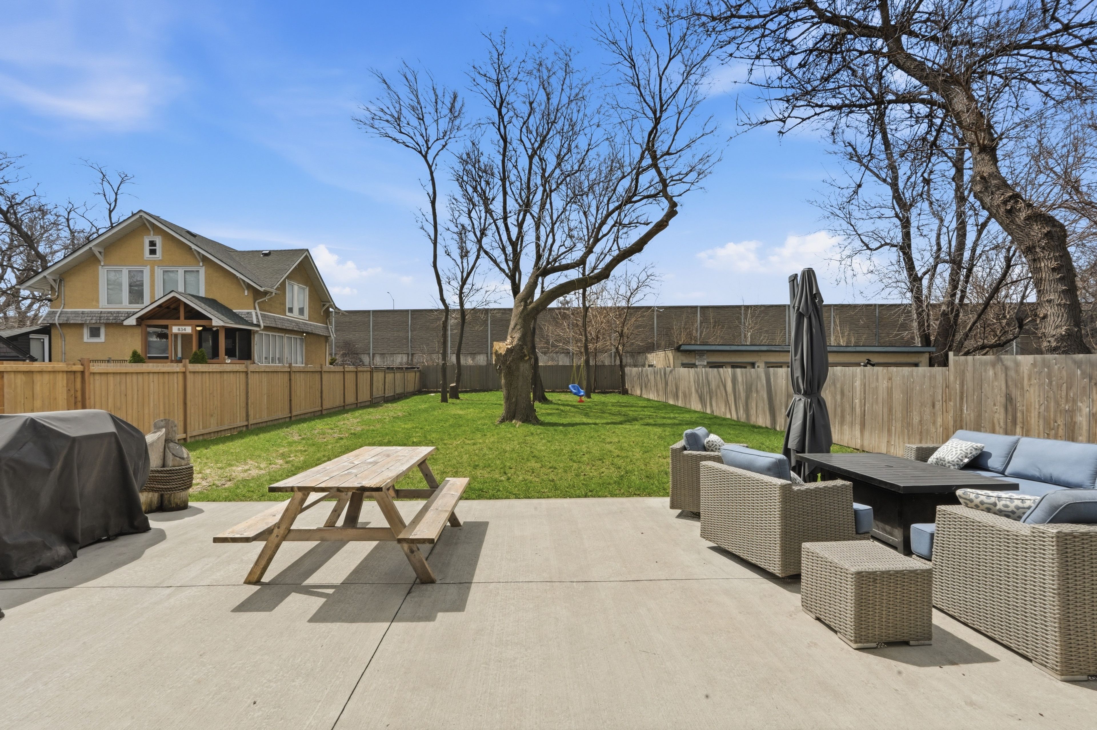 • Spacious fenced backyard featuring a concrete patio for outdoor activities.
