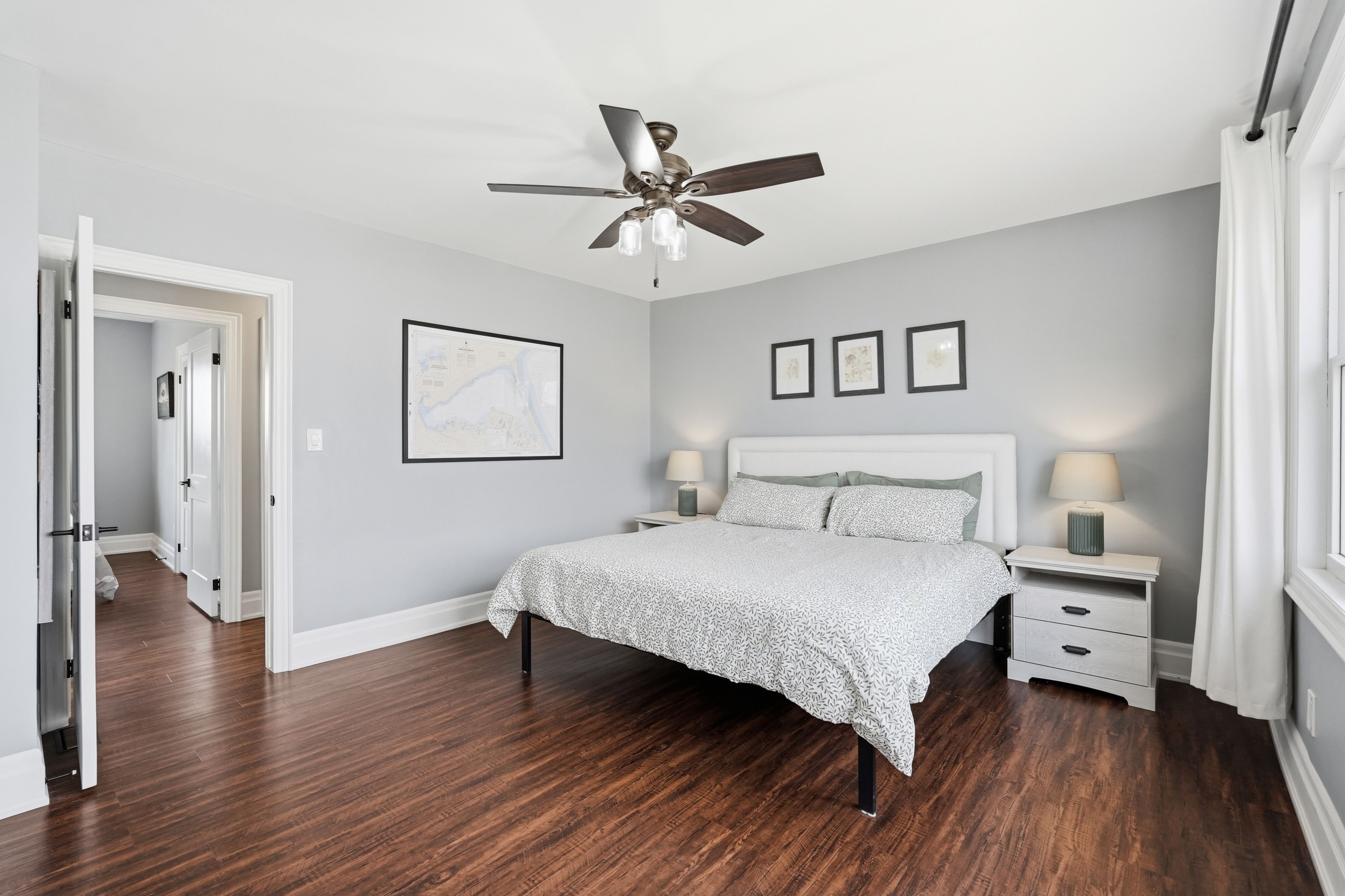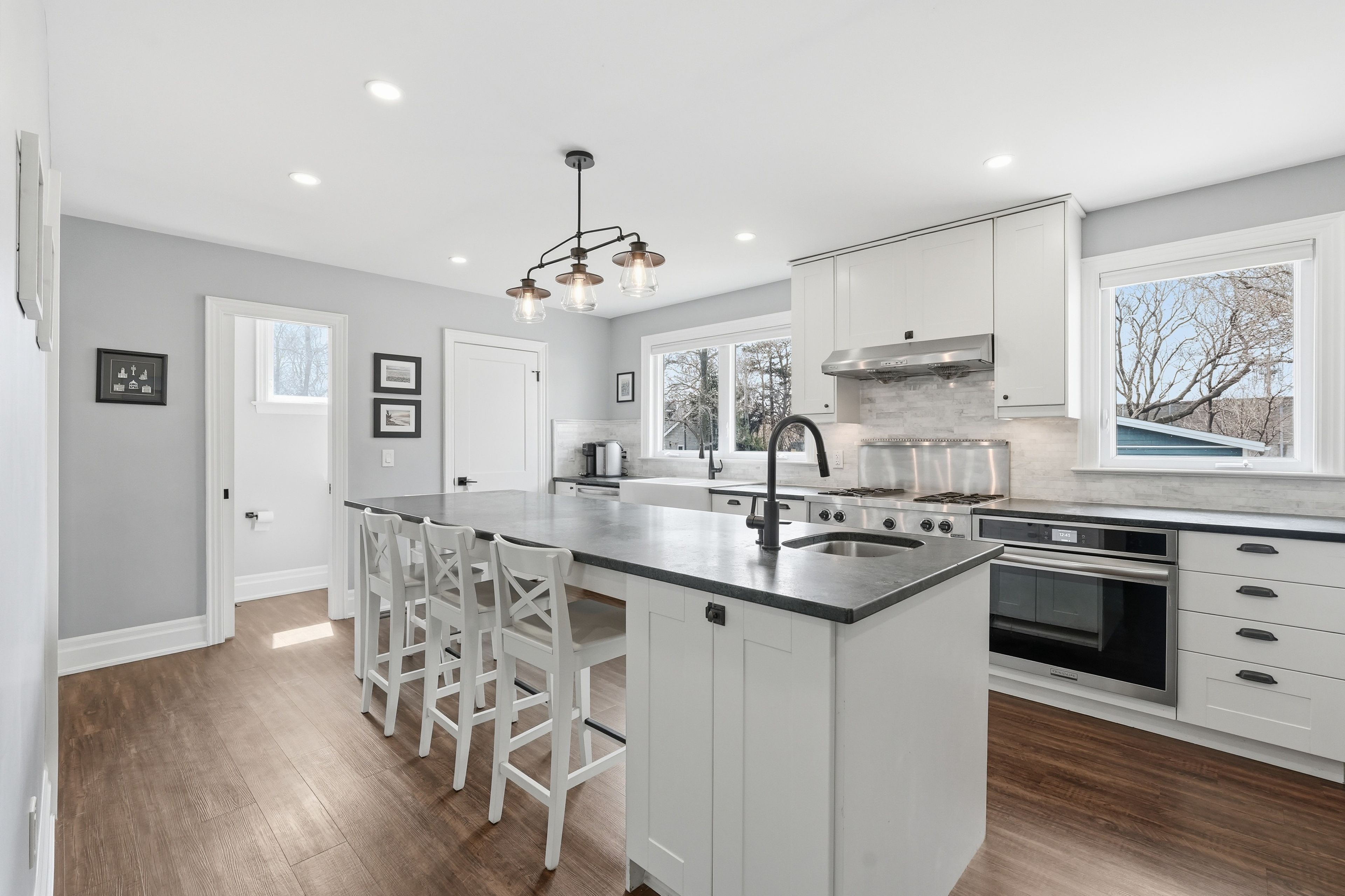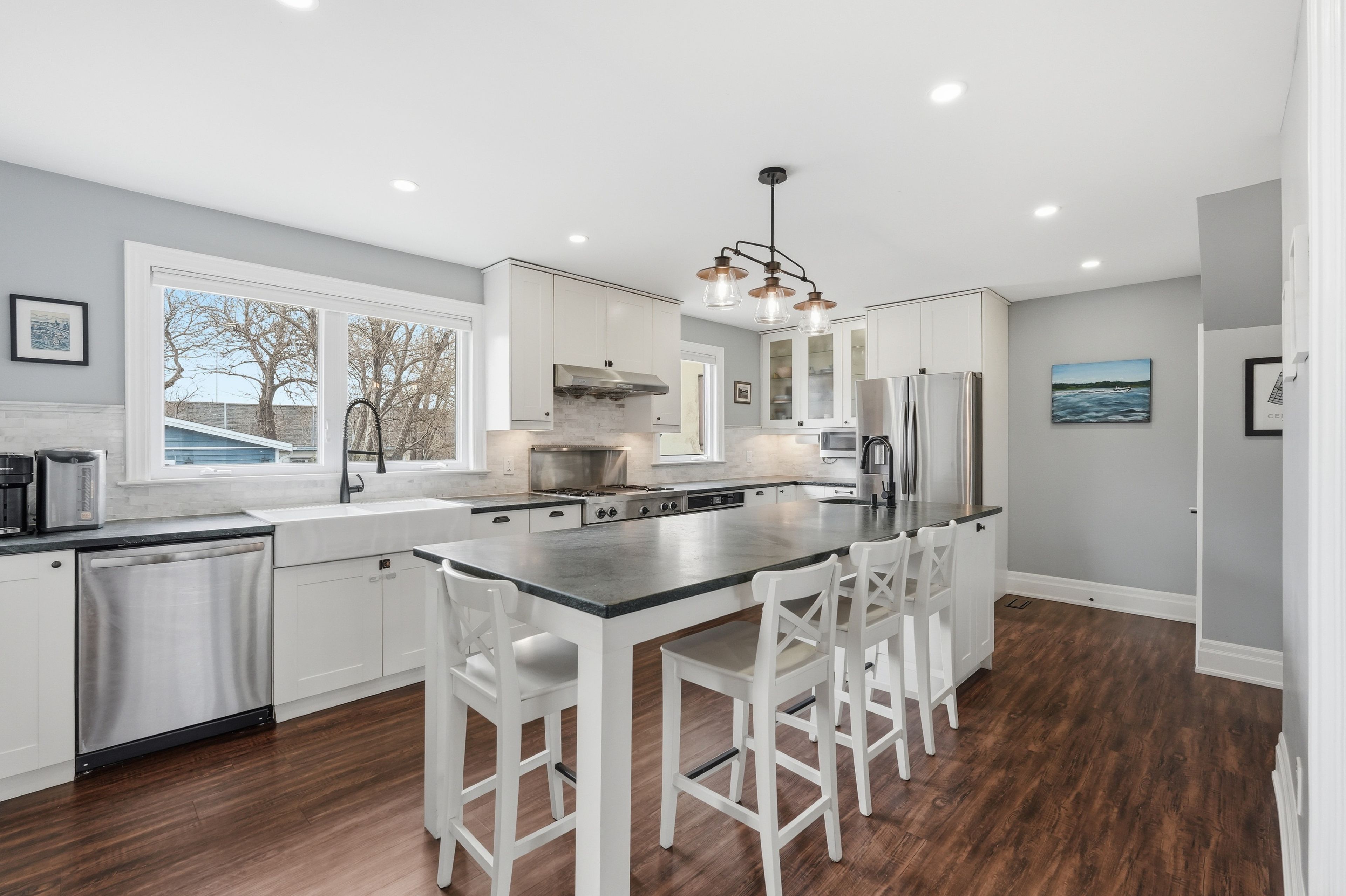Perfectly positioned across from lake ontario, this thoughtfully renovated beach strip home offers an exceptional lifestyle just steps to the waterfront trail and sandy beach. Extensively updated and meticulously maintained a true turn-key opportunity. Inside, rich dark floors and a warm, cohesive palette set the tone. The inviting living room centres around a beautiful gas fireplace with shiplap surround and wood mantle. The chef-inspired kitchen features white shaker cabinetry, marble subway tile, leathered stone countertops, a farmhouse sink, professional gas range, and a generous island with seating and walk-in pantry. Full renovation completed december 2020. Three well-appointed bedrooms are served by a beautifully updated main bathroom featuring subway tile, soaker tub, and matte black fixtures. The basement presents a spacious open rec room , storage with excellent potential and separate side entrance. The detached 30'x30' garage (built 2023) is a standout 8ft doors, 100-amp panel, heating and cooling, finished with pot lights and built-in storage. Ideal as a garage, gym, studio, or workshop. Huge fully fenced in backyard complete with concrete patio! Minutes to confederation beach park and the qew.
