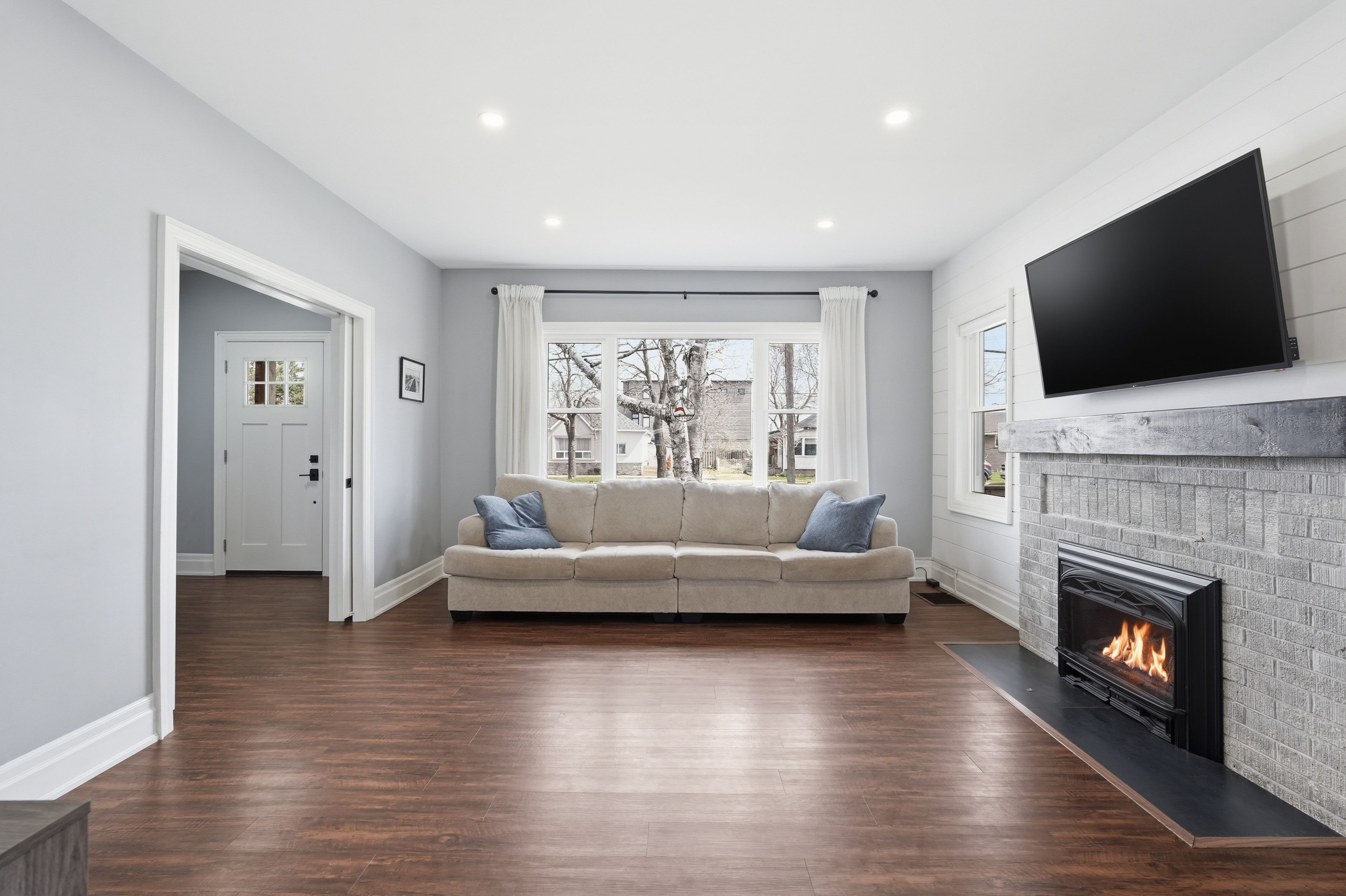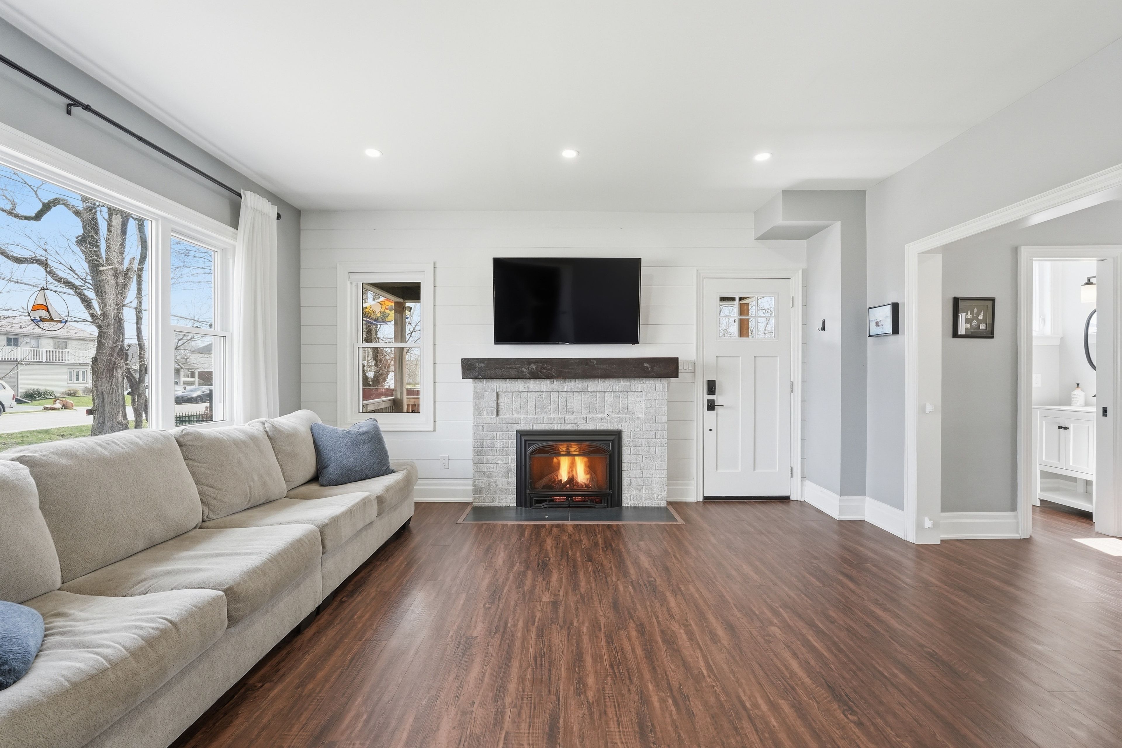 • Inviting living room with a gas fireplace and warm wood accents.