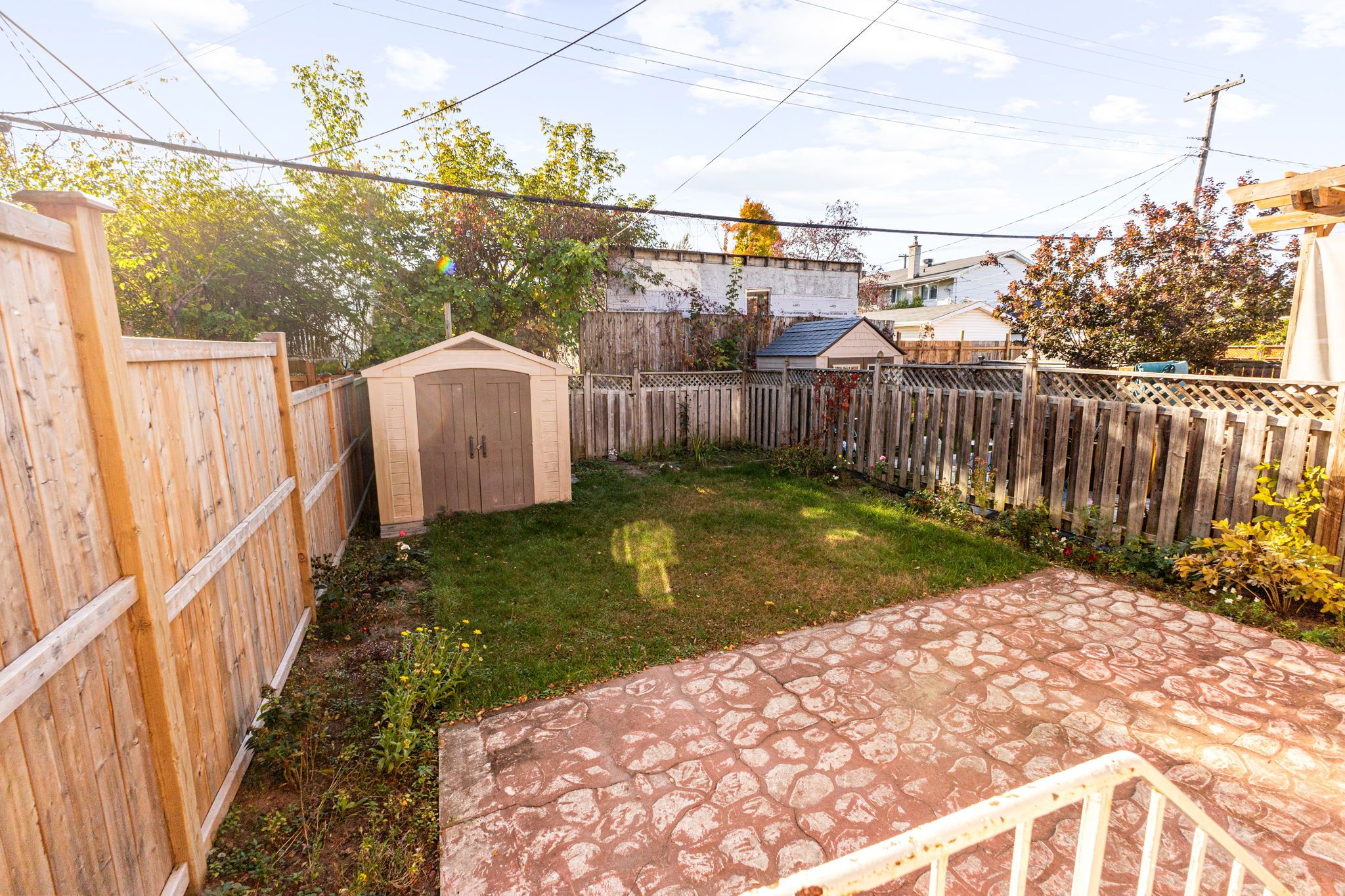 • Private west-facing yard with stamped concrete patio for outdoor enjoyment.