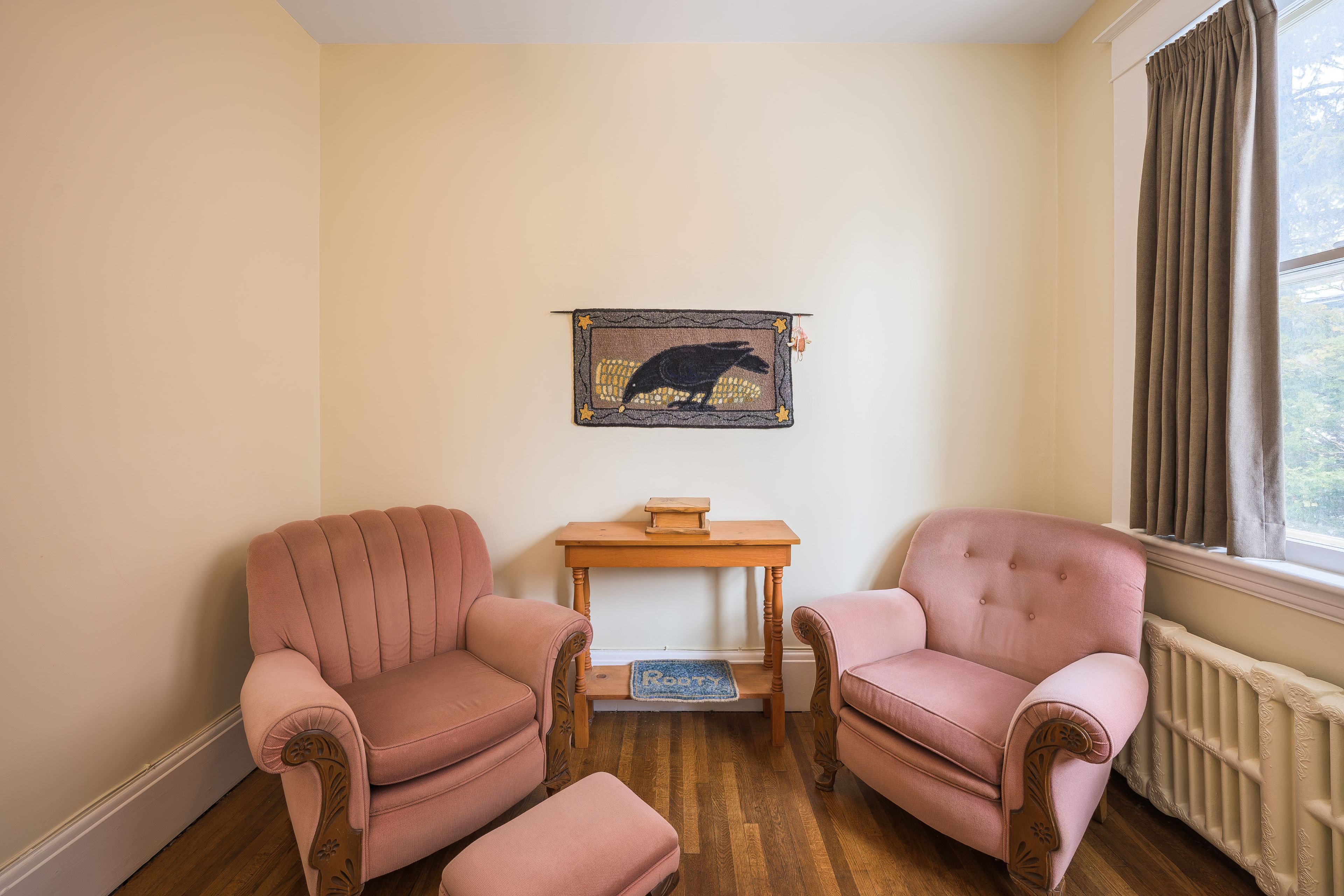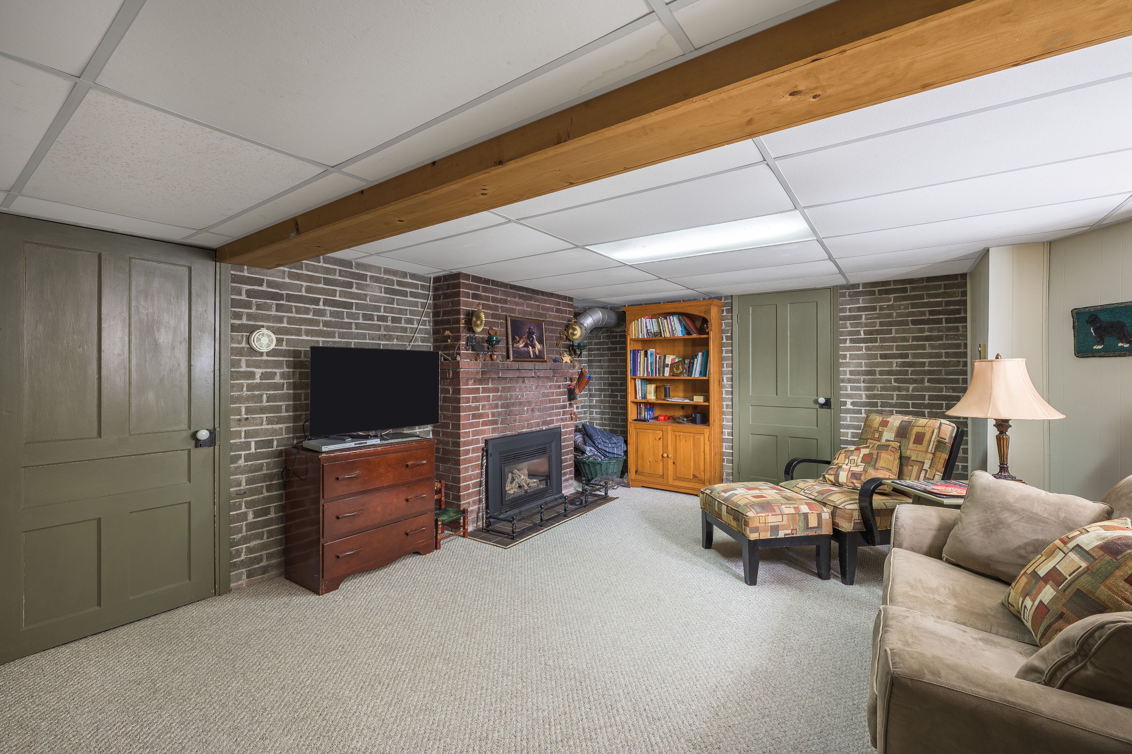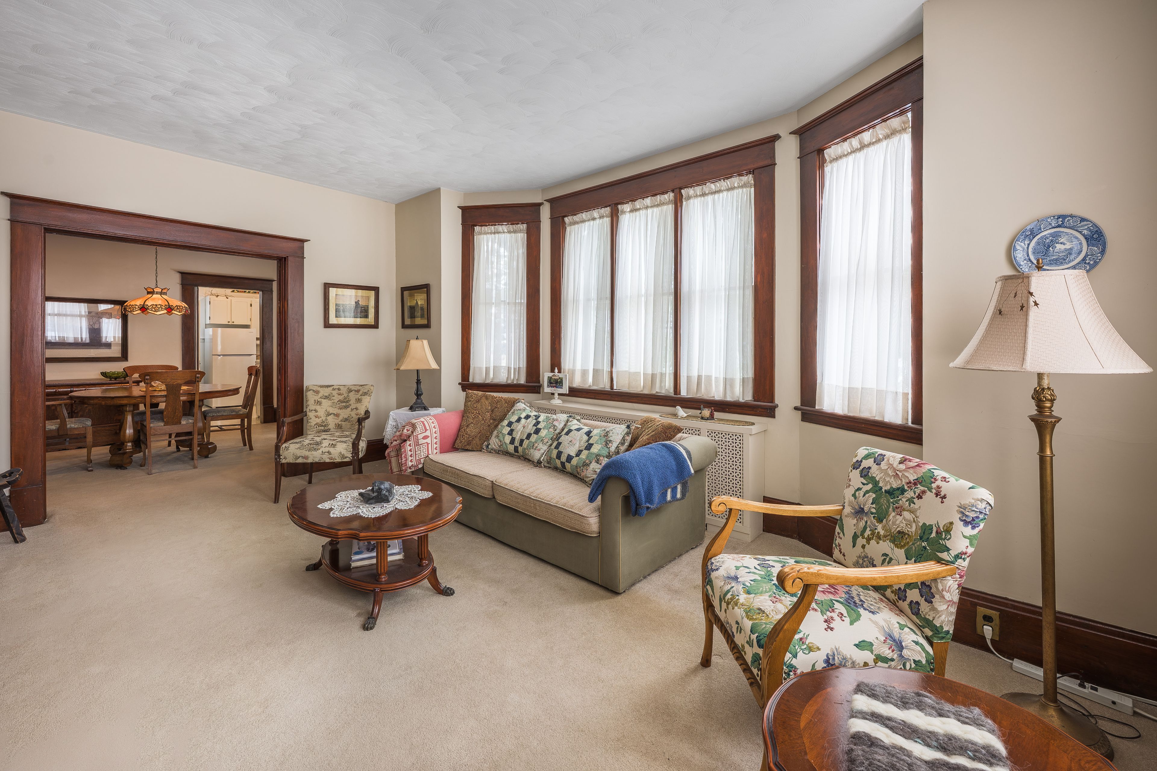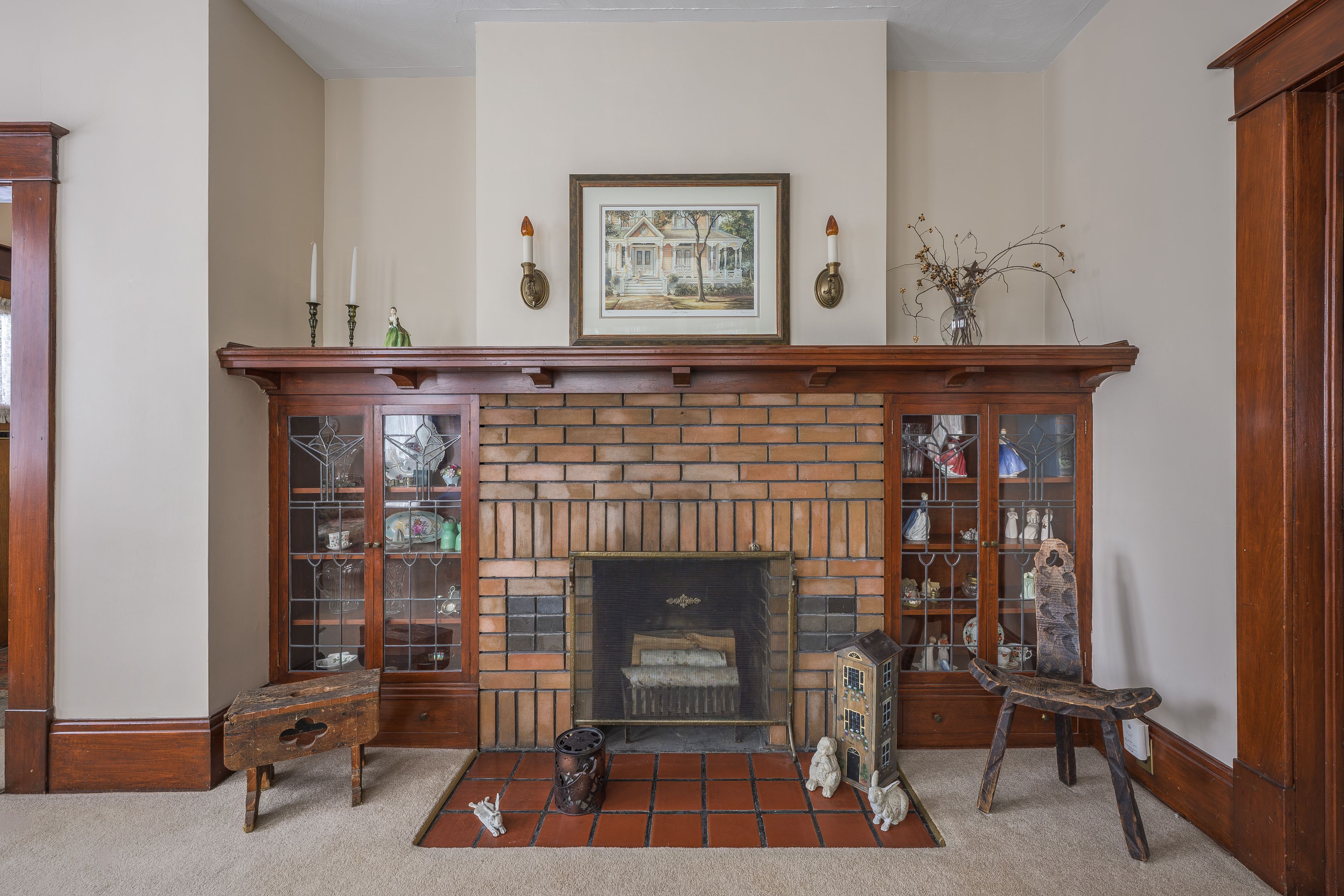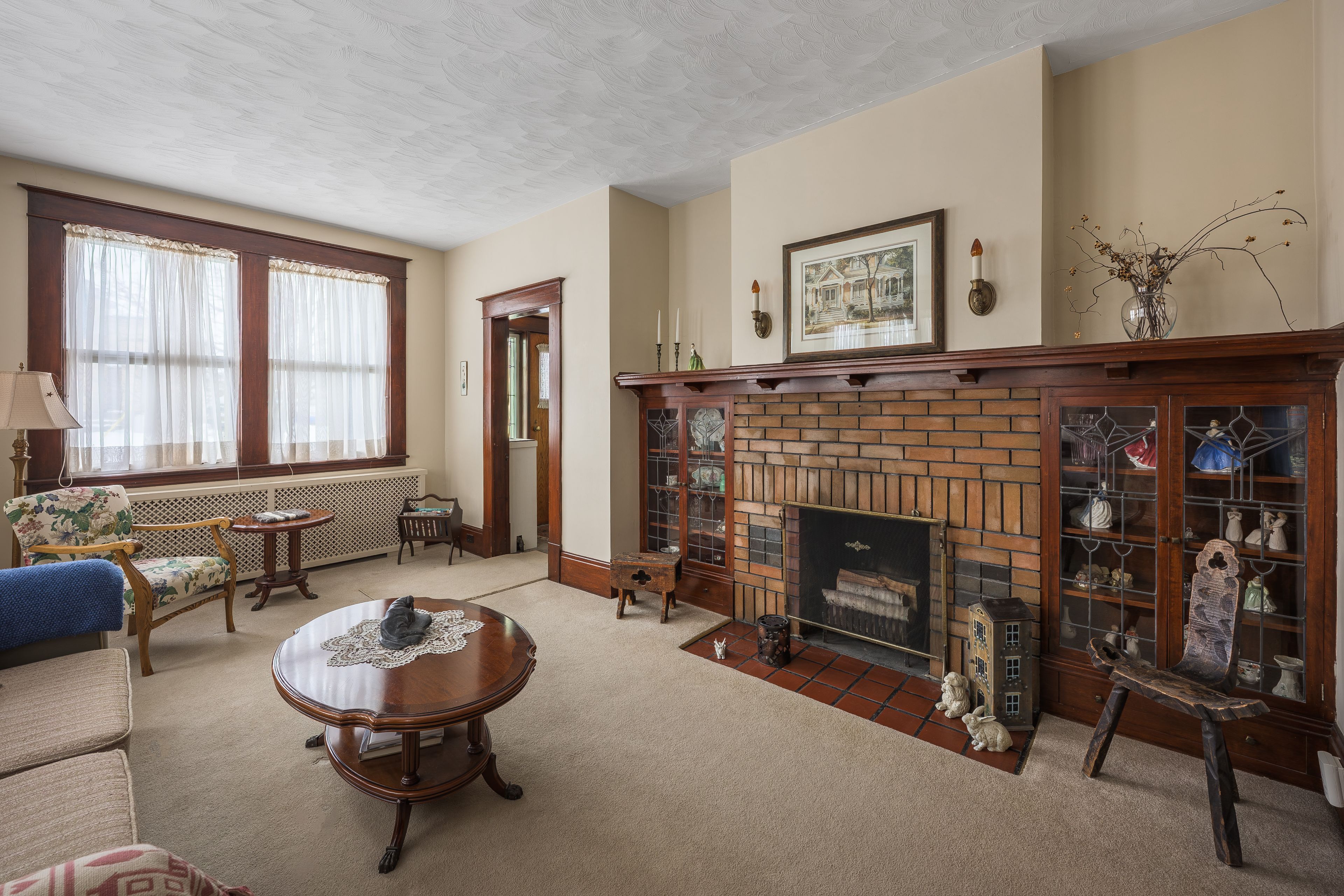 • Bright living room with natural light and cozy wood-burning fireplace.