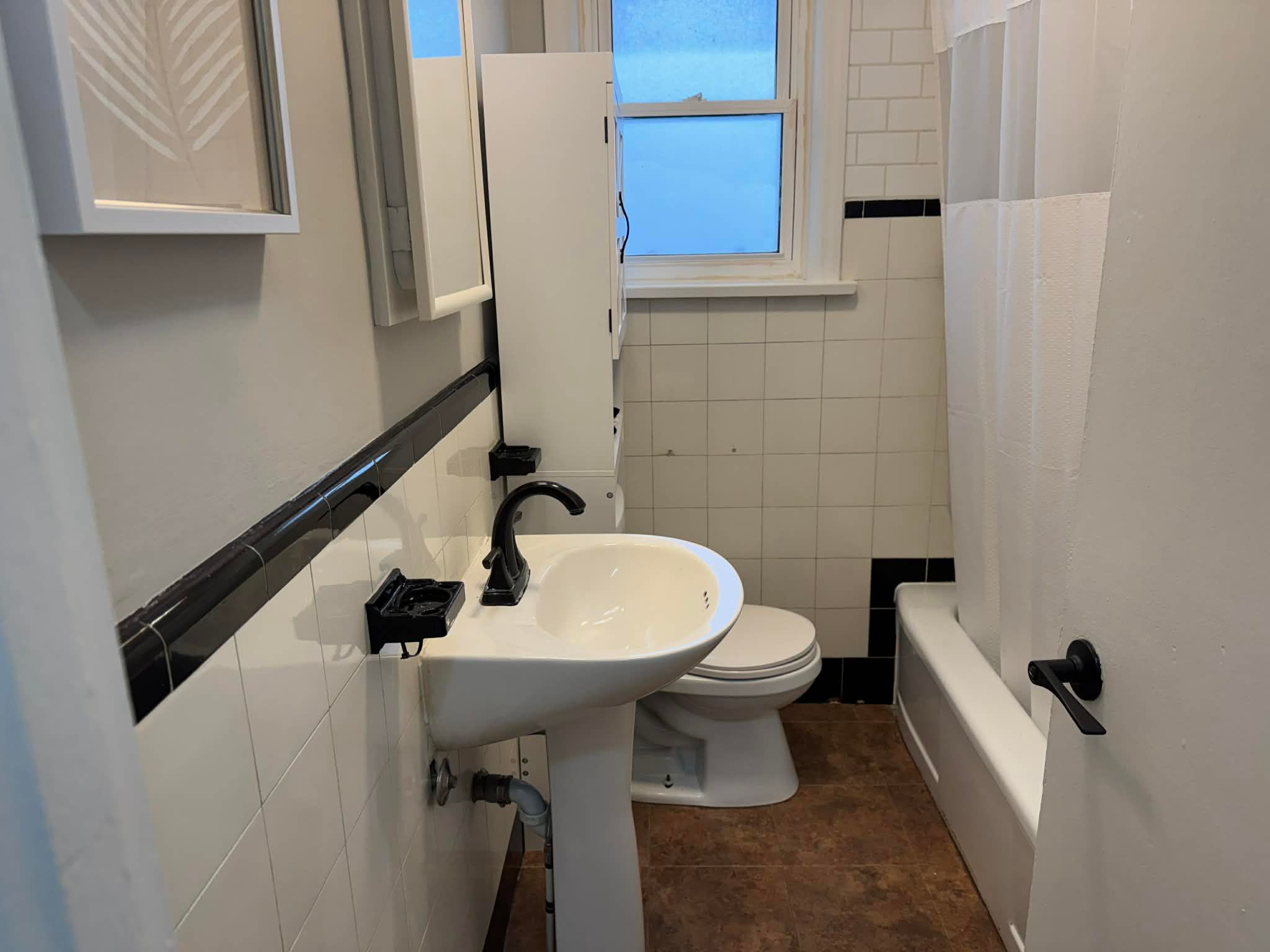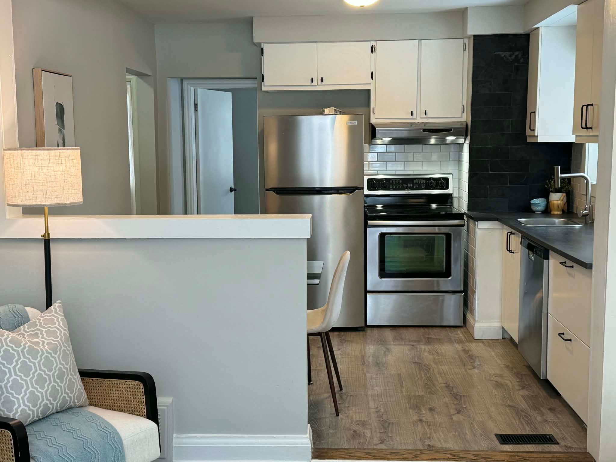 • Updated kitchen featuring white cabinetry and stainless steel appliances.