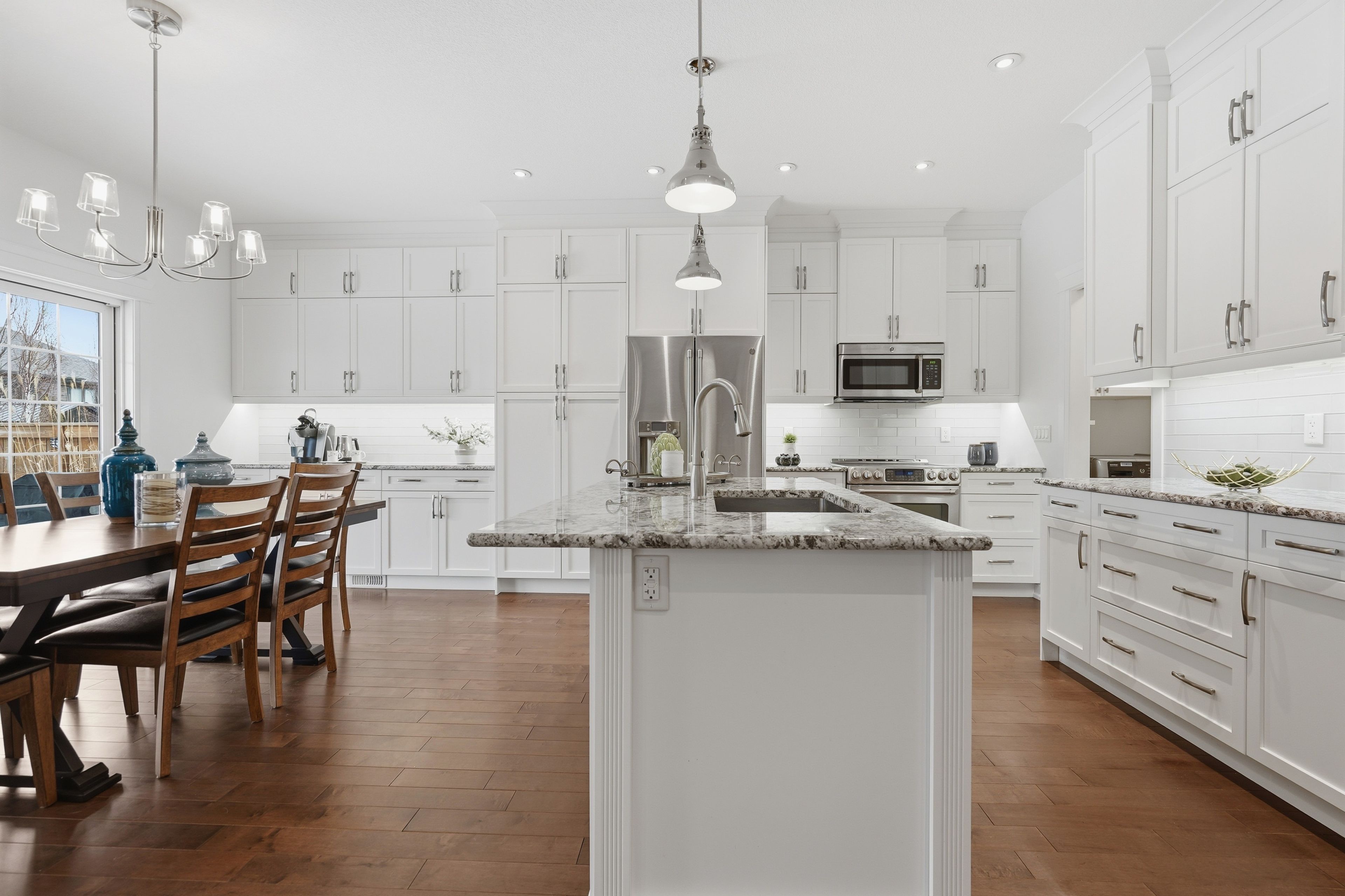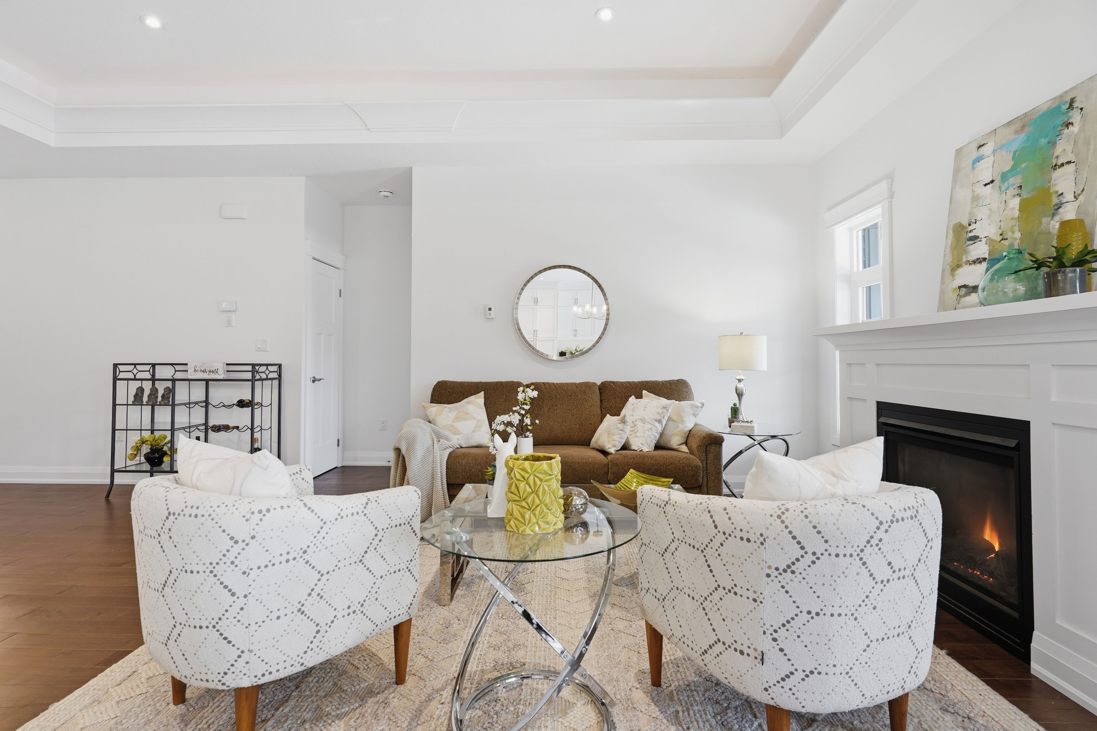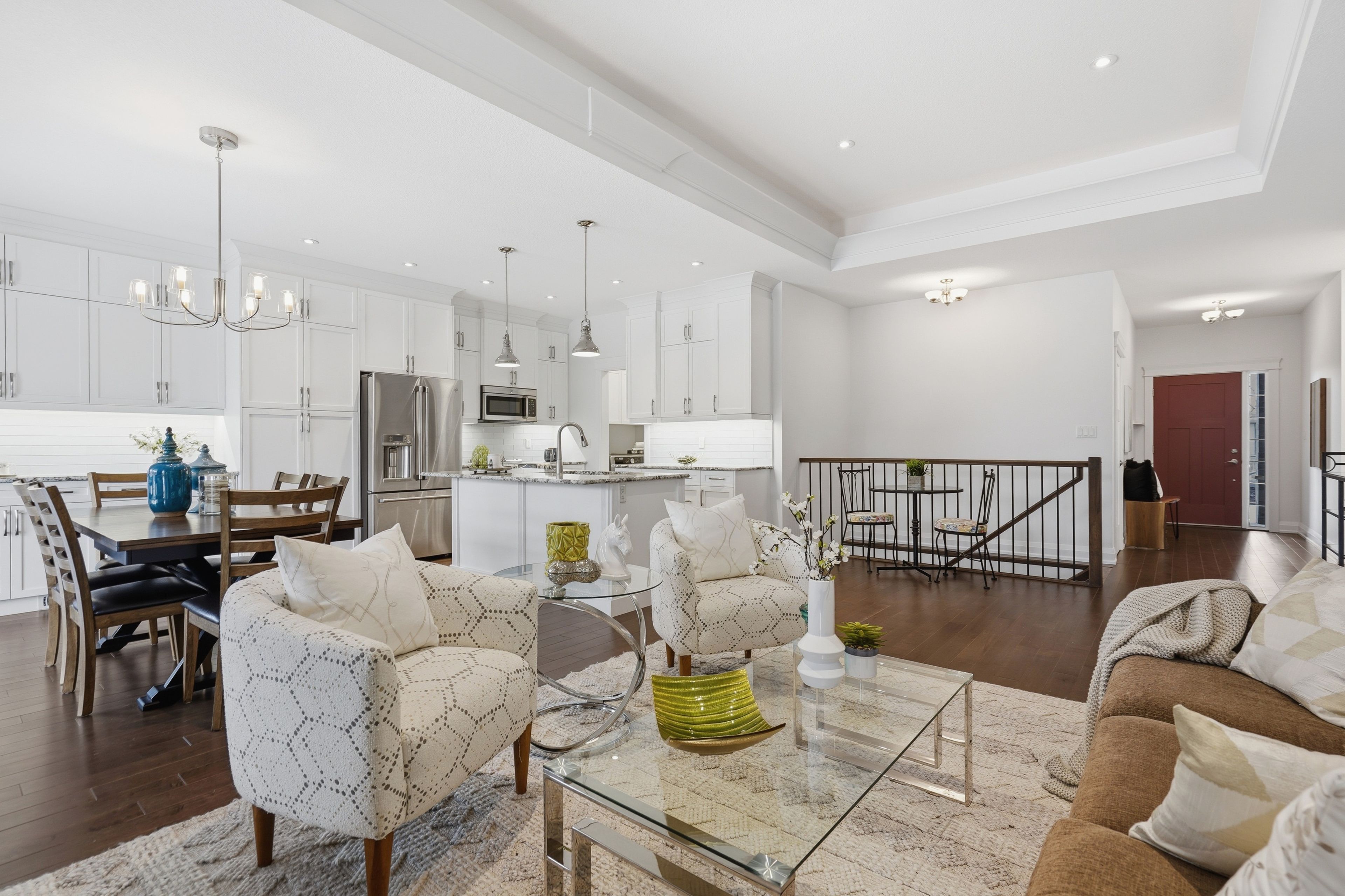 • Bright interior with high ceilings and rich hardwood flooring throughout.