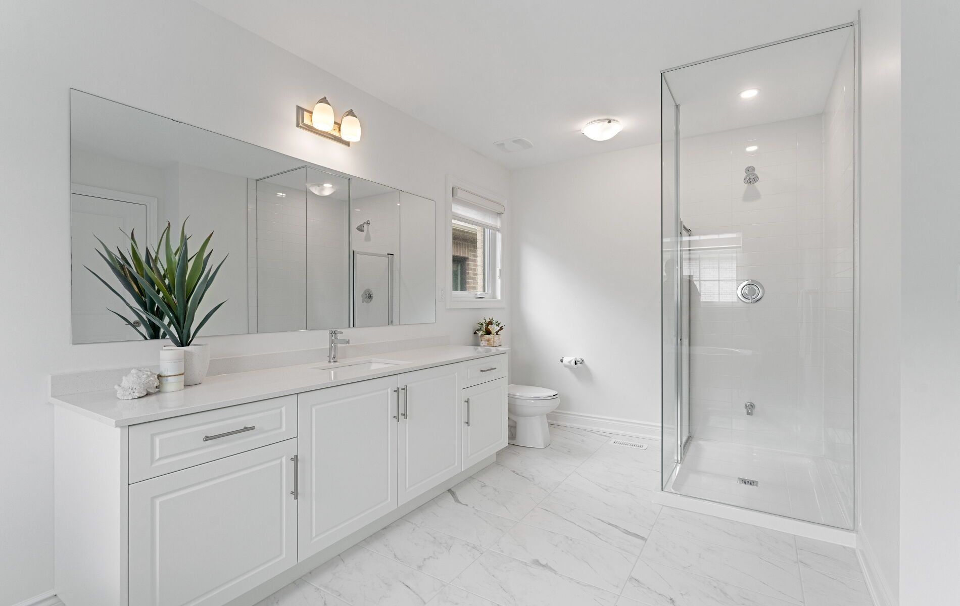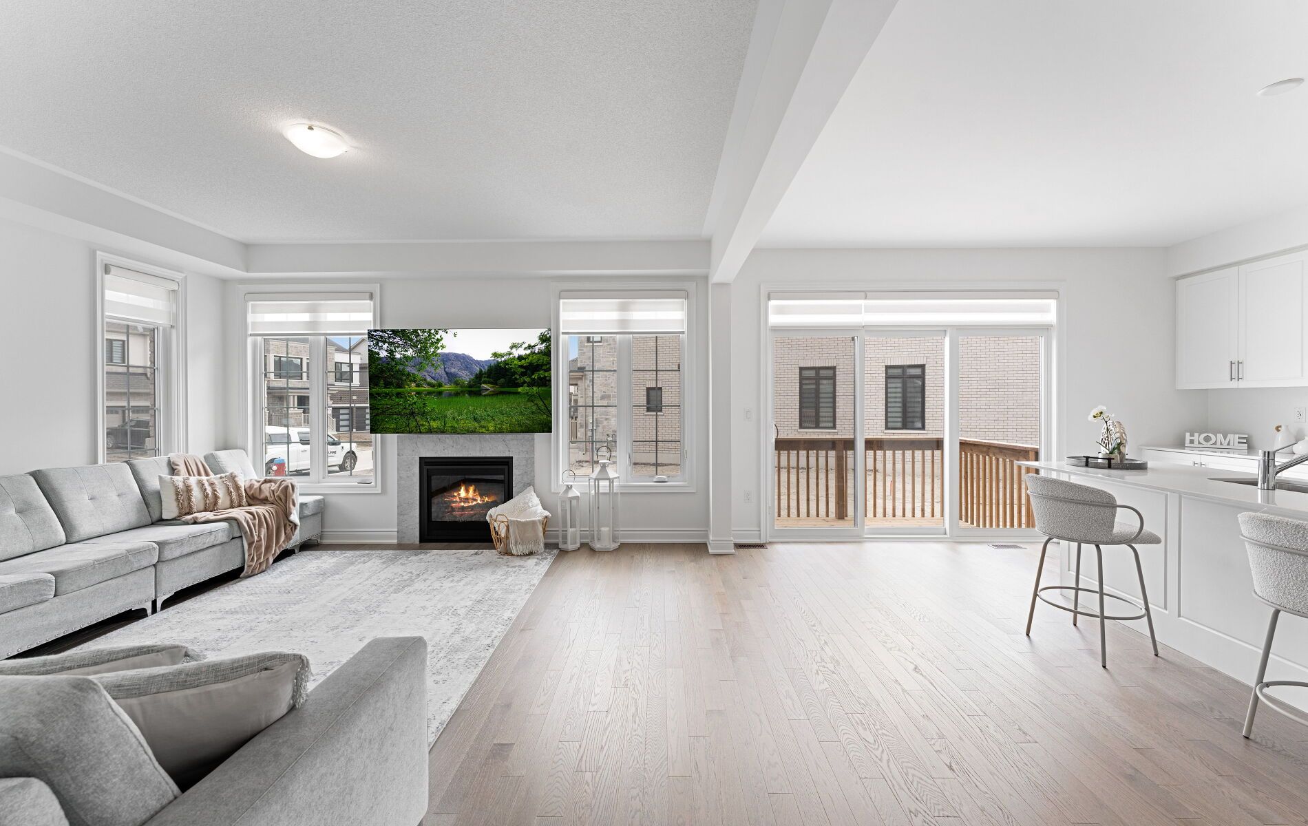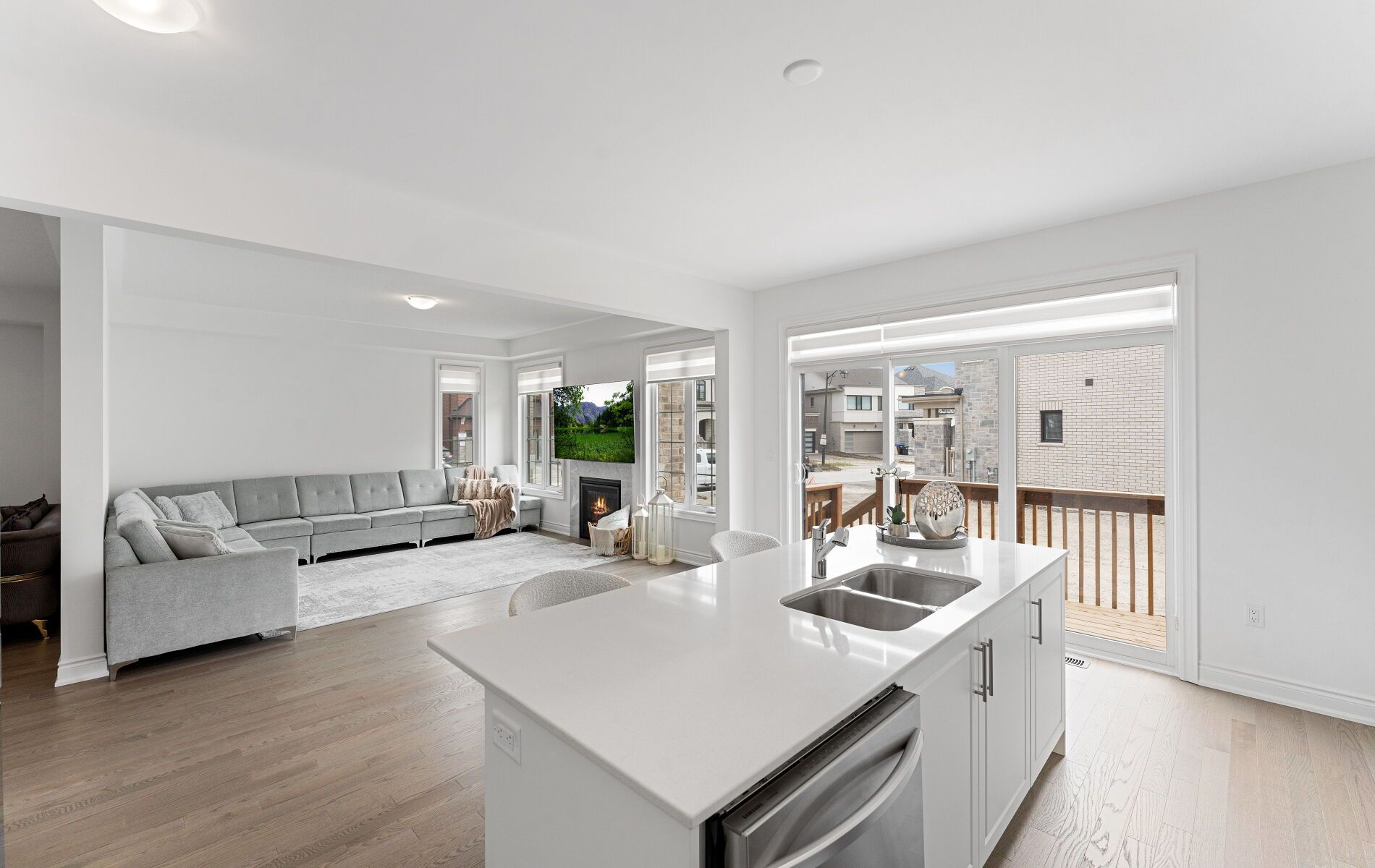 • Bright kitchen with quartz countertops, stainless steel appliances, and a large island.