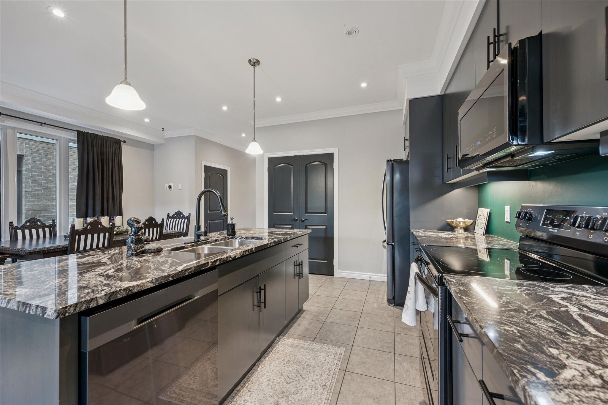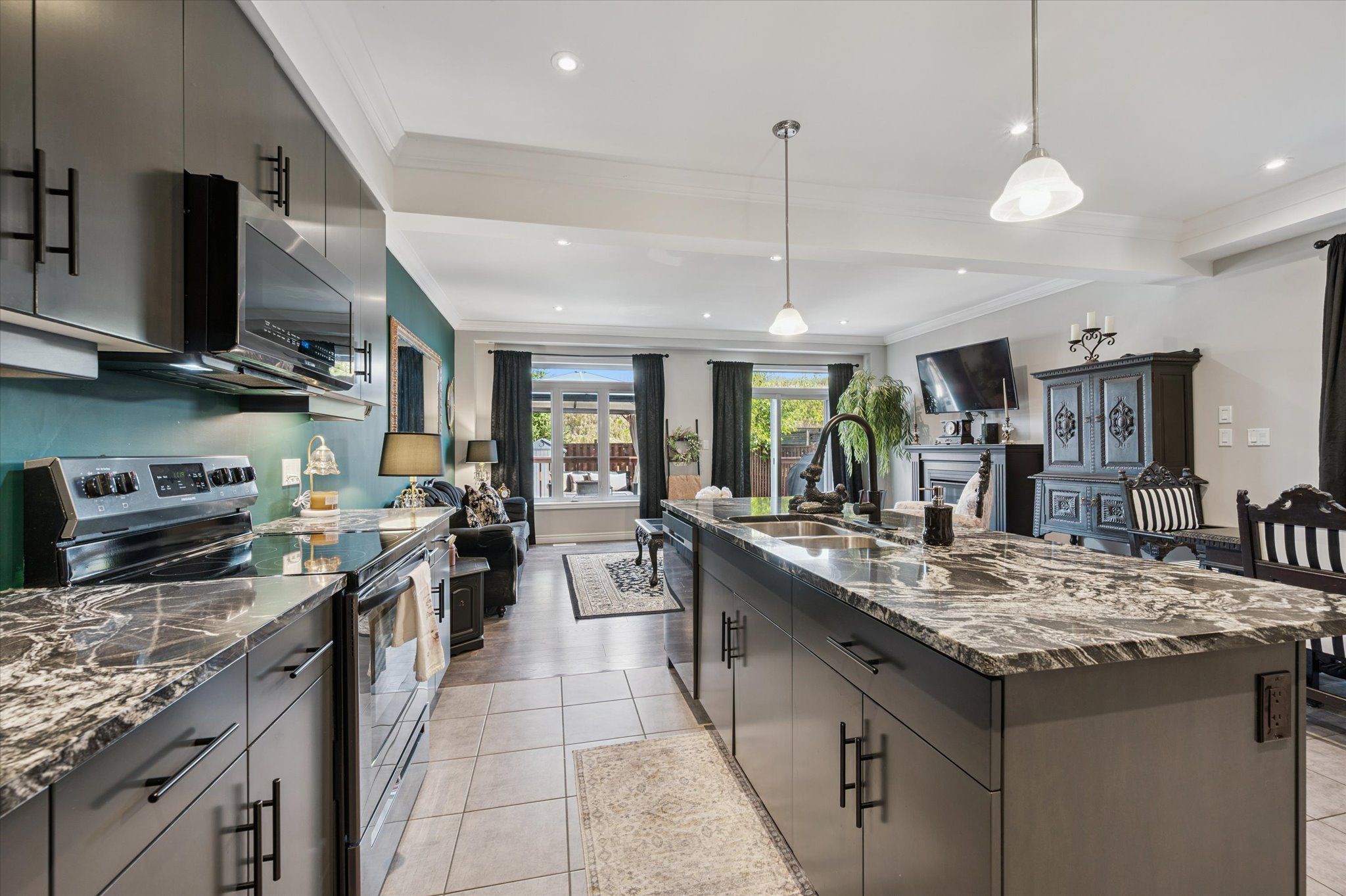 • Main floor features high ceilings, granite countertops, and a custom fireplace.