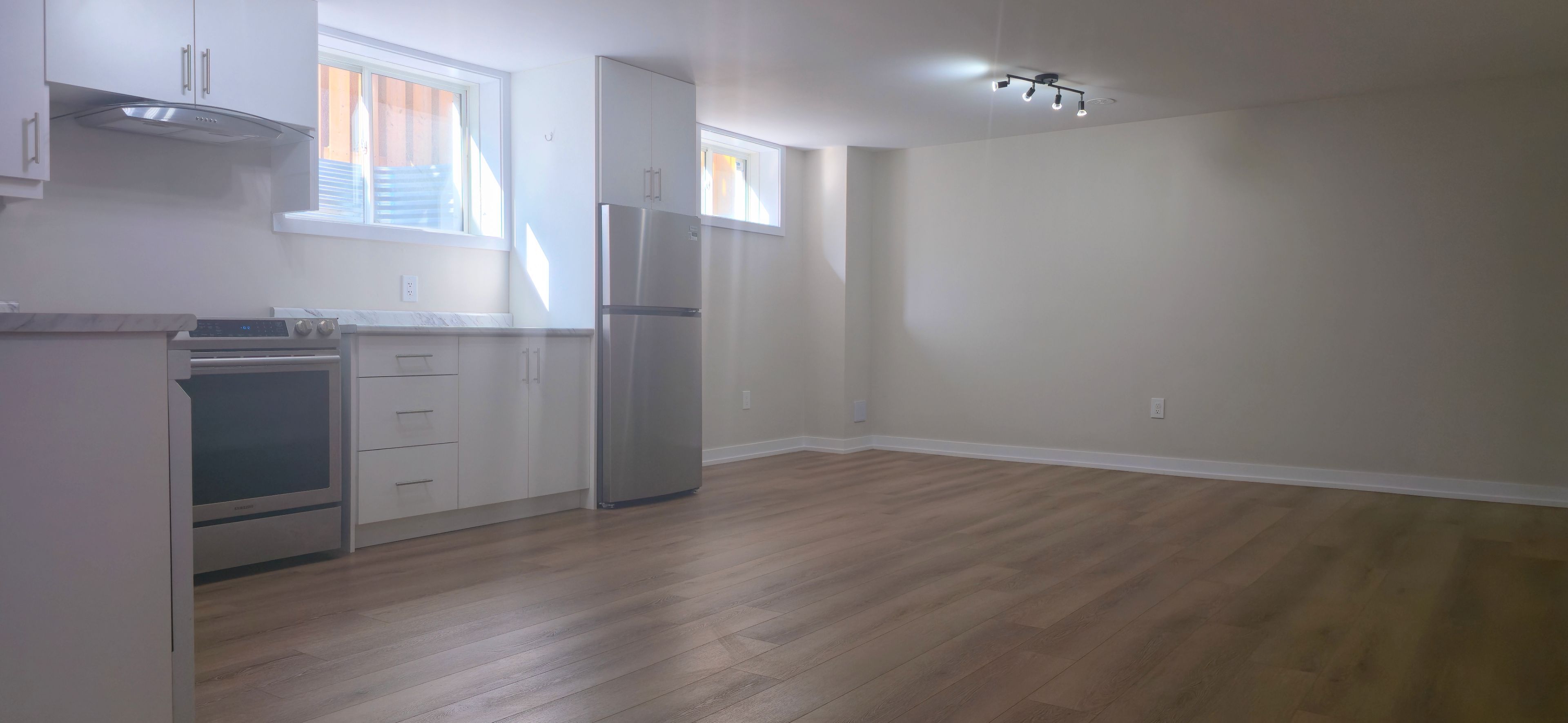 Home built in 2024. Basement apartment with tons of natural light. Radiant floor heating. Private side entry. 2 bedroom, 1 bathroom with stall shower. 2 parking spaces in line included. Dishwasher, stainless steel fridge, stainless steel sink, stainless steel hood range, electric stove and oven, ensuite laundry, erv, on demand hot water, luxury vinyl plank flooring throughout and upgraded insulation. 900 square ft of comfortable living space. Nearby restaurants and entertainment and grocery stores at fennel and upper gage. Utilities included (heat, water, hydro, snow removal and landscape maintenance)