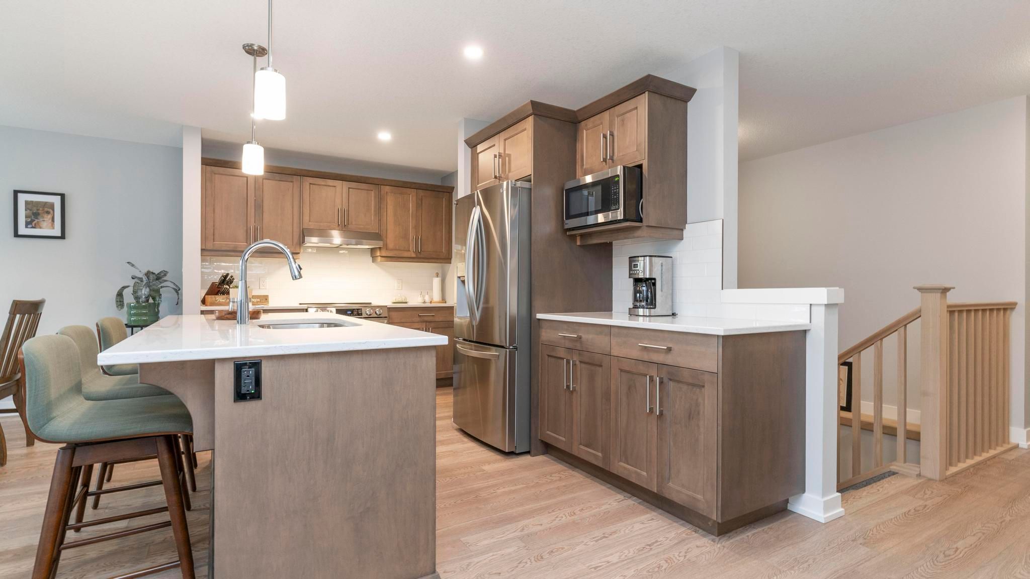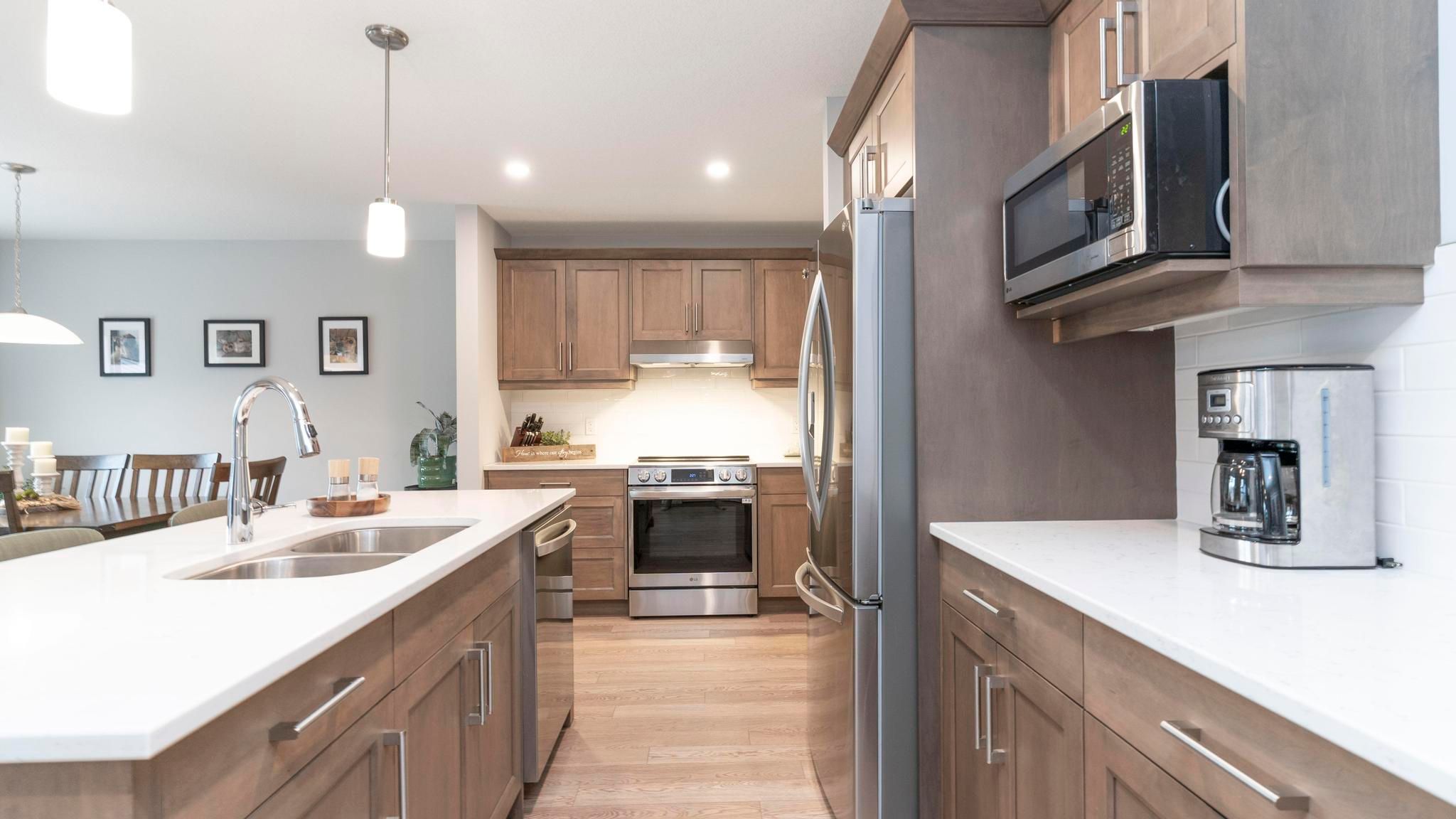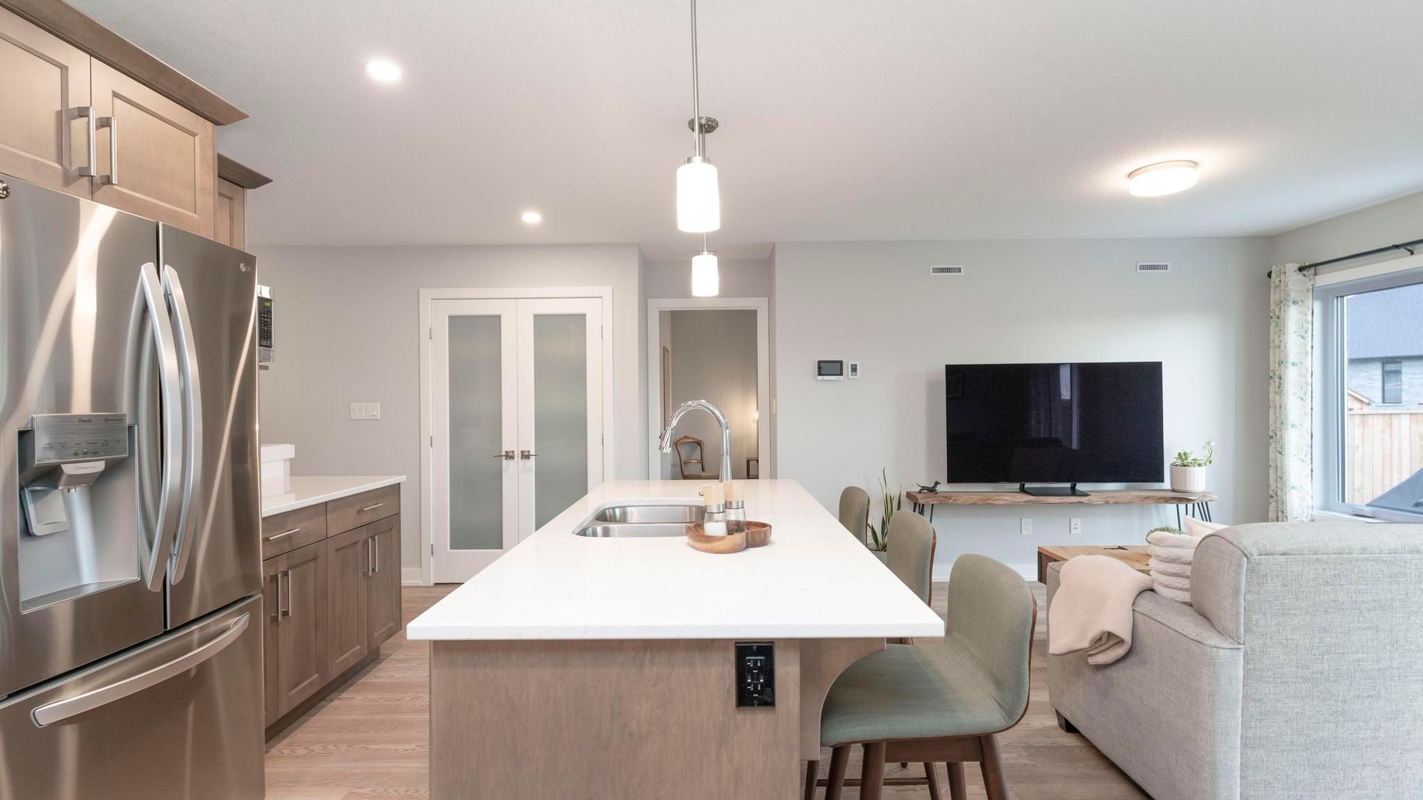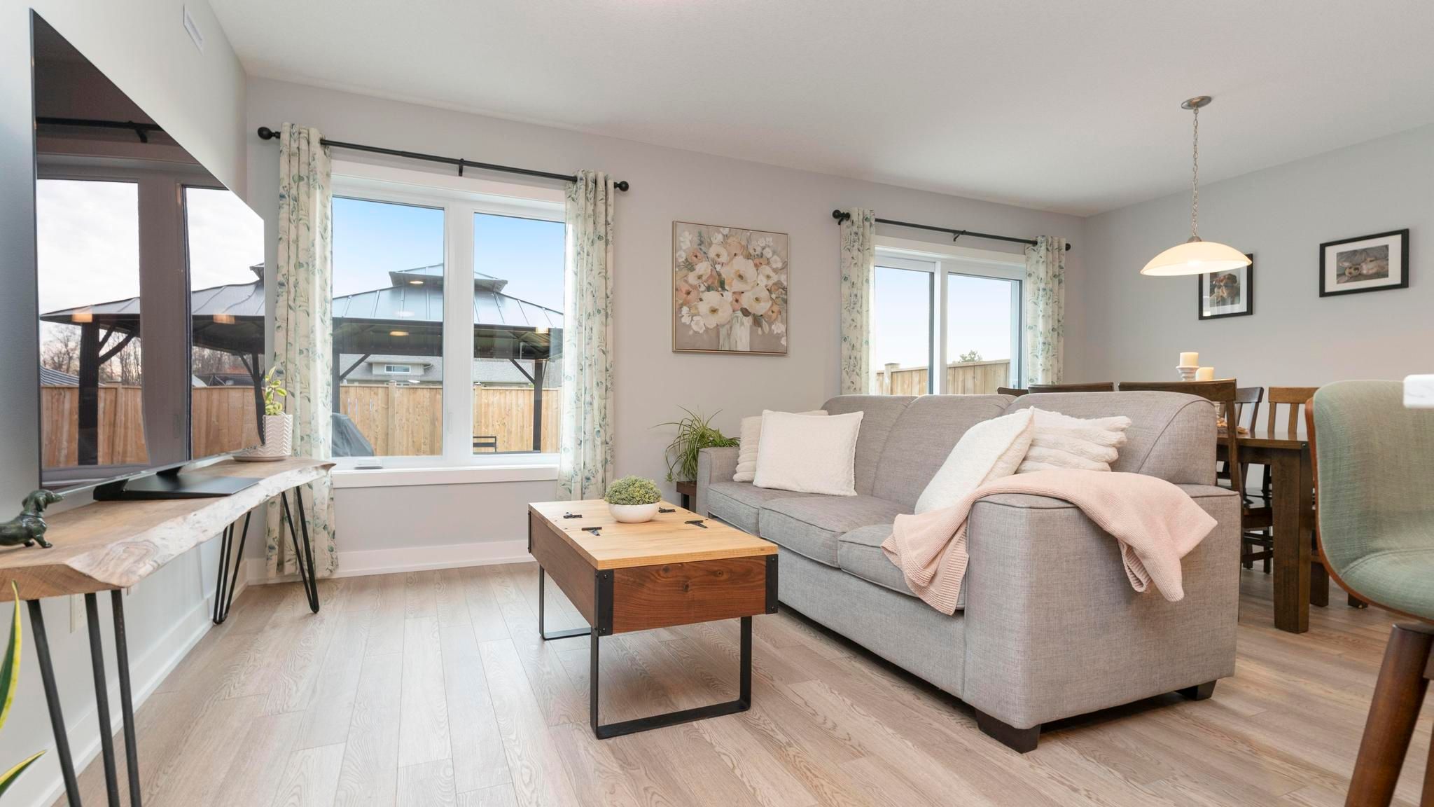 Located in harvest run and a short walk to trails & beautiful orchard park is this 1 year old, doug tarry built energystar certified & net zero ready semi-detached bungalow with 4 bedrooms & 3 full bathrooms and all 5 appliances included! Enjoy the fenced yard with beautiful, entertainment sized stamped concrete patio, pergola & shed (with metal roof). This home has over 2000 square feet of finished living space! The main level has 2 bedrooms (including primary bedroom with walk-in closet & 3pc ensuite), 2 full bathrooms, convenient main floor laundry/mudroom (with inside entry from the 1. 5 car garage), an open concept living area including a great room, kitchen (with island, pantry & quartz counters) & dining space (with sliding doors leading to the backyard). The lower level features 2 bedrooms, a 3pc bathroom & very spacious rec room. A wonderful house with a fantastic location. Welcome home!