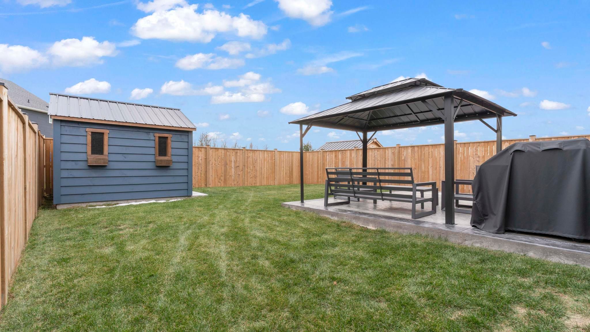 • Two outdoor entertainment areas: a stamped concrete patio and a pergola.