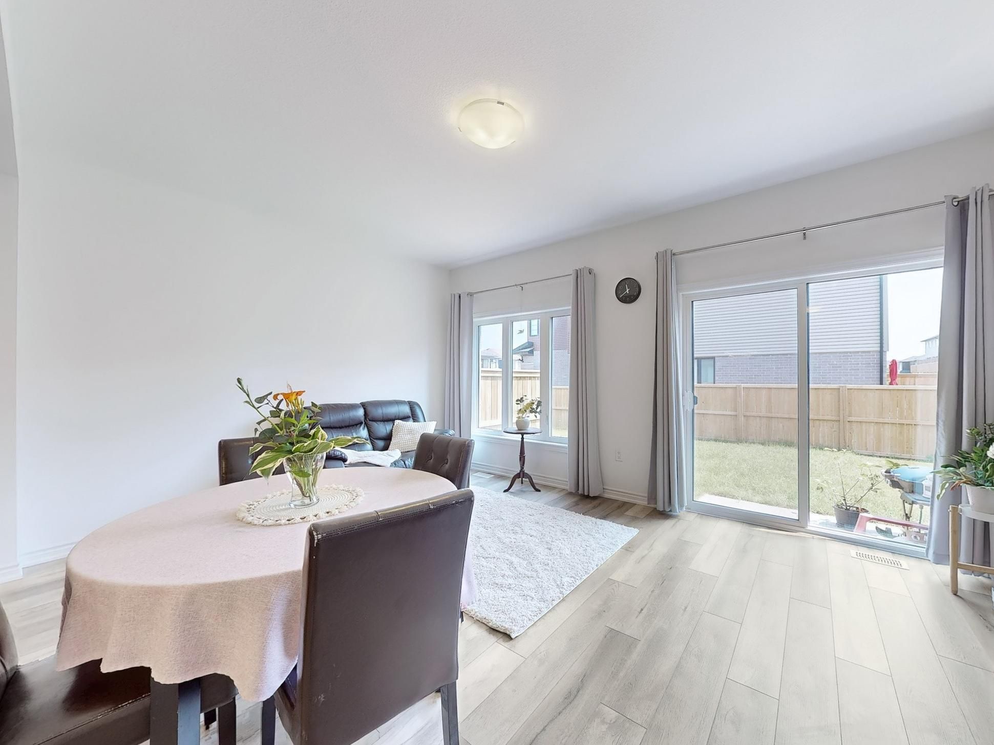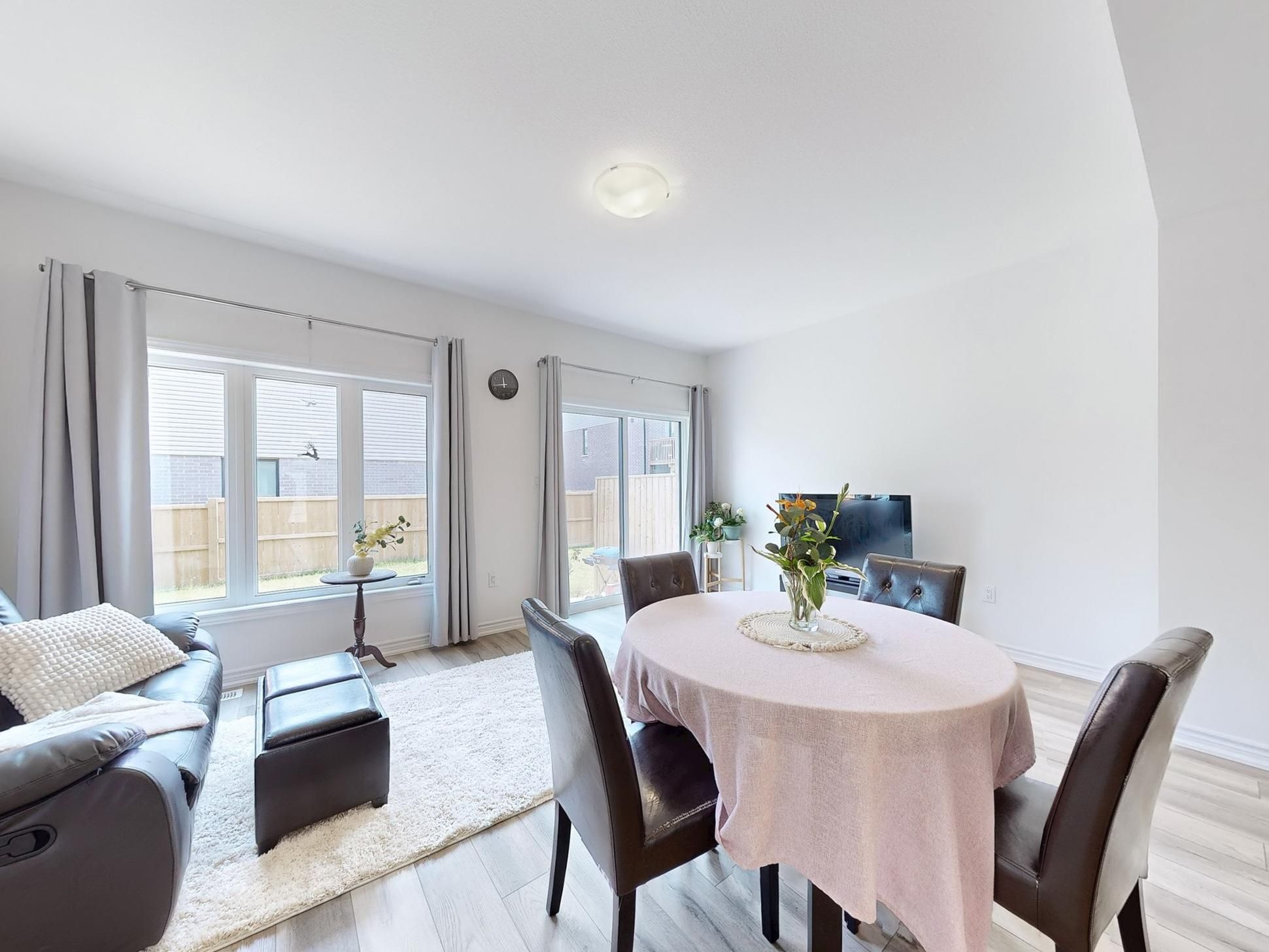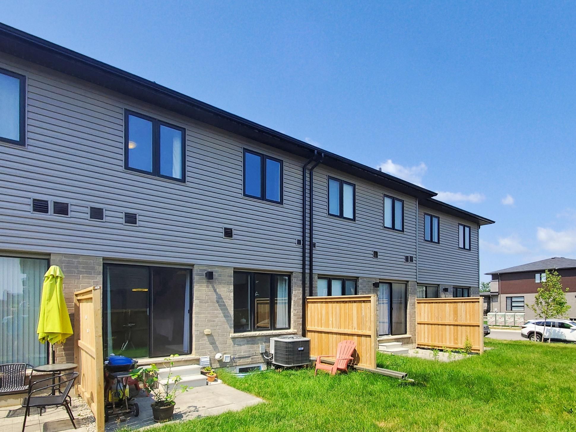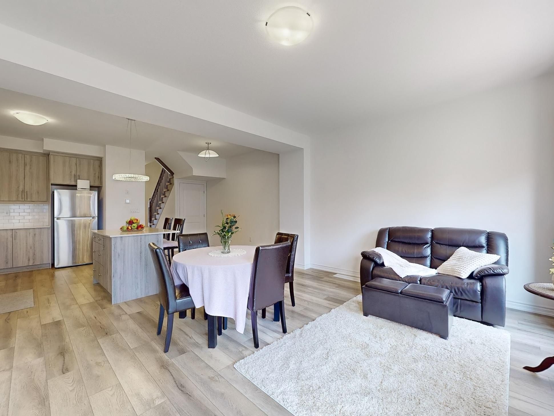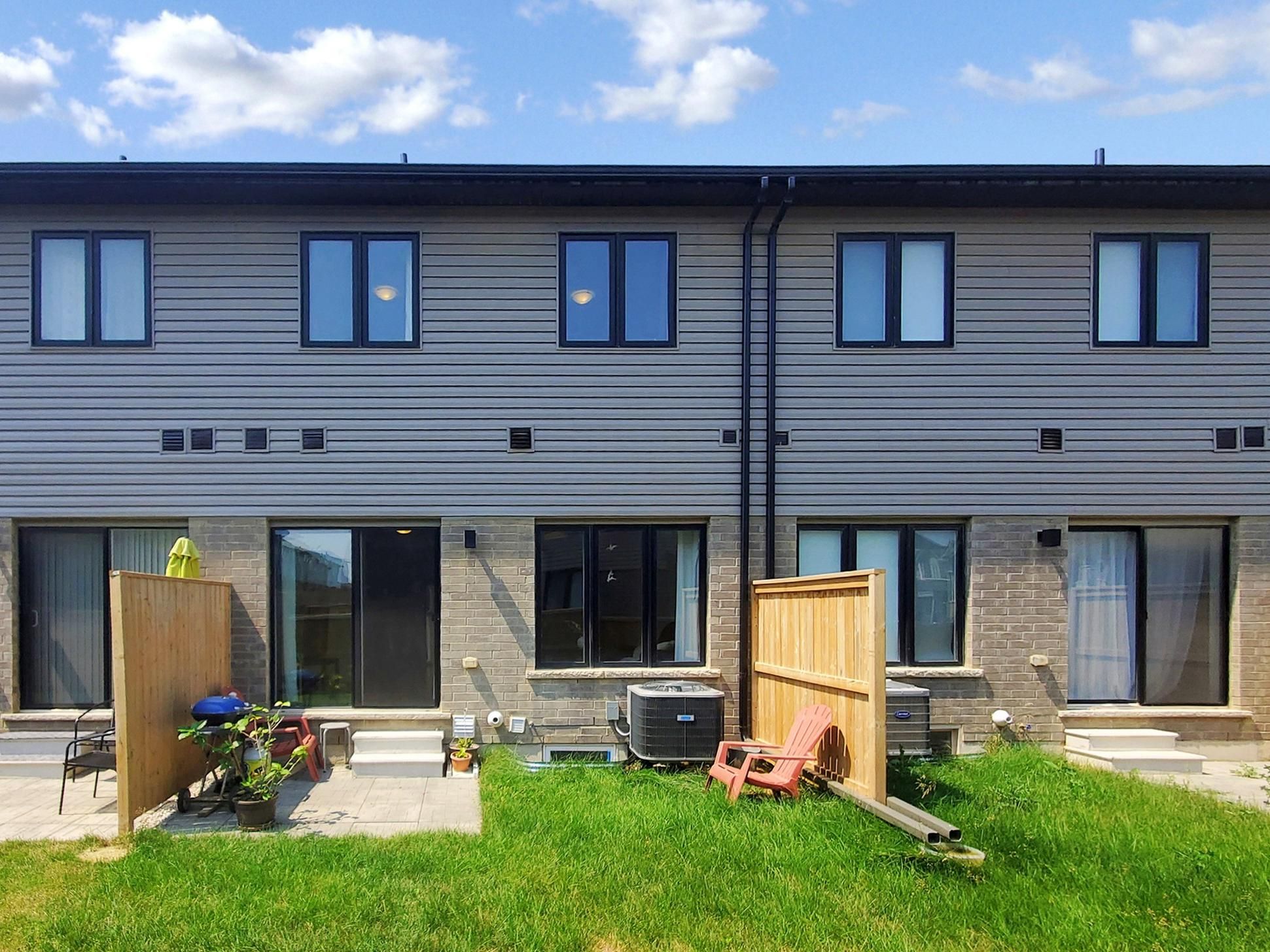 Four-year-new 3+1 bedroom, 4 bathroom townhouse offering an inviting front door with glass insert and keyless entry pad. 9' ceilings and elegant vinyl flooring flow seamlessly throughout the main level. Sun-filled, open-concept living room is flooded with natural light from a large window and patio door leading to the backyard. The kitchen features abundant cabinetry, quartz countertops, double sink, backsplash, valance lighting, stainless steel appliances, and a central island. The main floor offers convenient access to the garage with a garage door opener, as well as a thoughtfully placed powder room. Upstairs, you'll find three generously sized bedrooms. The bright primary suite offers three tall windows, 4-piece ensuite, and walk-in closet. Two additional bedrooms share a 4-piece bathroom. The second bedroom offers a walk-in closet, while the third bedroom features a single closet. Second-floor laundry adds everyday convenience. Finished basement includes a bachelor-style in-law suite, upgraded with extra heat registers, large window, rough-ins for a stove, fridge, and range hood. Spacious 4-piece bathroom with rough-ins for a washer and dryer. All electrical and plumbing work completed by licensed professionals. Conveniently located in a desirable, family-friendly neighbourhood in the west end of brantford. Walking distance to brand new community center with library, indoor swimming pool & elementary school. Minutes to walter gretzky elementary school, st. Basil catholic elementary school, and assumption college school. Close to plazas, walking trail with lakes with legal fishing and parks with playground and splash area.