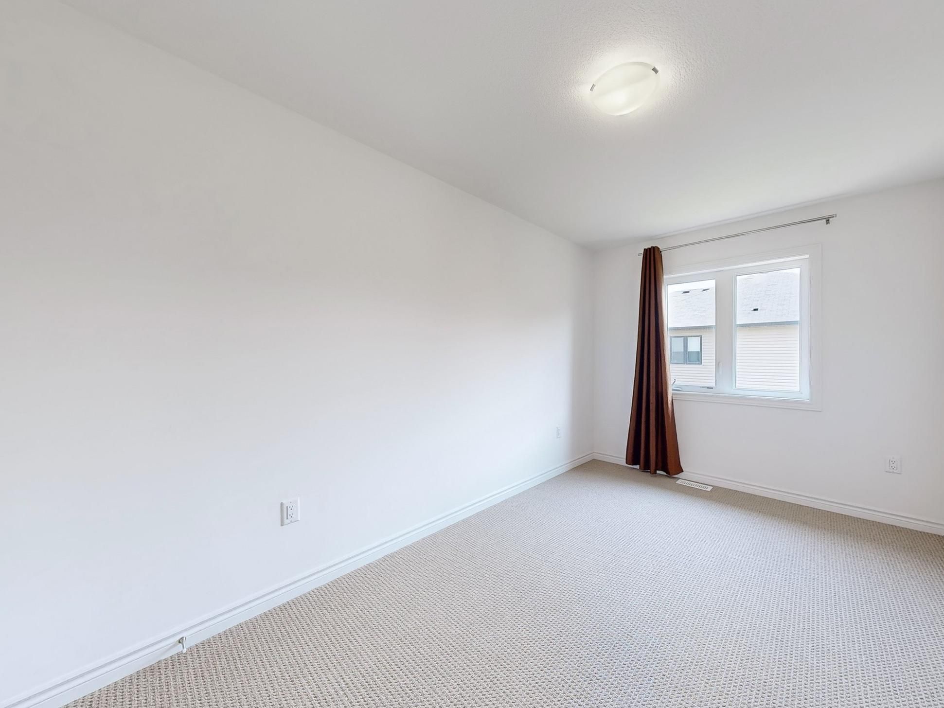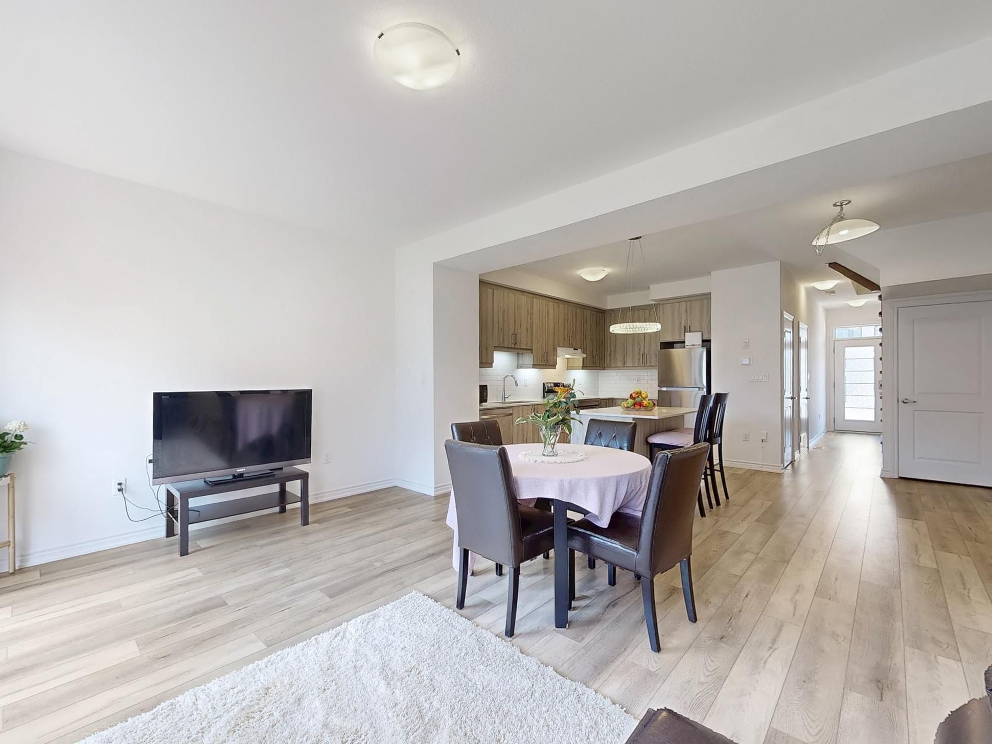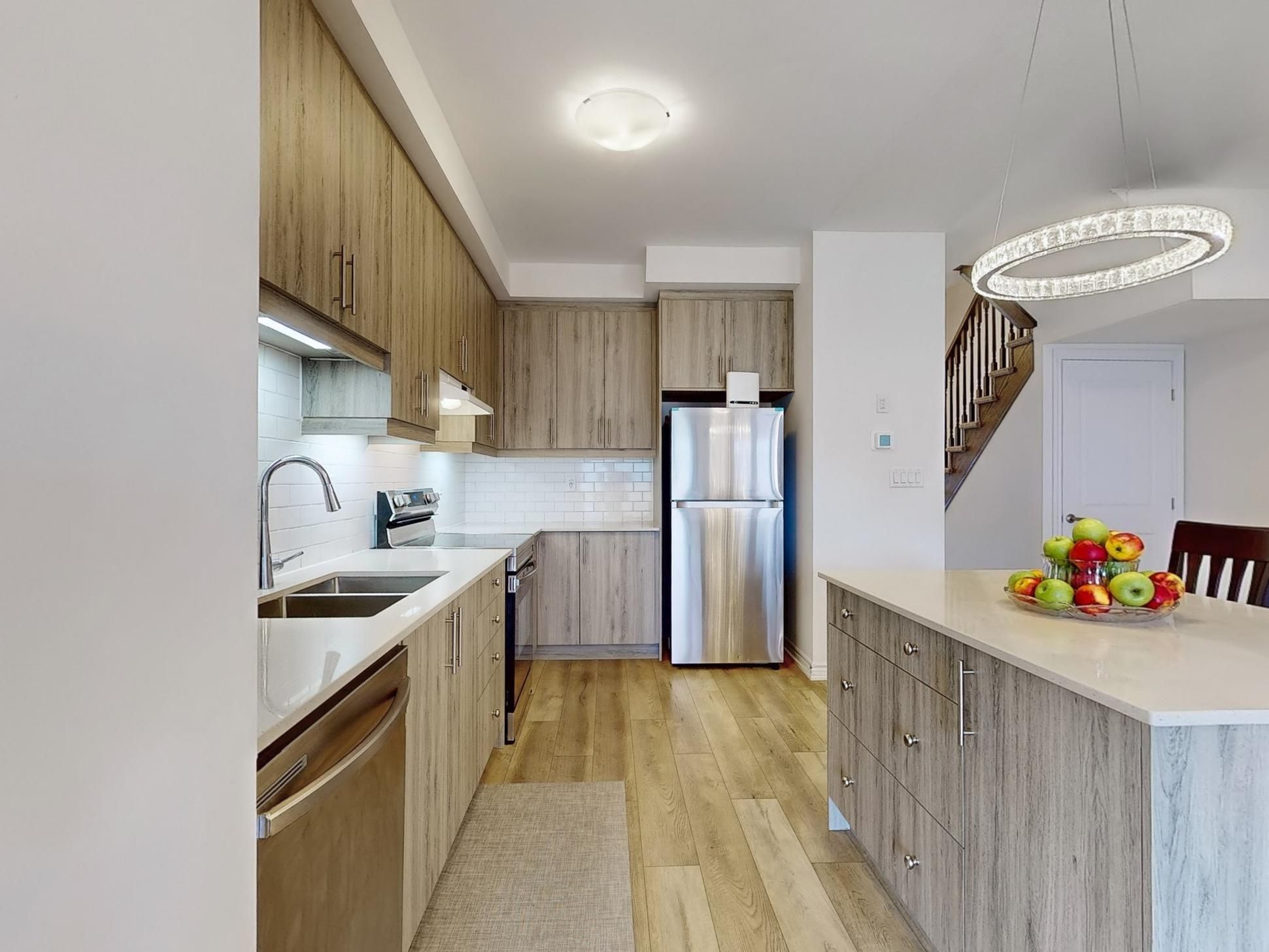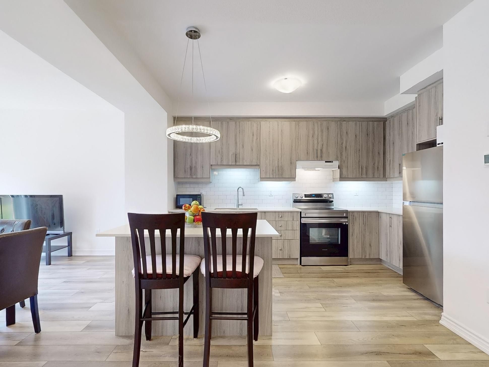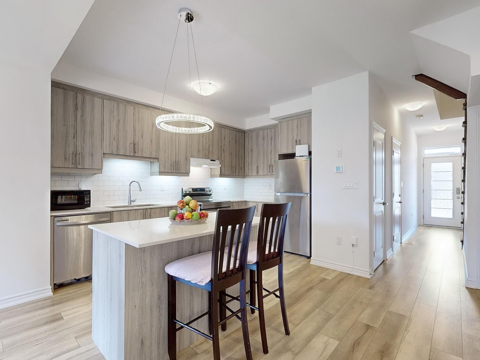 Four-year-new 3+1 bedroom, 4 bathroom townhouse offering an inviting front door with glass insert and keyless entry pad. 9' ceilings and elegant vinyl flooring flow seamlessly throughout the main level. Sun-filled, open-concept living room is flooded with natural light from a large window and patio door leading to the backyard. The kitchen features abundant cabinetry, quartz countertops, double sink, backsplash, valance lighting, stainless steel appliances, and a central island. The main floor offers convenient access to the garage with a garage door opener, as well as a thoughtfully placed powder room. Upstairs, you'll find three generously sized bedrooms. The bright primary suite offers three tall windows, 4-piece ensuite, and walk-in closet. Two additional bedrooms share a 4-piece bathroom. The second bedroom offers a walk-in closet, while the third bedroom features a single closet. Second-floor laundry adds everyday convenience. Finished basement includes a bachelor-style in-law suite, upgraded with extra heat registers, large window, rough-ins for a stove, fridge, and range hood. Spacious 4-piece bathroom with rough-ins for a washer and dryer. All electrical and plumbing work completed by licensed professionals. Conveniently located in a desirable, family-friendly neighbourhood in the west end of brantford. Walking distance to brand new community center with library, indoor swimming pool & elementary school. Minutes to walter gretzky elementary school, st. Basil catholic elementary school, and assumption college school. Close to plazas, walking trail with lakes with legal fishing and parks with playground and splash area.
