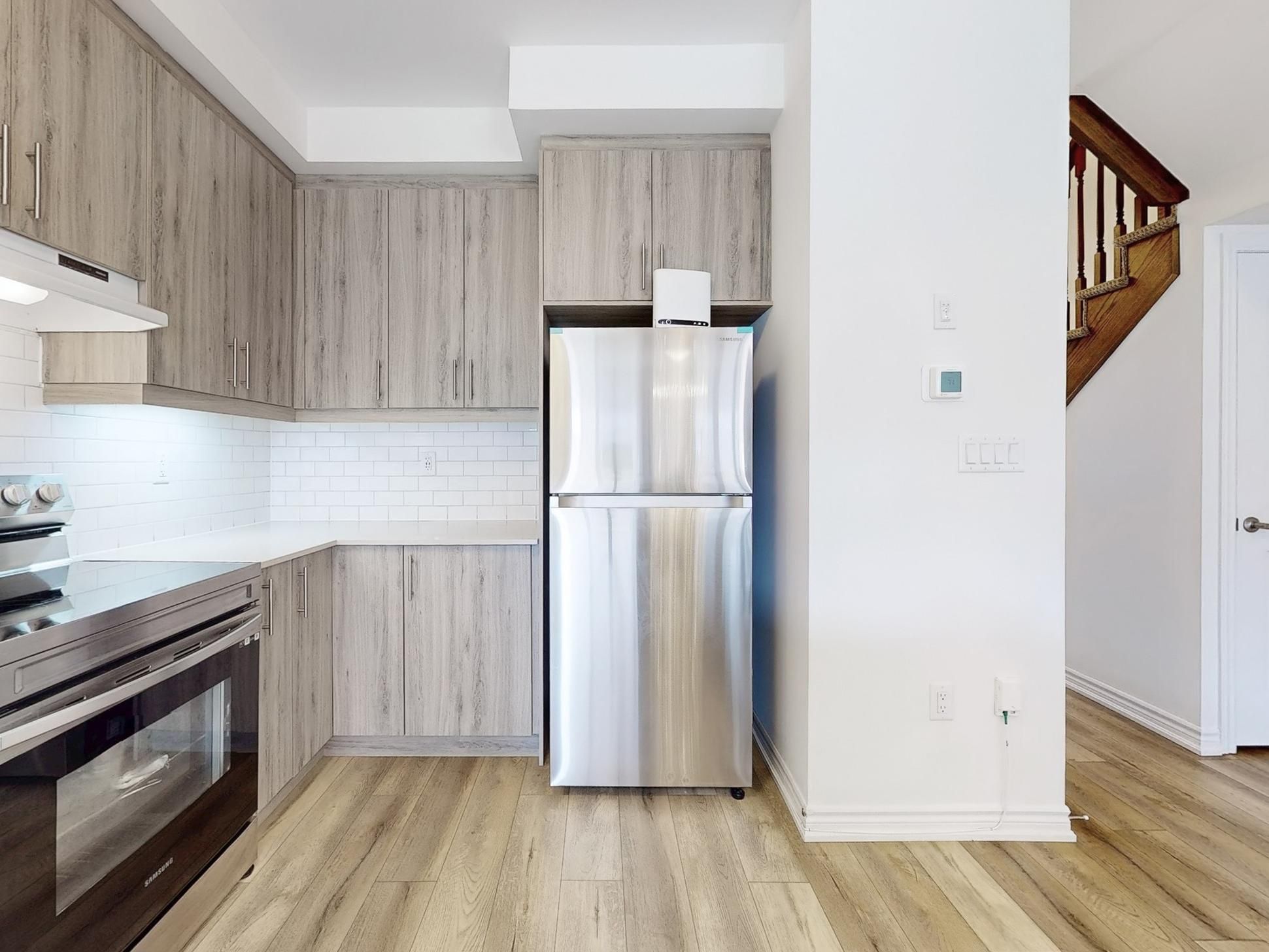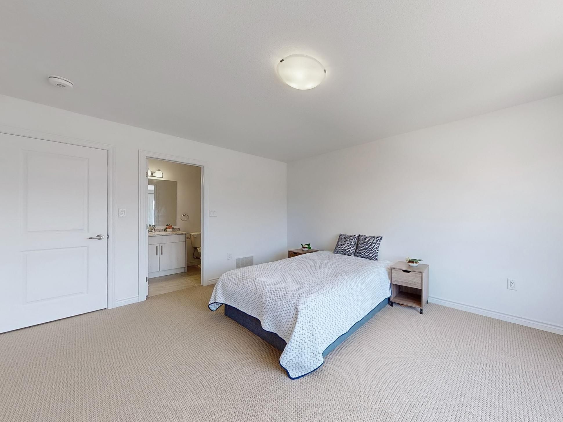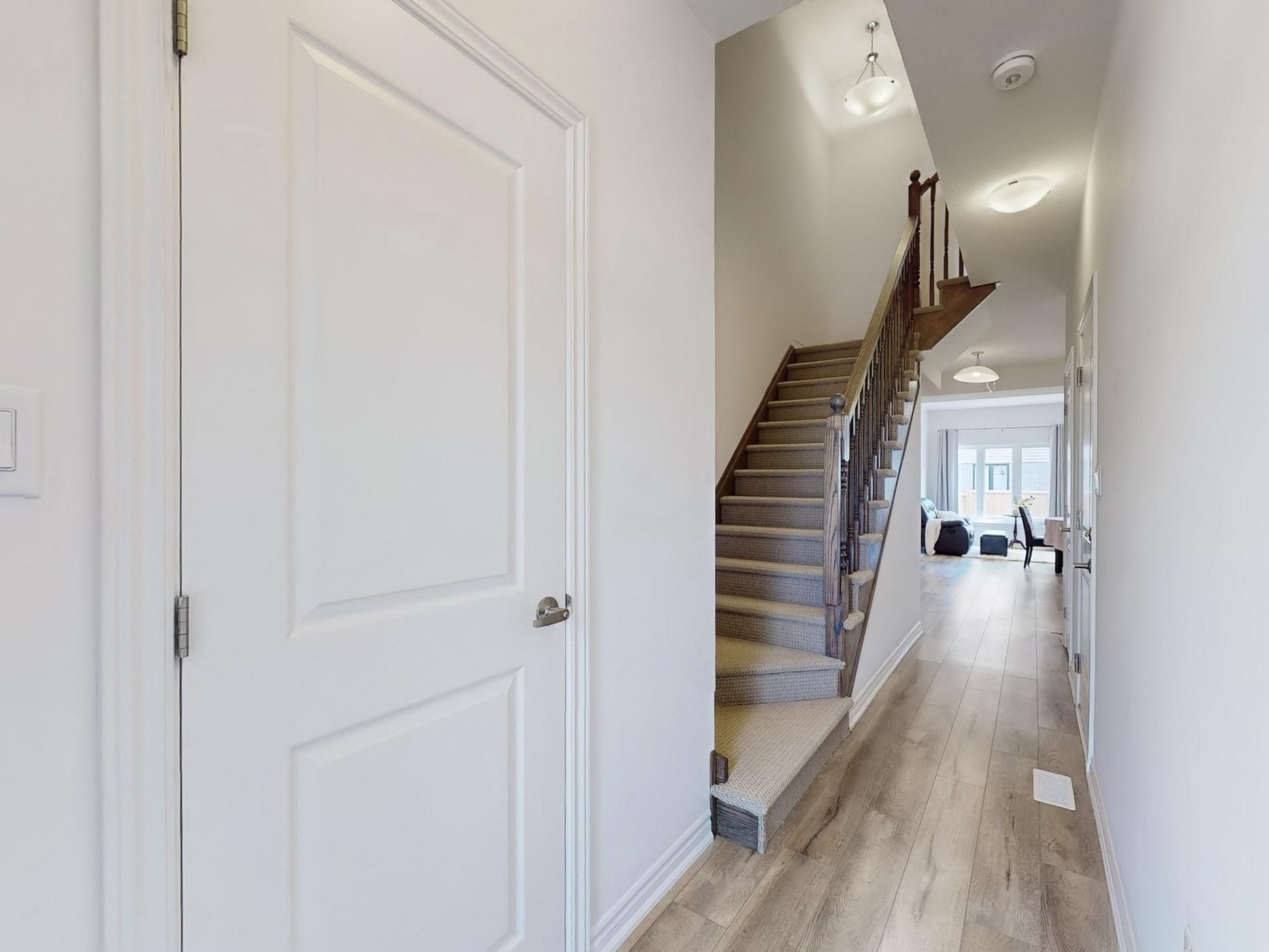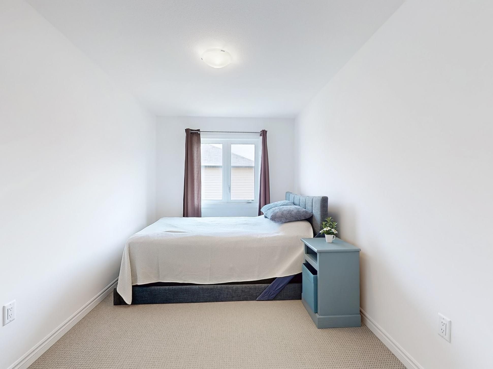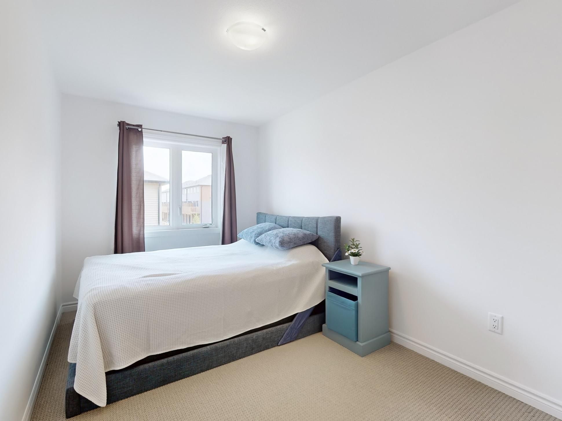 Four-year-new 3+1 bedroom, 4 bathroom townhouse offering an inviting front door with glass insert and keyless entry pad. 9' ceilings and elegant vinyl flooring flow seamlessly throughout the main level. Sun-filled, open-concept living room is flooded with natural light from a large window and patio door leading to the backyard. The kitchen features abundant cabinetry, quartz countertops, double sink, backsplash, valance lighting, stainless steel appliances, and a central island. The main floor offers convenient access to the garage with a garage door opener, as well as a thoughtfully placed powder room. Upstairs, you'll find three generously sized bedrooms. The bright primary suite offers three tall windows, 4-piece ensuite, and walk-in closet. Two additional bedrooms share a 4-piece bathroom. The second bedroom offers a walk-in closet, while the third bedroom features a single closet. Second-floor laundry adds everyday convenience. Finished basement includes a bachelor-style in-law suite, upgraded with extra heat registers, large window, rough-ins for a stove, fridge, and range hood. Spacious 4-piece bathroom with rough-ins for a washer and dryer. All electrical and plumbing work completed by licensed professionals. Conveniently located in a desirable, family-friendly neighbourhood in the west end of brantford. Walking distance to brand new community center with library, indoor swimming pool & elementary school. Minutes to walter gretzky elementary school, st. Basil catholic elementary school, and assumption college school. Close to plazas, walking trail with lakes with legal fishing and parks with playground and splash area.