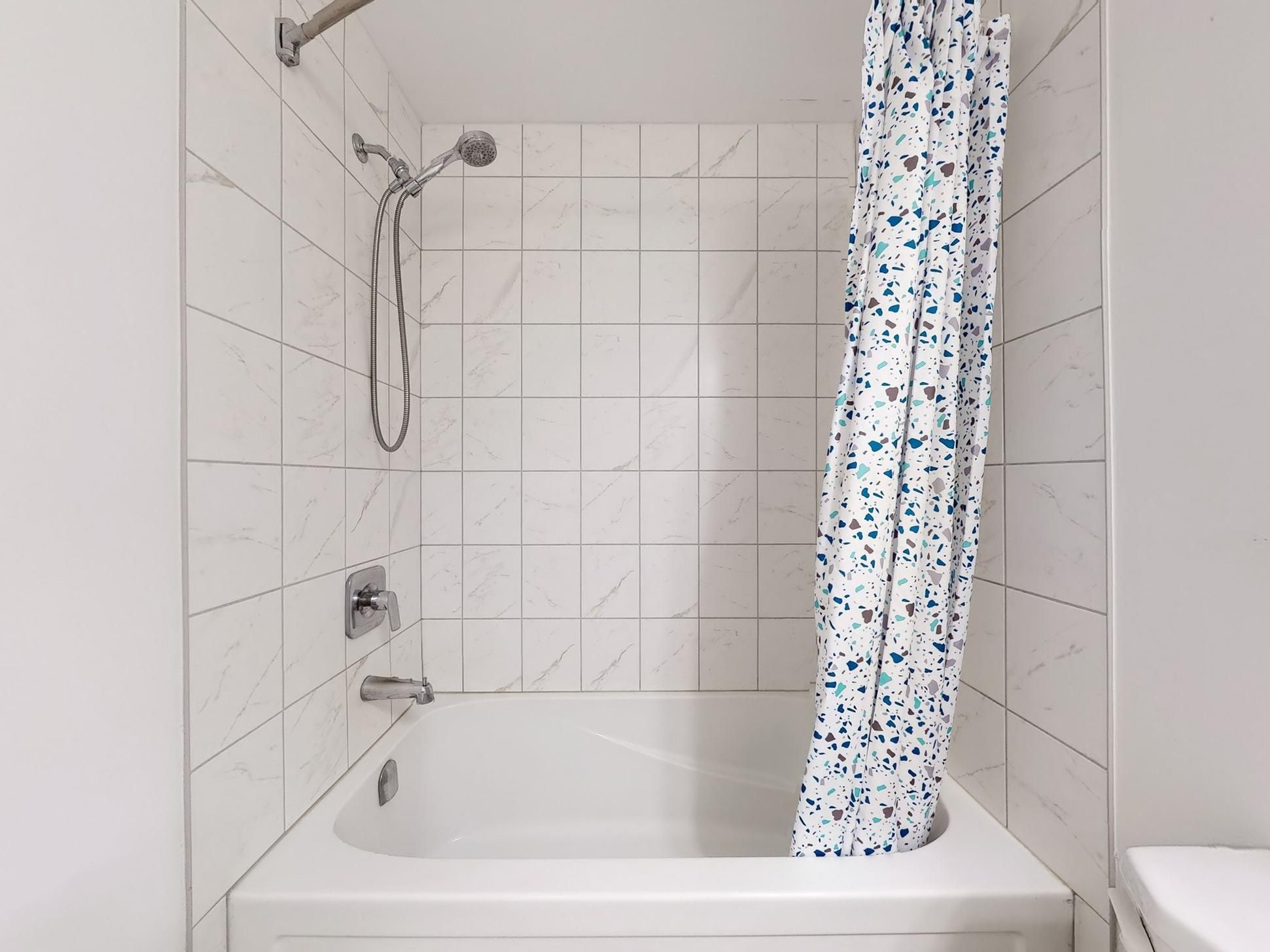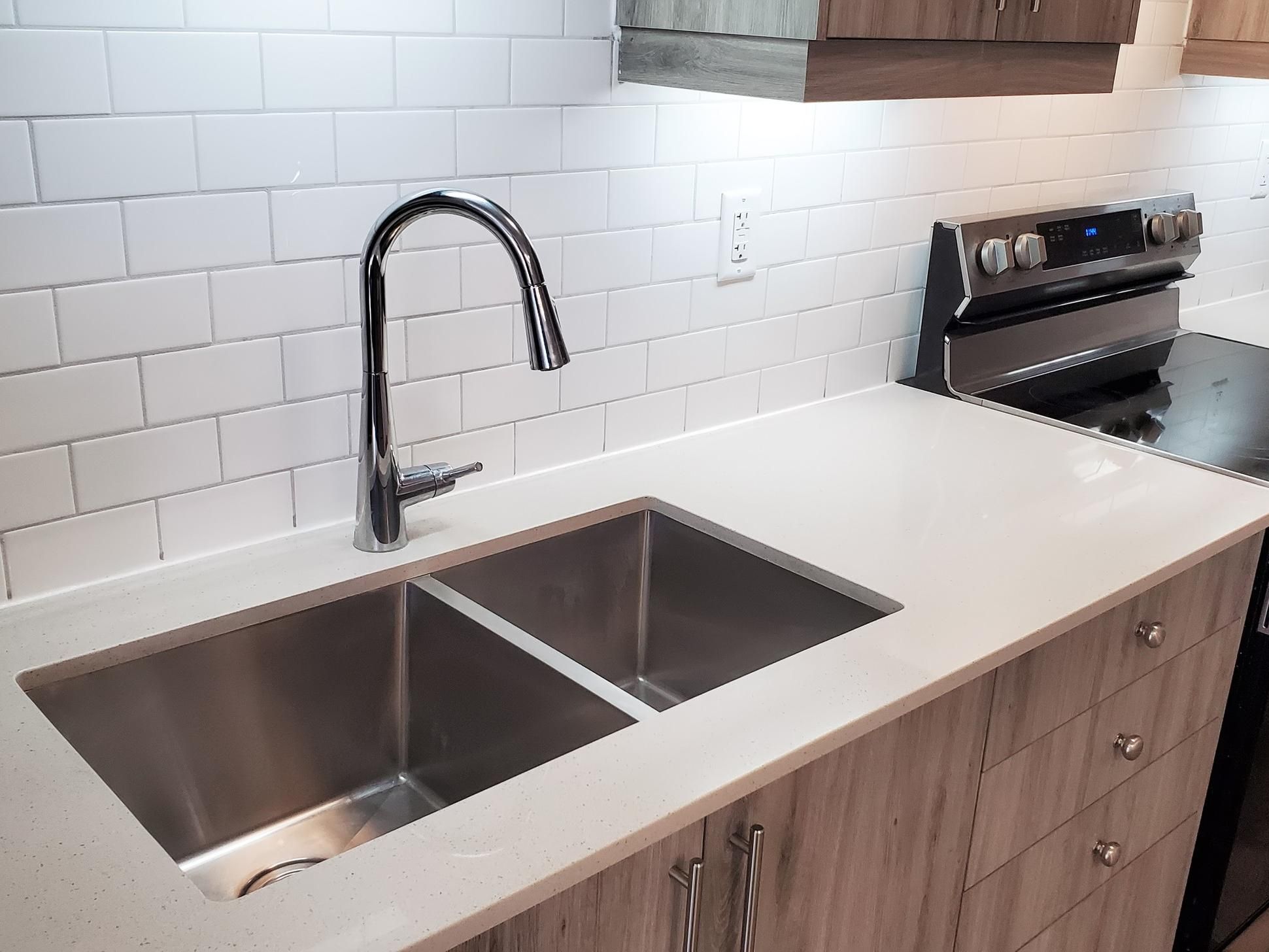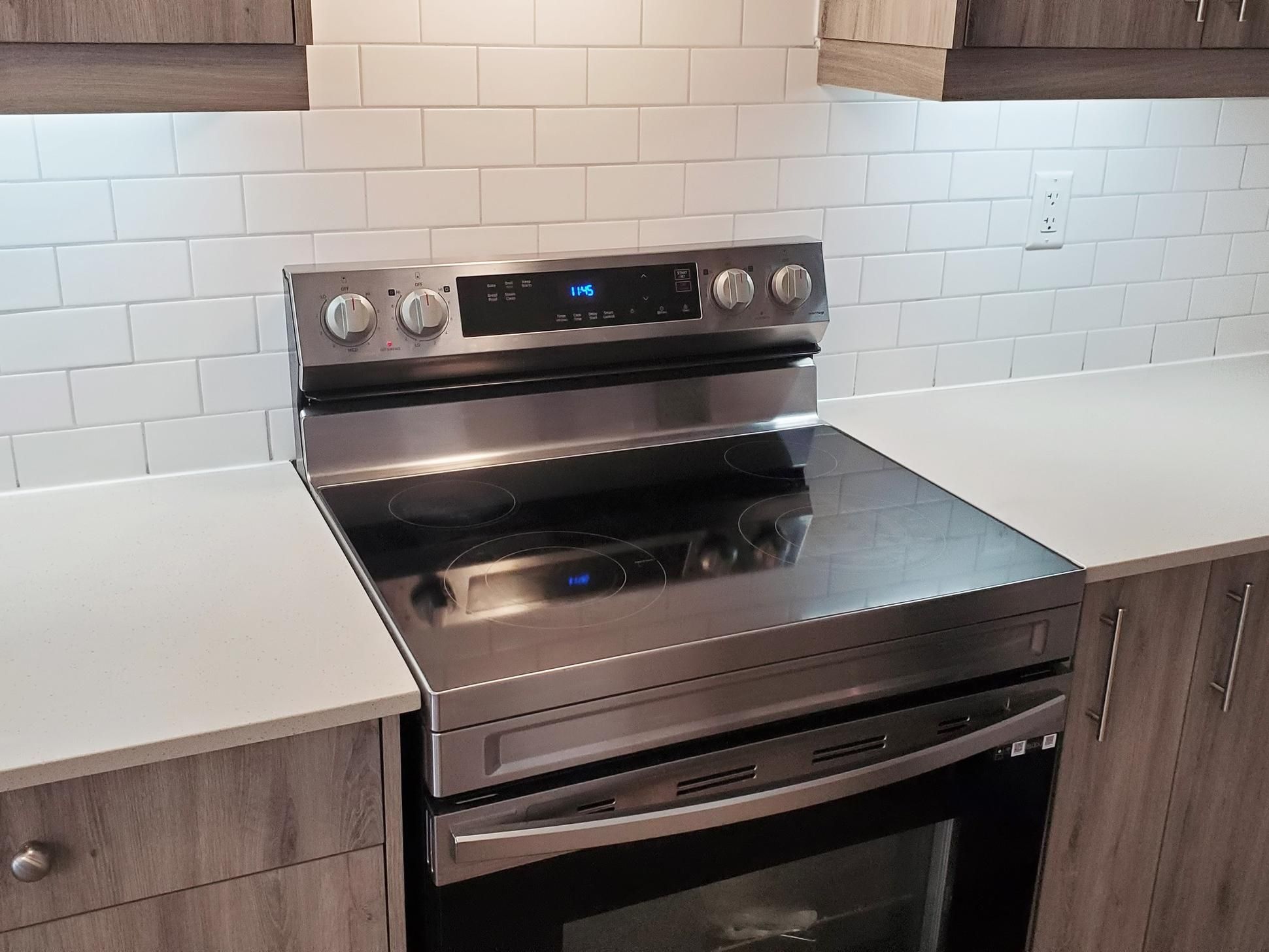 • Stylish kitchen boasts quartz countertops, stainless steel appliances, and an island.