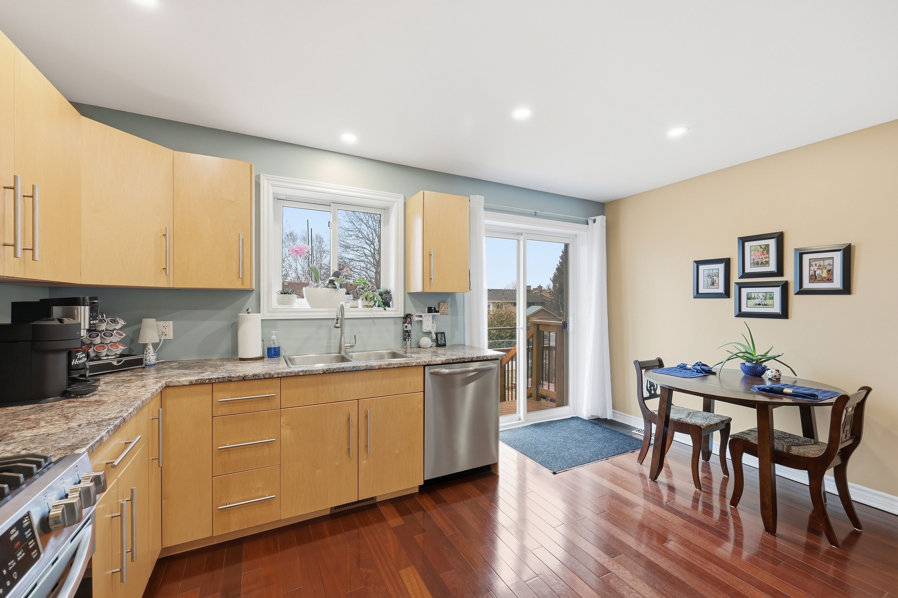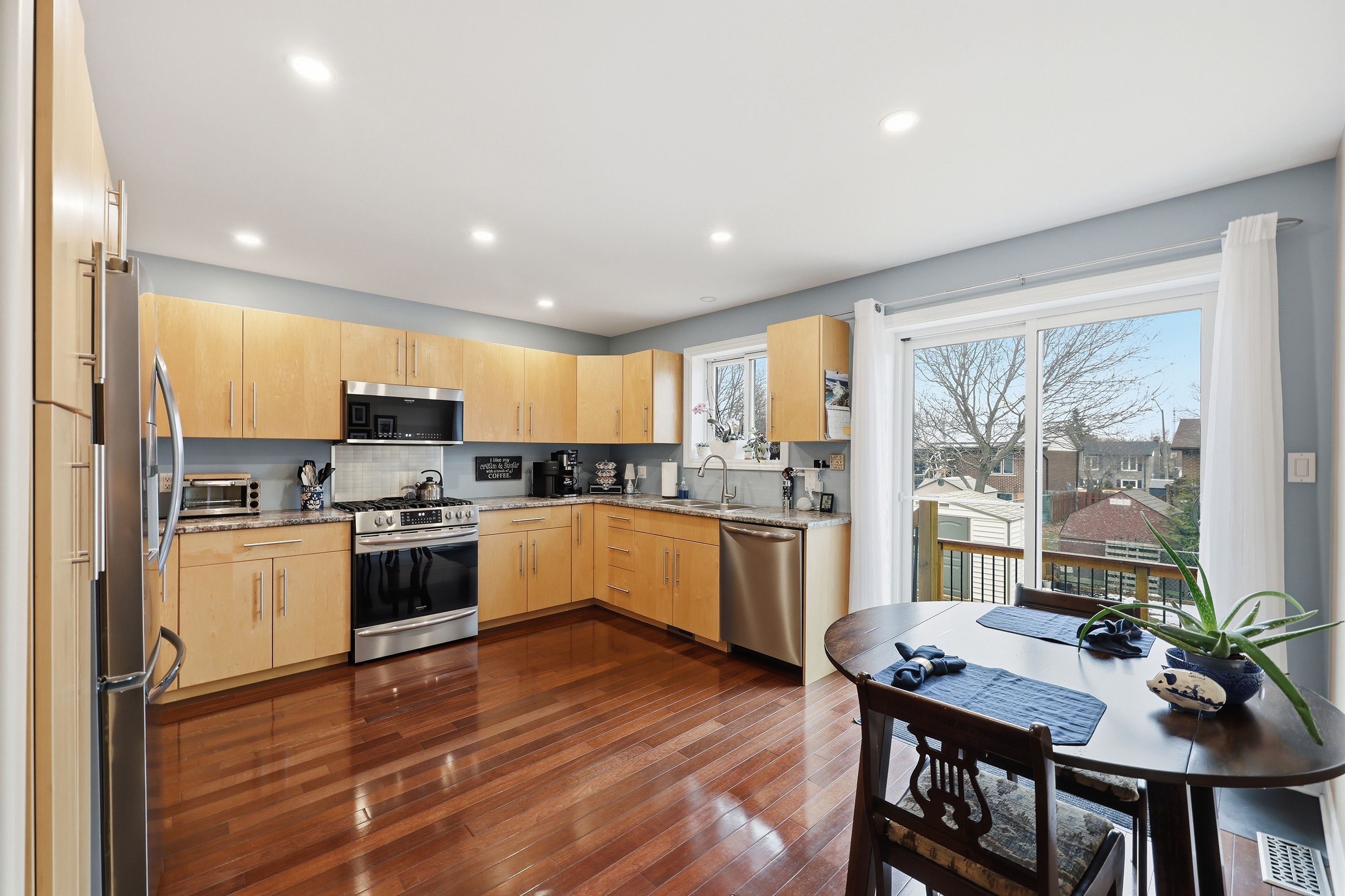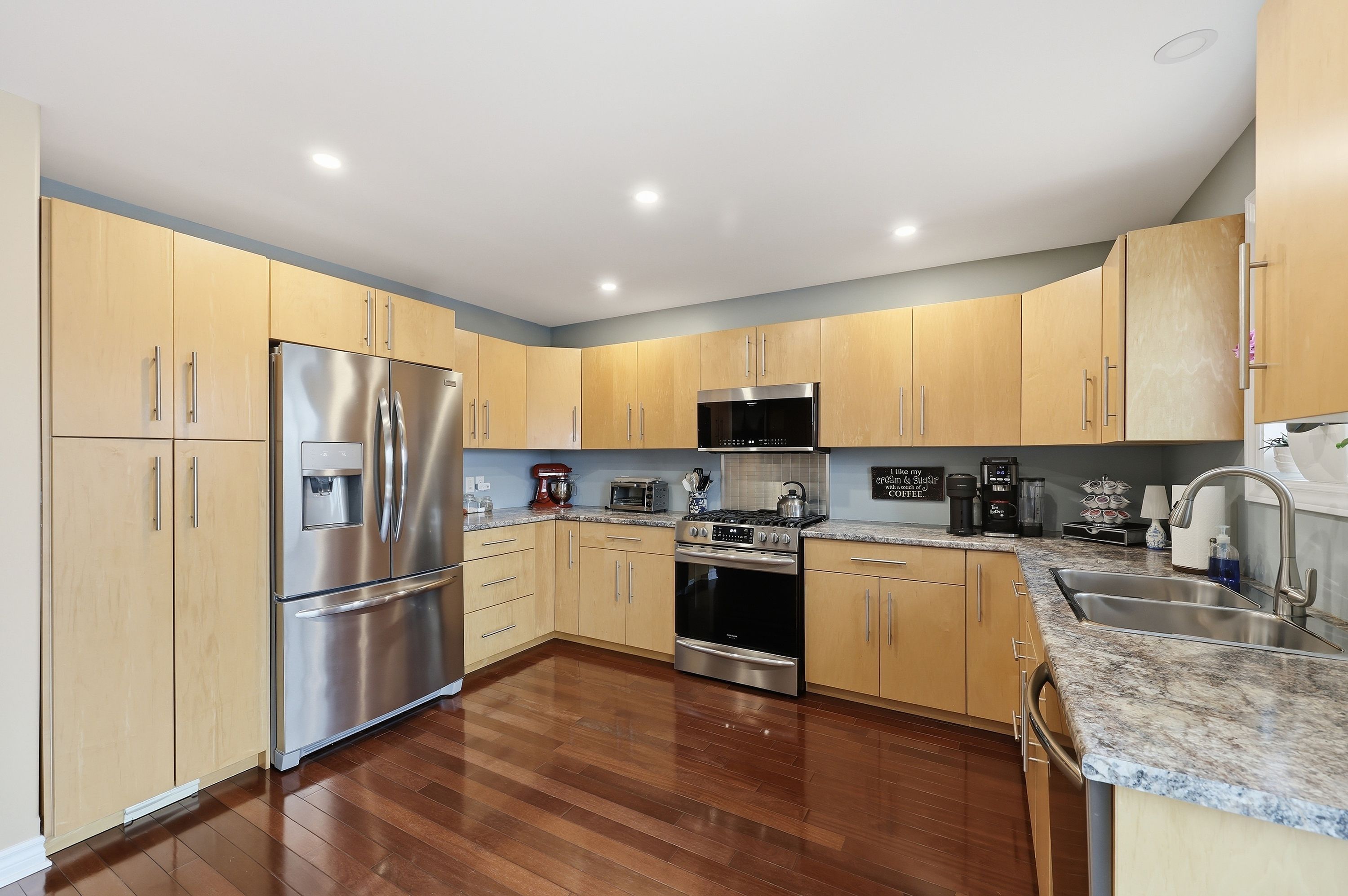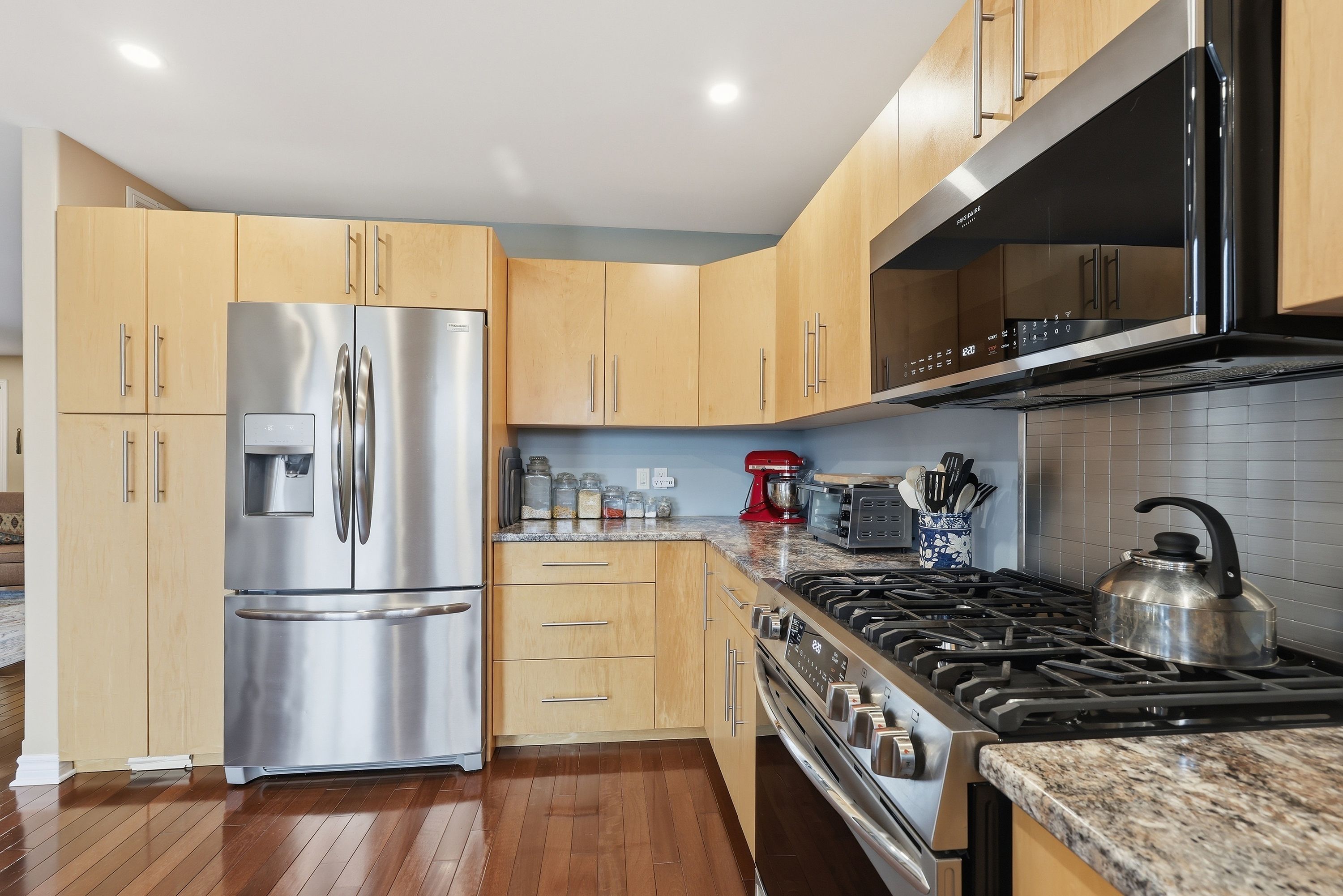• Bright kitchen with ample space, birch cabinetry, and stone countertops.