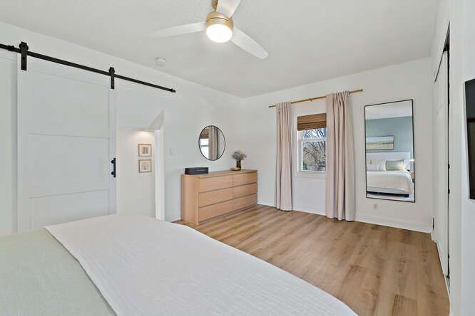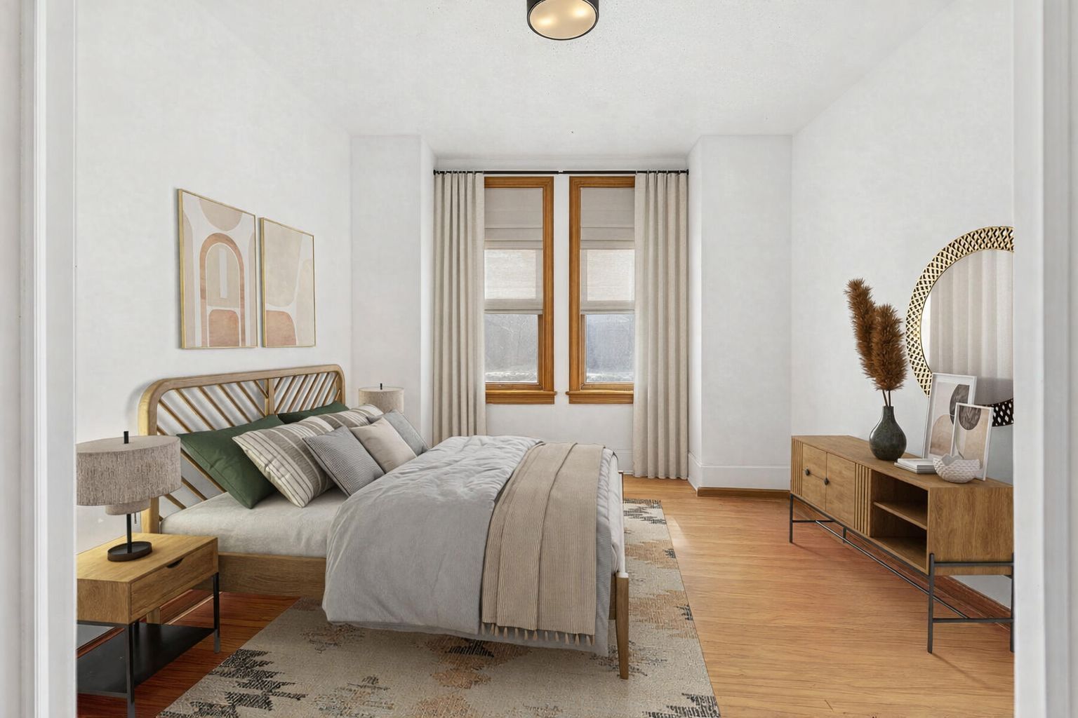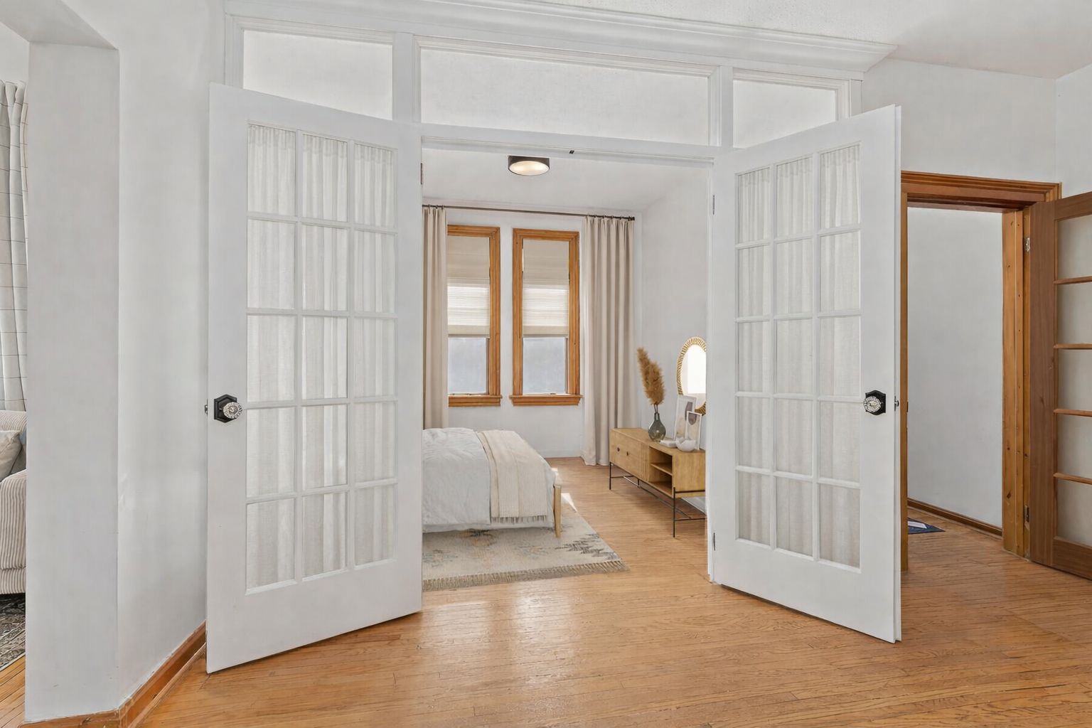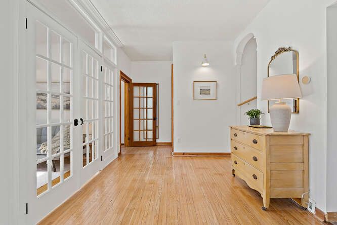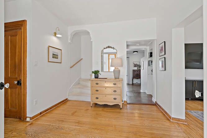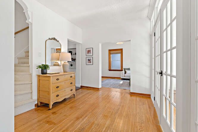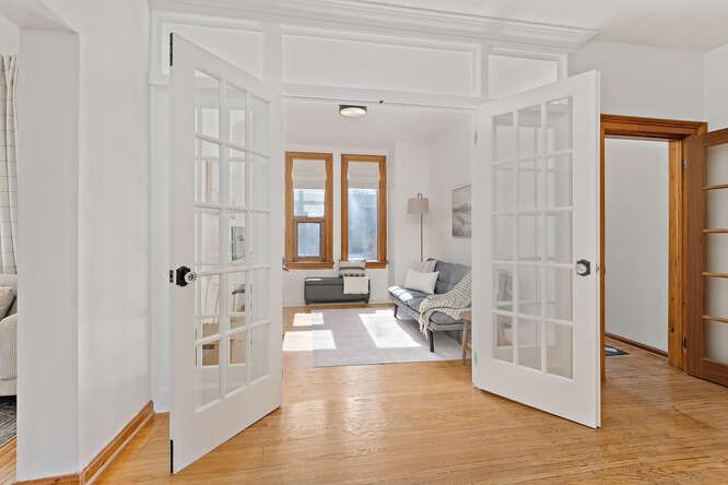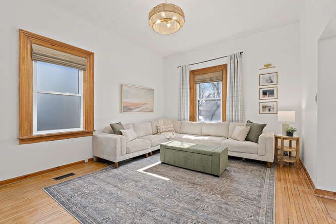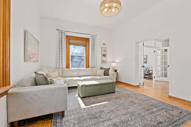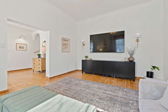 • Stunning living room with 11 ft ceilings and hardwood flooring.