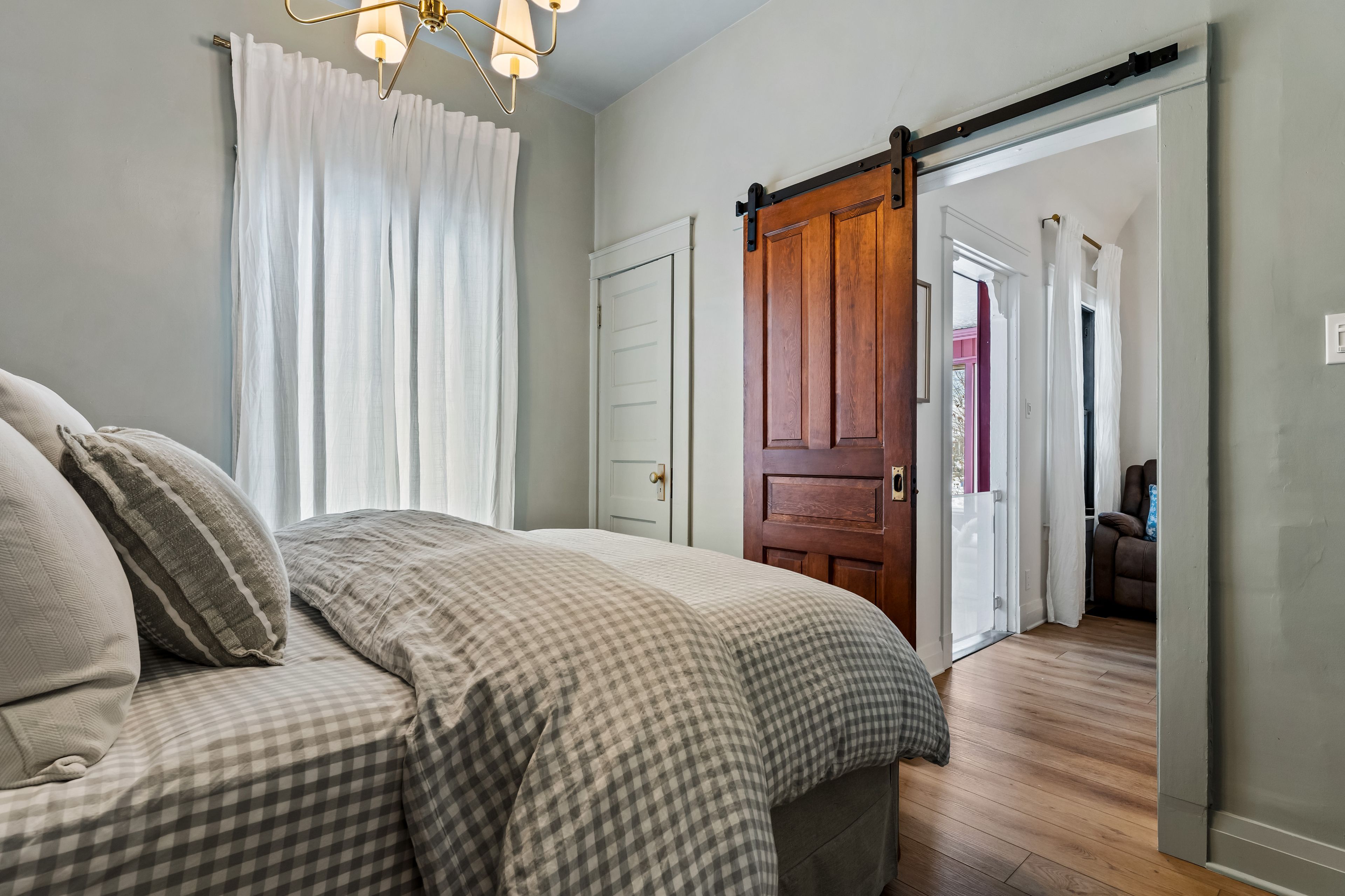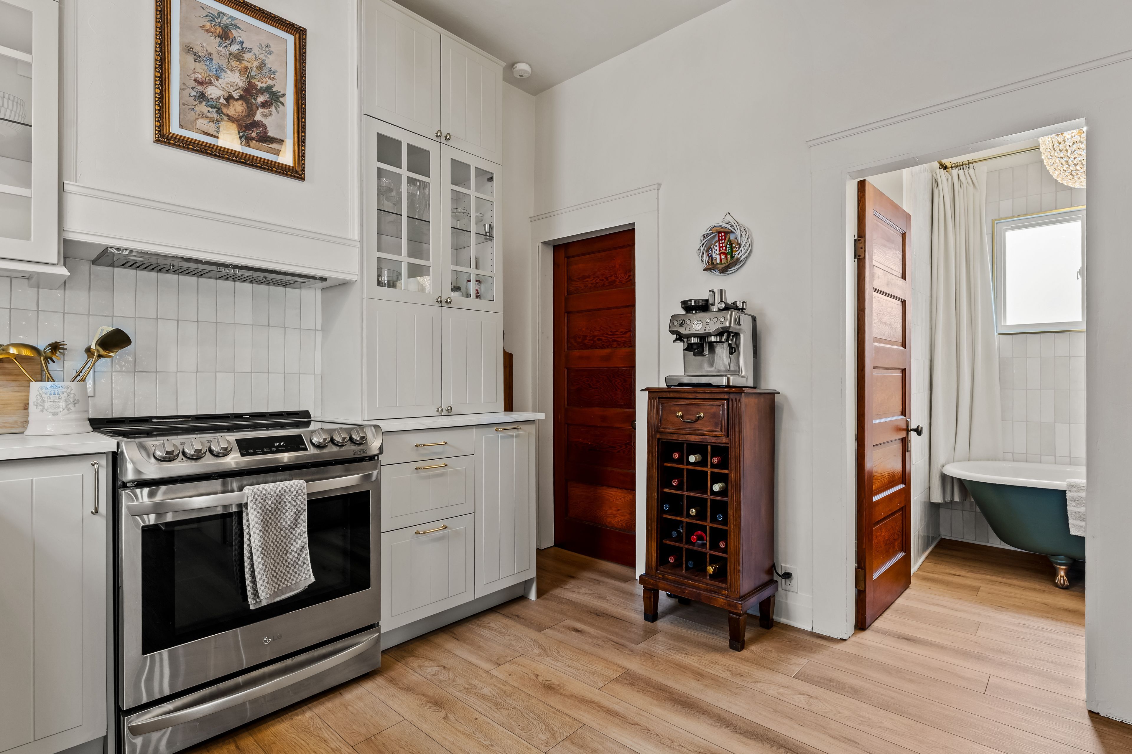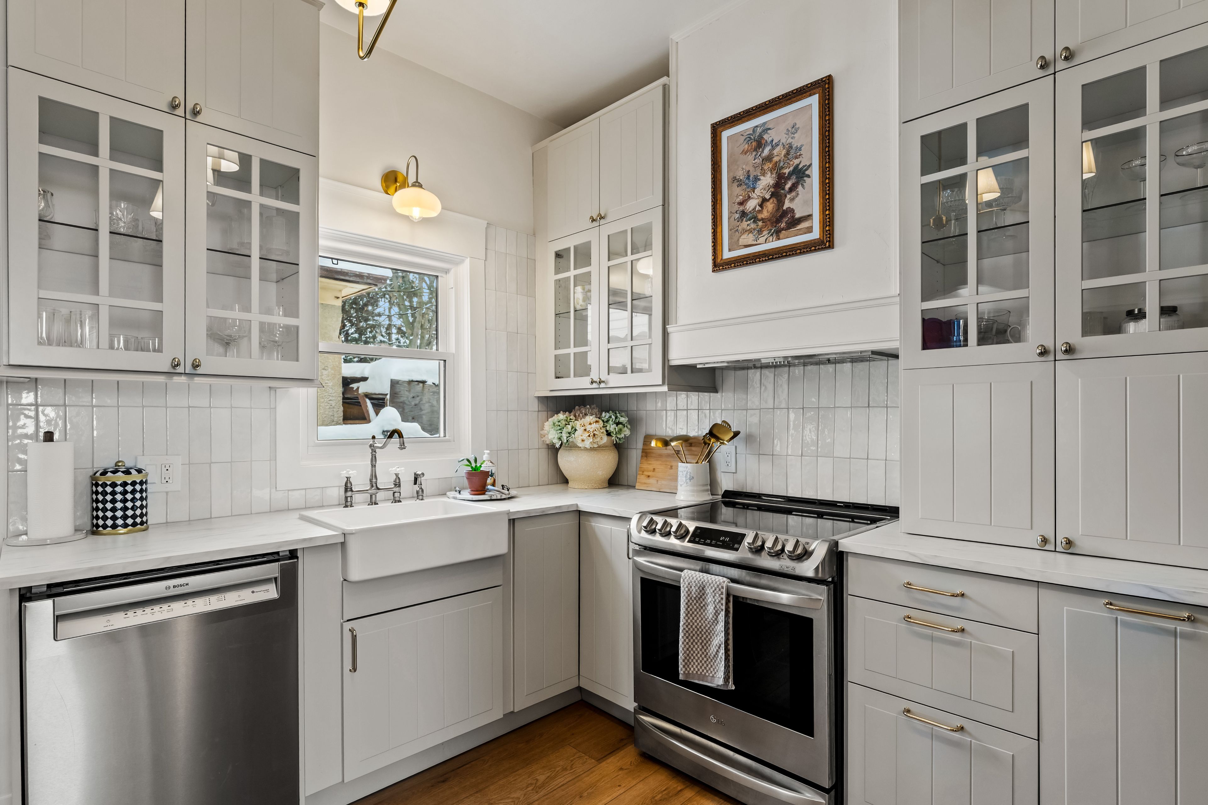 • Bright farmhouse kitchen with stainless appliances and backyard access.