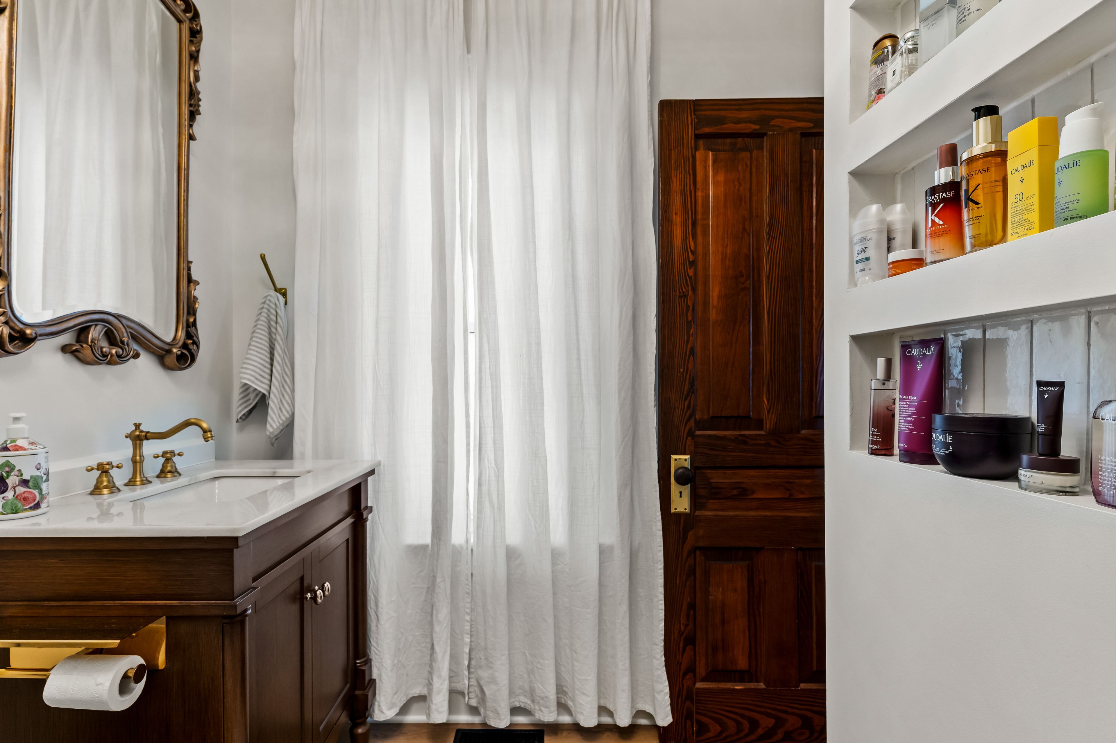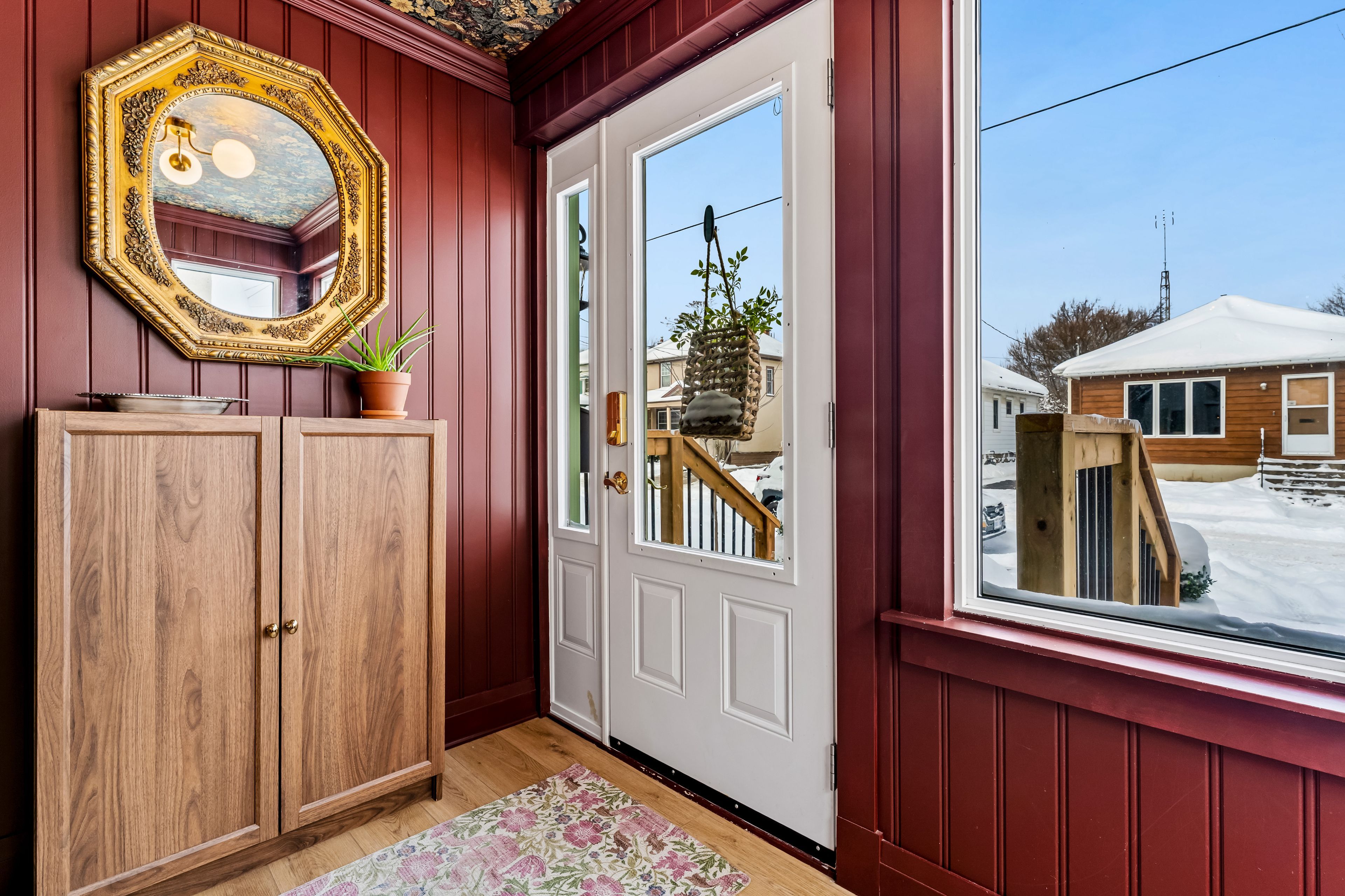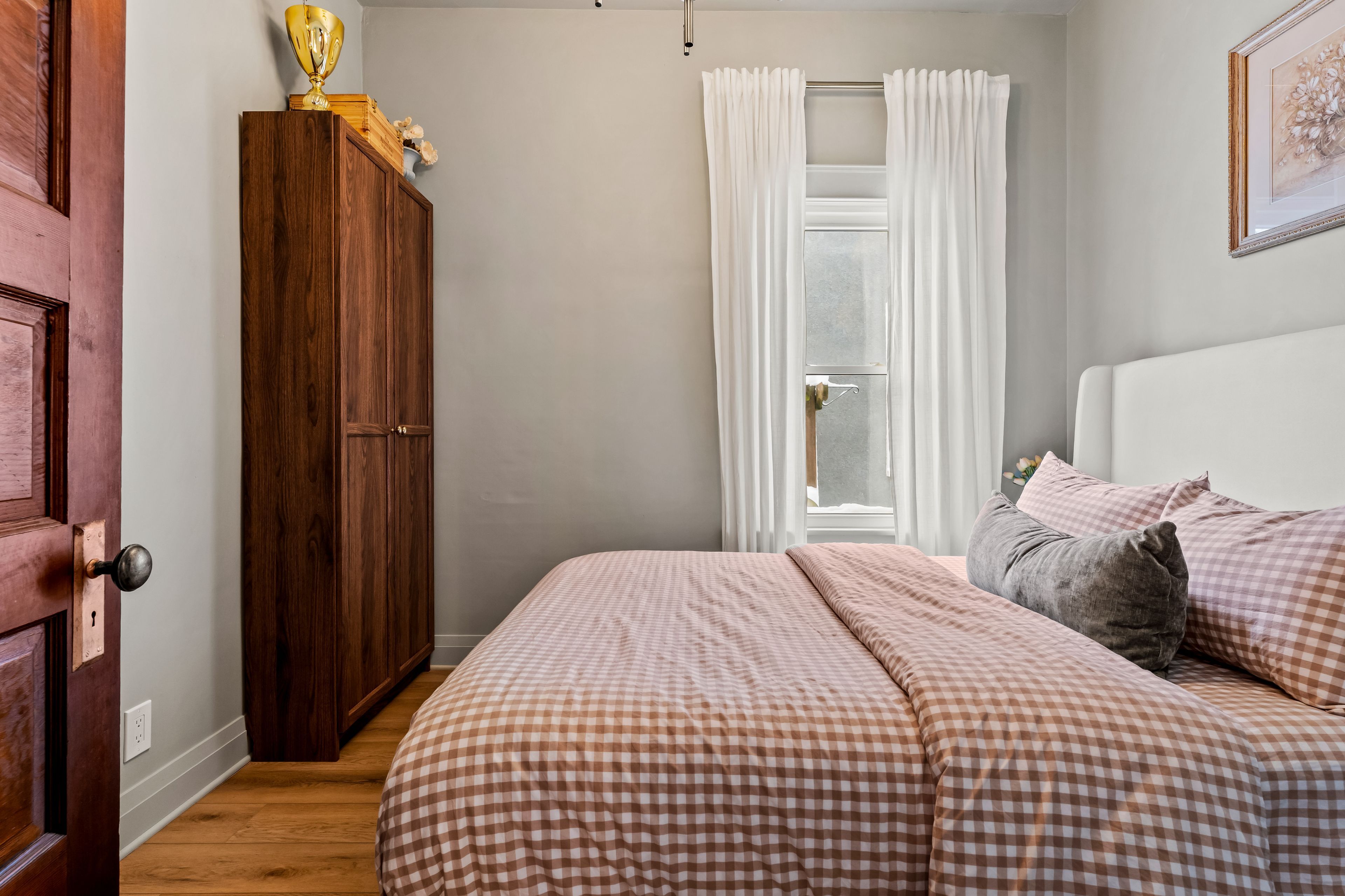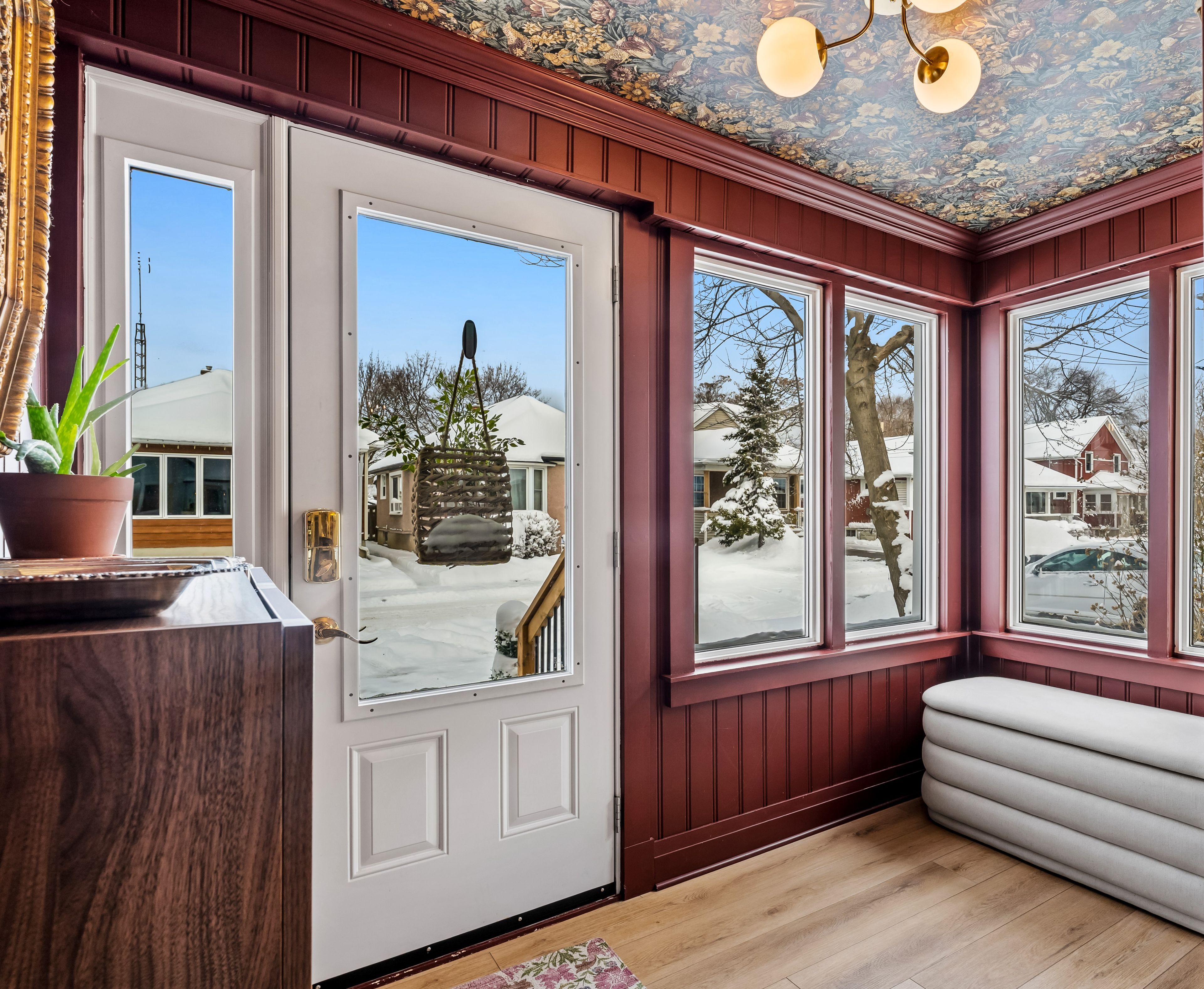 • Bright farmhouse kitchen with stainless appliances and backyard access.