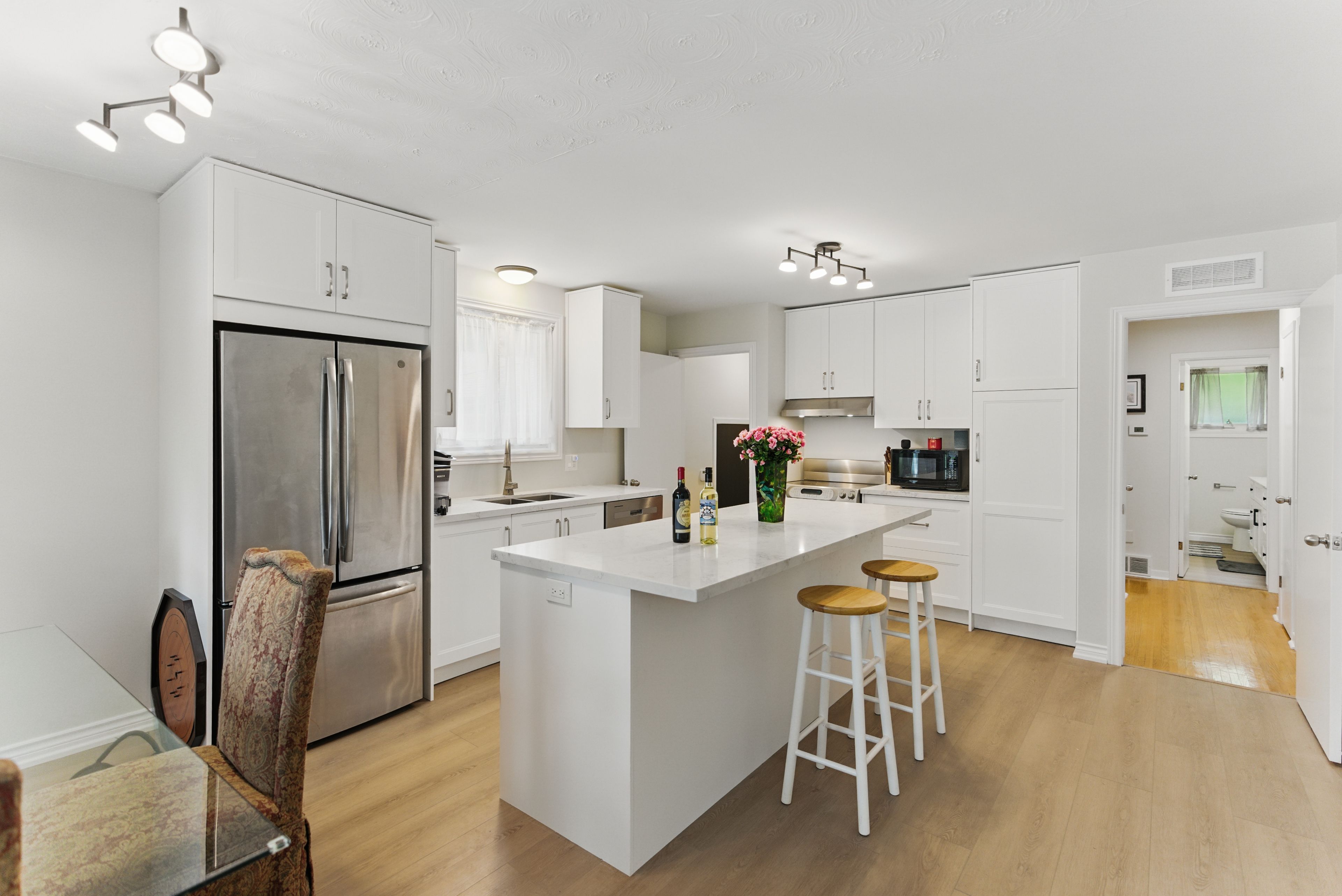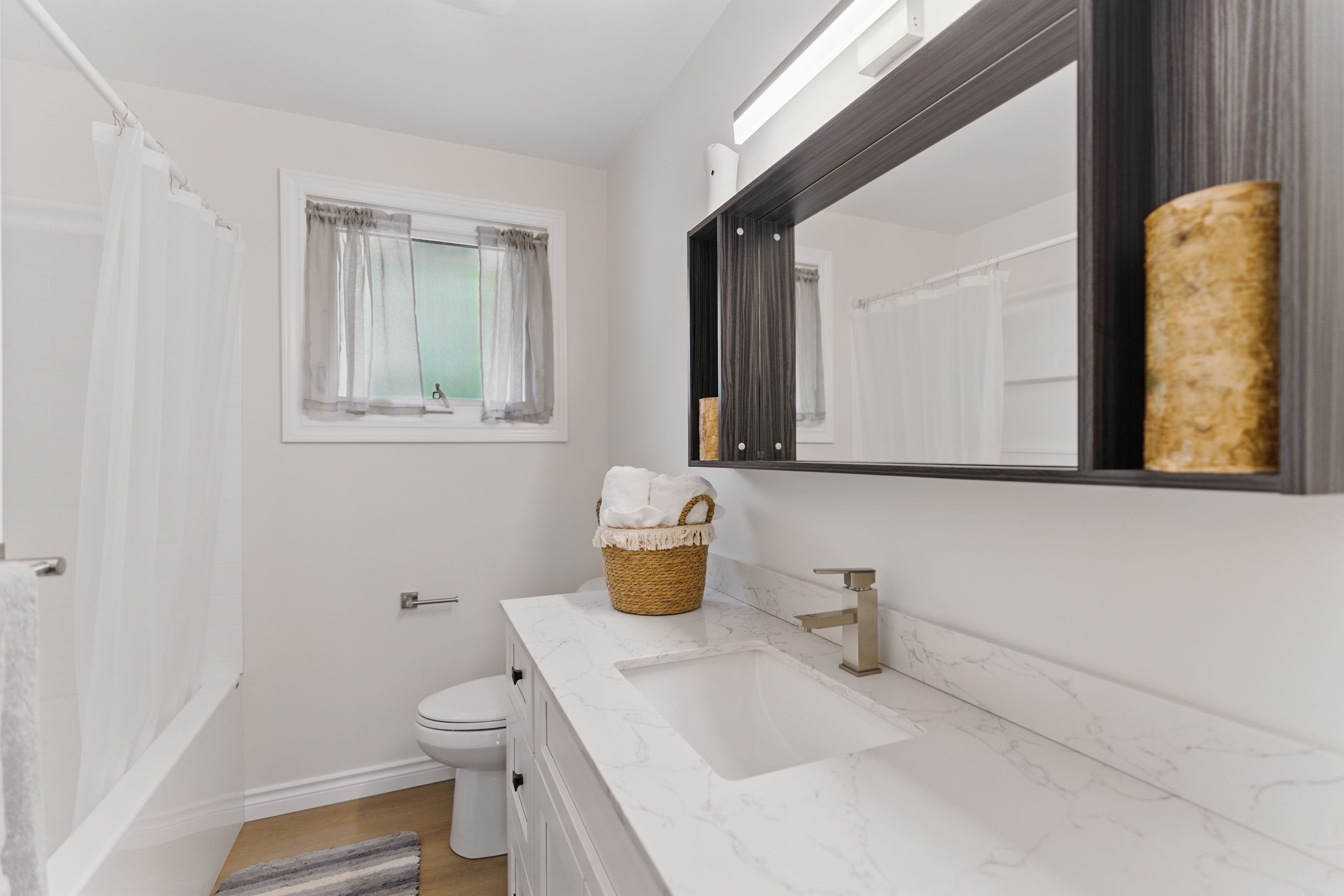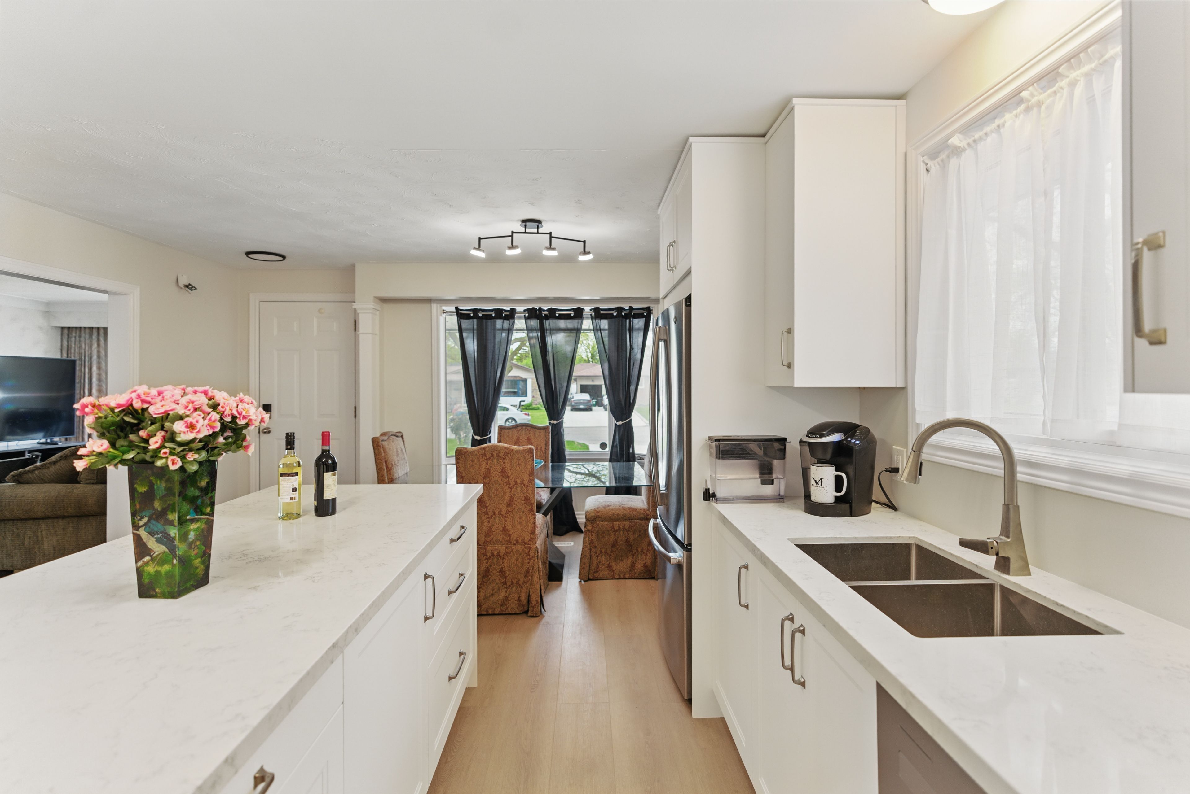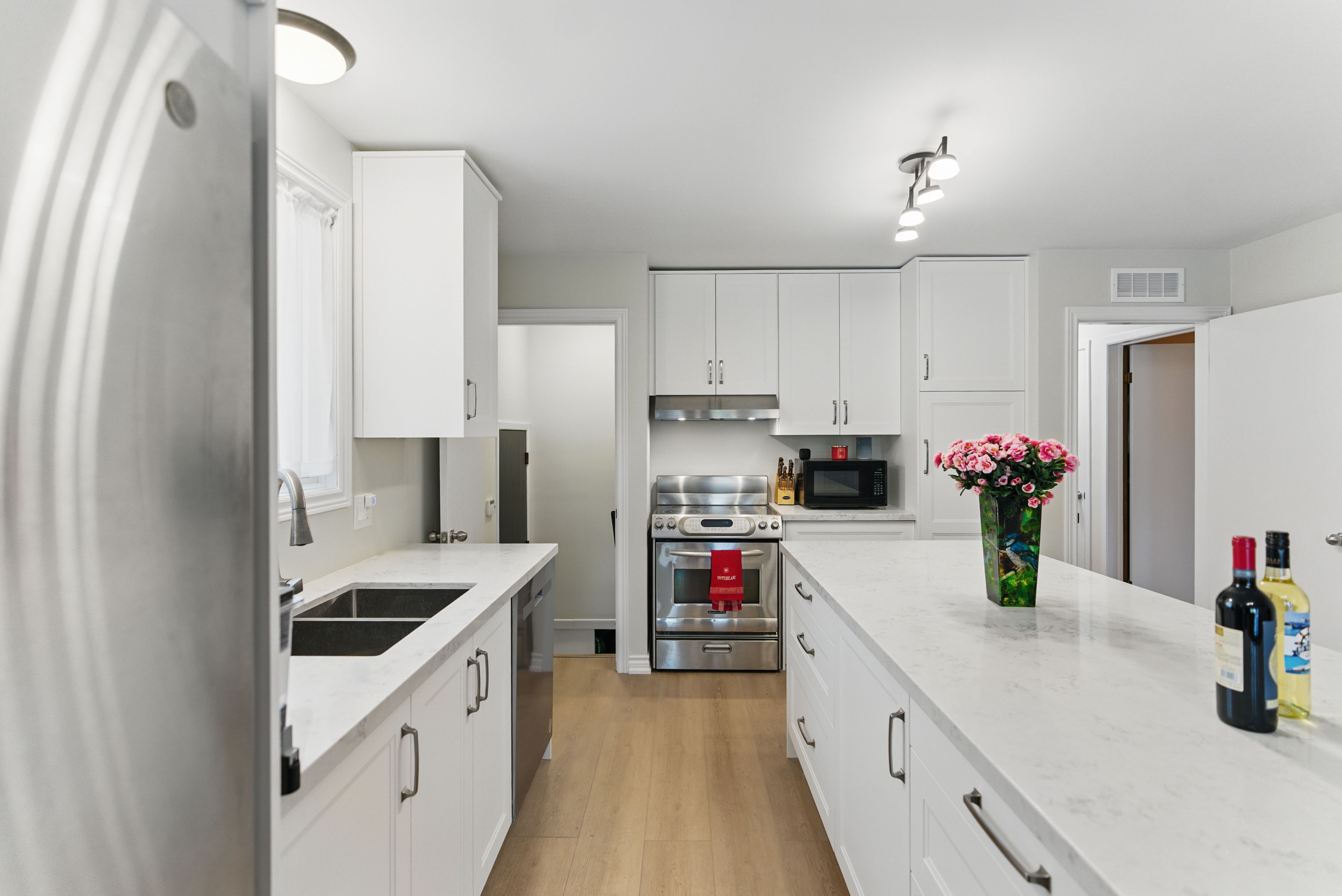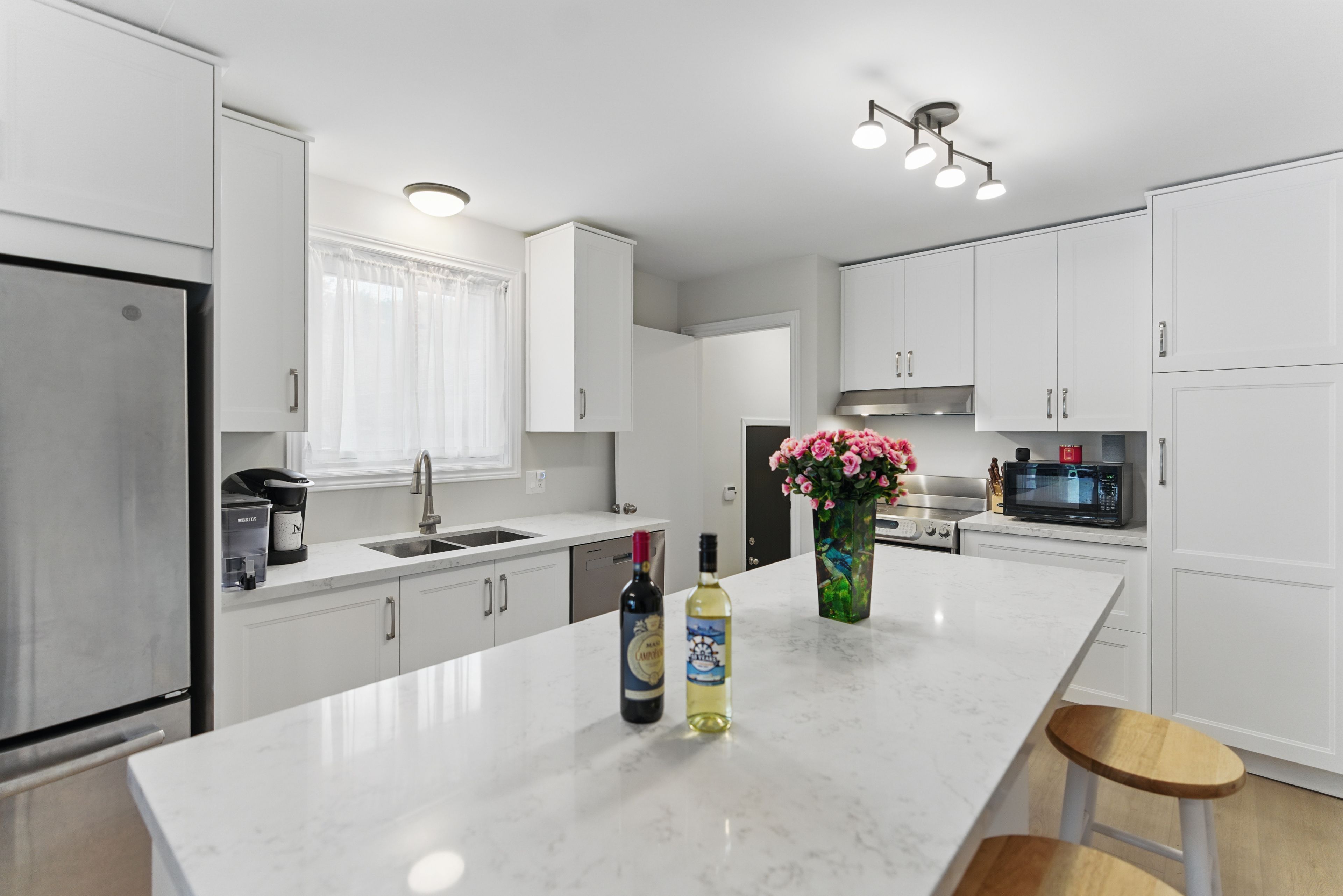 • Stylish kitchen with new cabinets, quartz counters, and stainless-steel appliances.