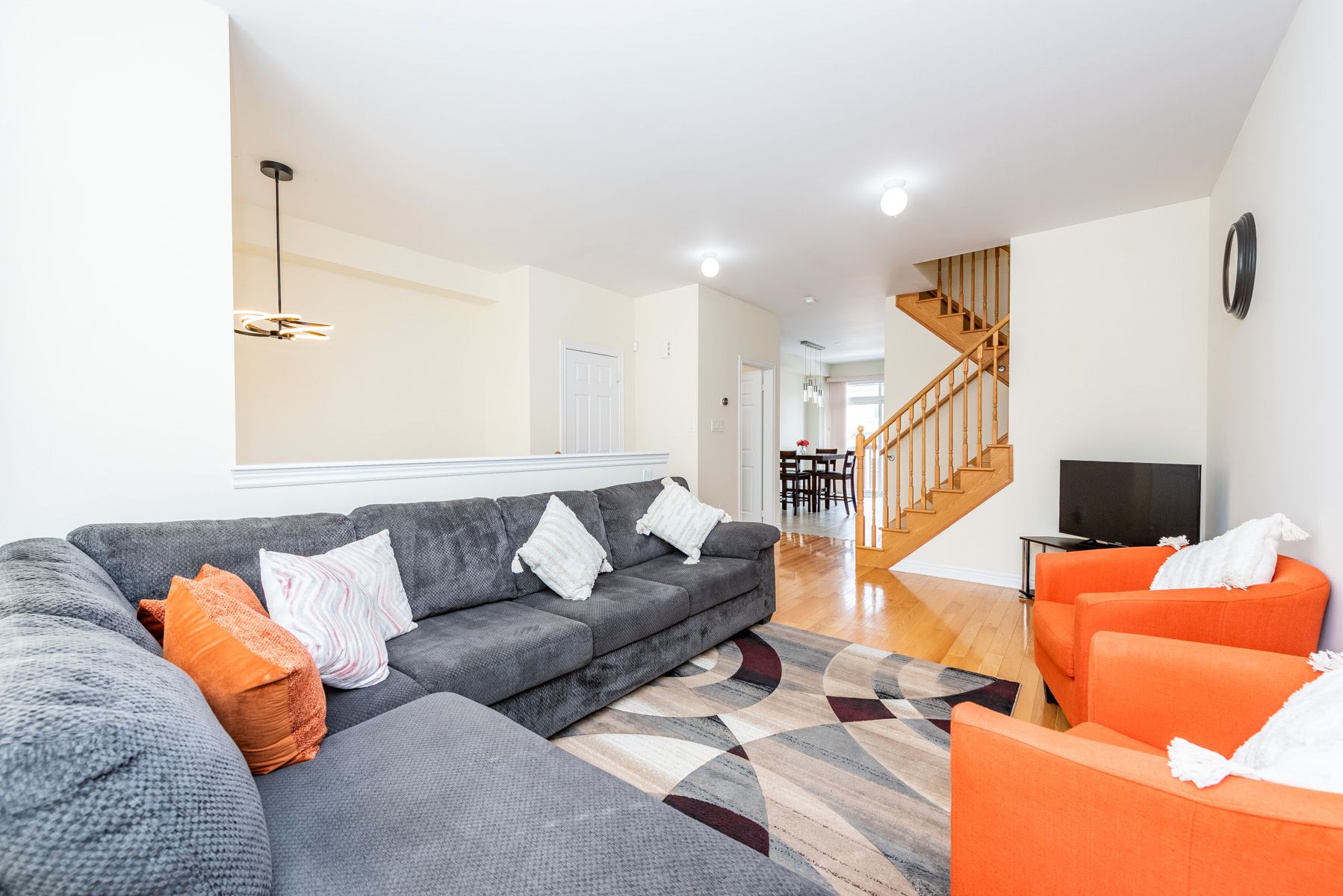 Recently painted,luxurious freehold town house with 3+1 bedrooms and 3 washrooms in highdemand mount pleasant "go" station area. Filled with lots of natural sunlight and a verypractical open concept layout with 9" ft high ceiling and hardwood on main floors. Modernkitchen with granite counters tops/ built-in microwave. Walkout from breakfast to deckoverlooking backyard. Oak stairs leads to huge master and 2 decent sized bedrooms. Finished walkout basement